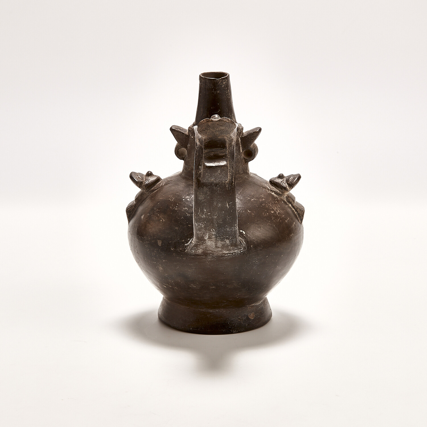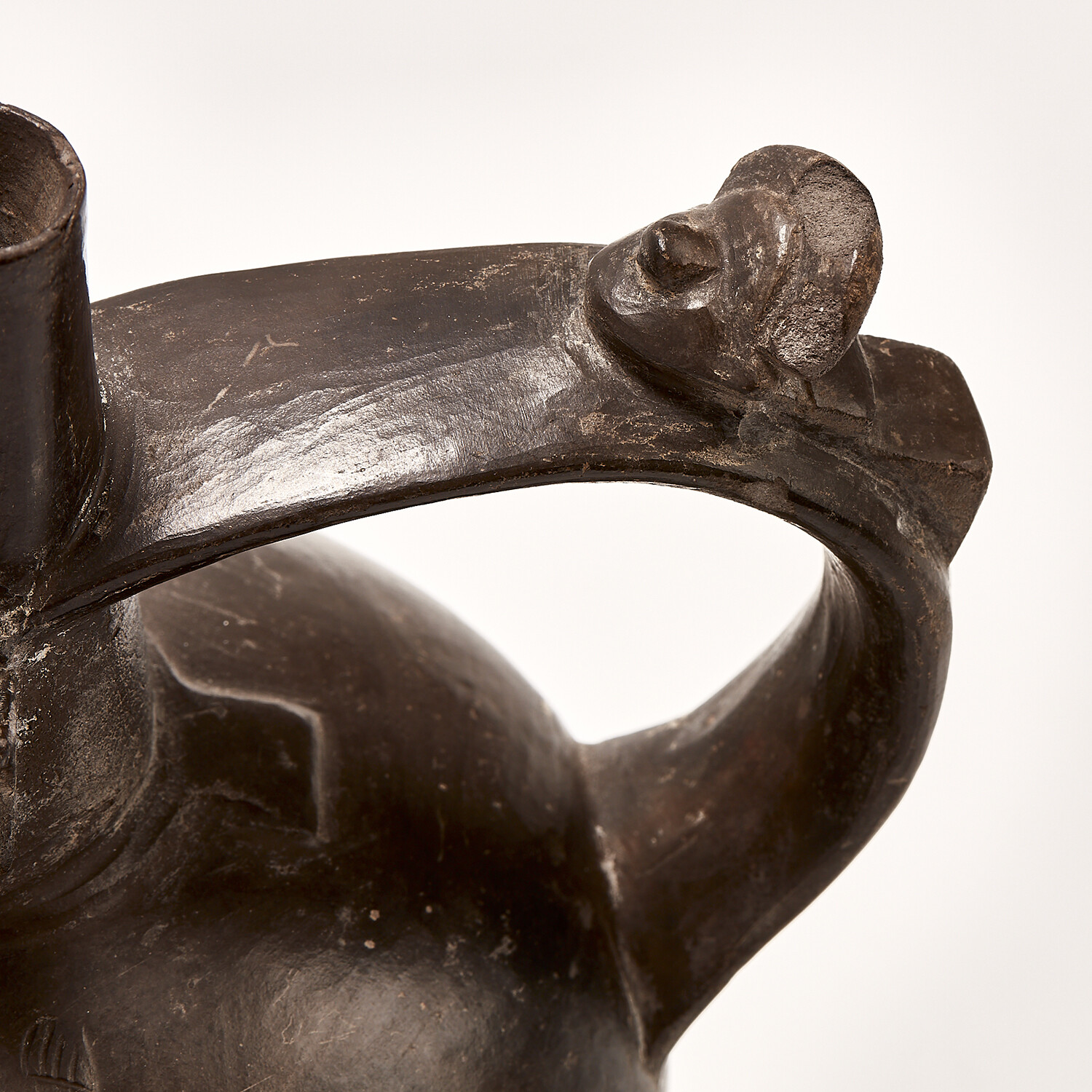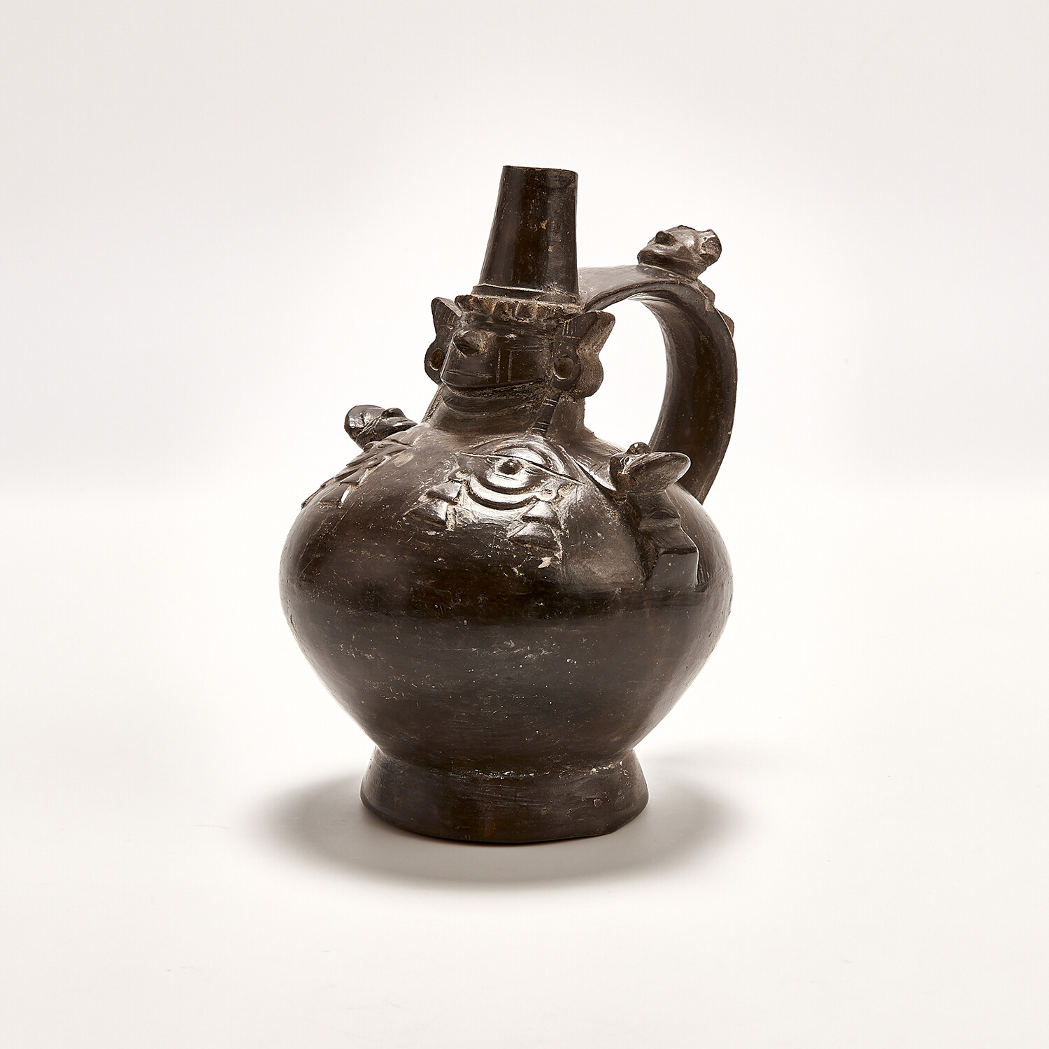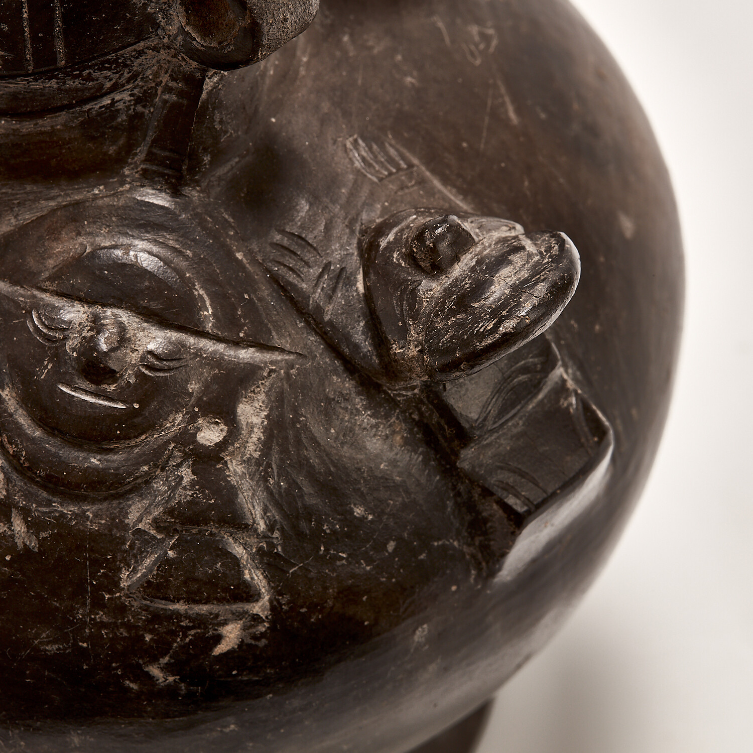 Pre-Columbian, North Coast Peru, Sican / Lambayeque culture, circa 750 to 1375 AD. A wonderful blackware stirrup footed jar. The upper body is adorned with several figures: primarily Naylamp, the traditional hero-founder of the Lambayeque culture, and god of the underworld. Naylamp's head and headdress are displayed beneath the conical spout while an abstract zoomorphic head projects from each of his shoulders, and two additional figures are draped around the front half. Two figures lay prone atop the handle with heads raised above the surface. H: 6.75". Ex New York City private collection. Accompanied by a hand-signed certificate of authenticity which includes all the details, culture, dating, motifs/inscriptions when applicable, historical relevance, and provenance.