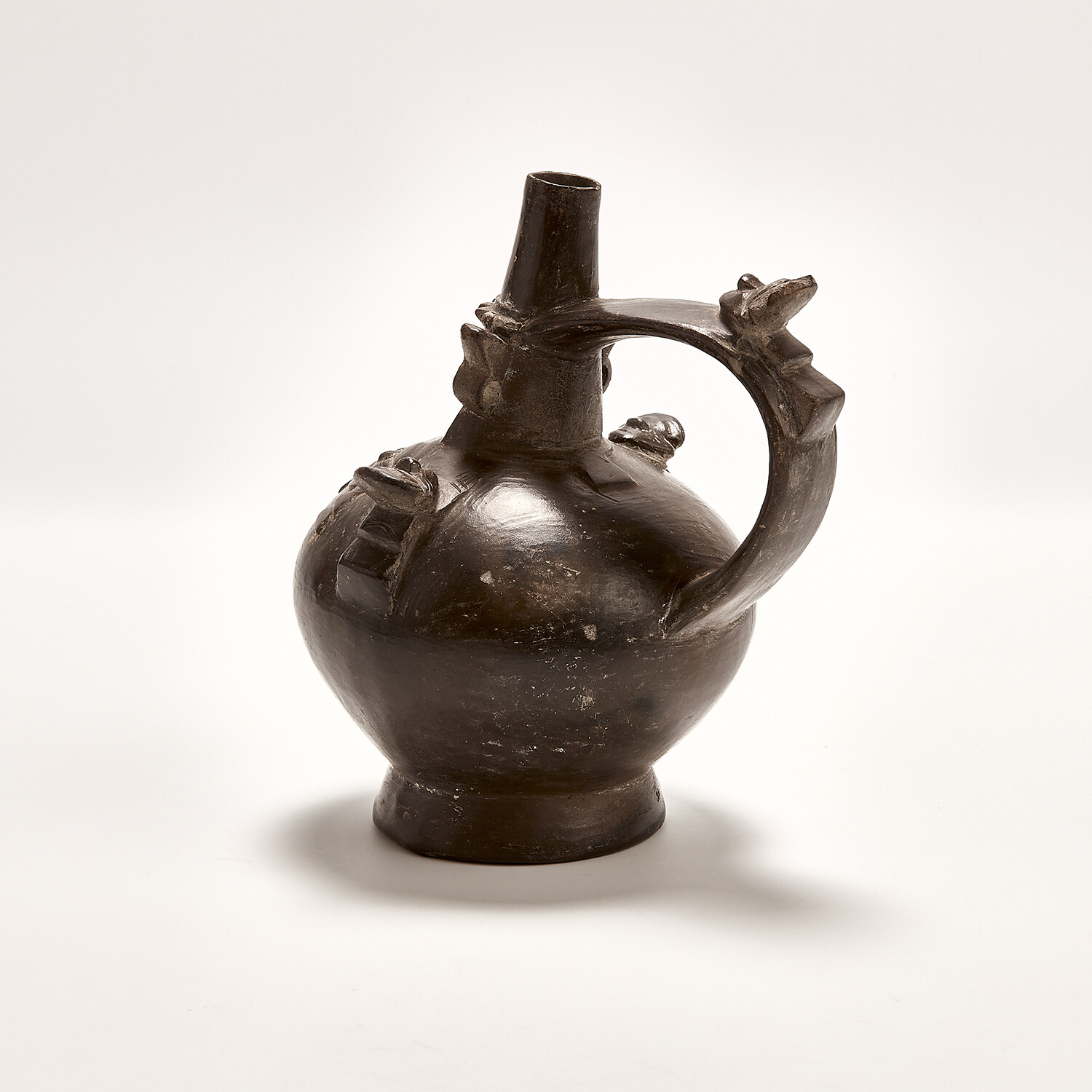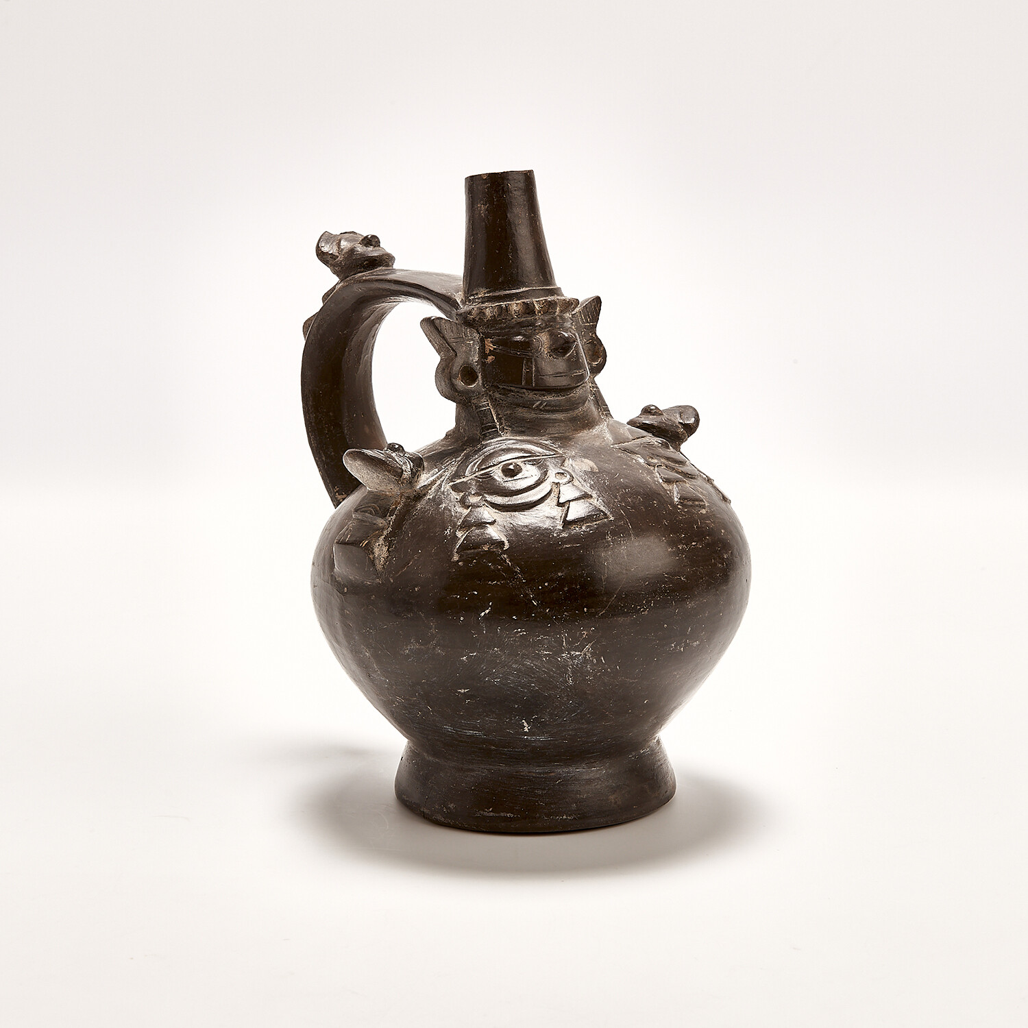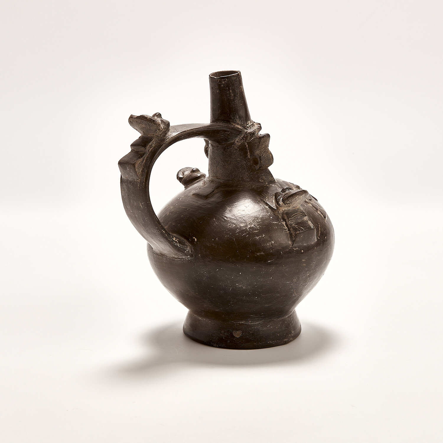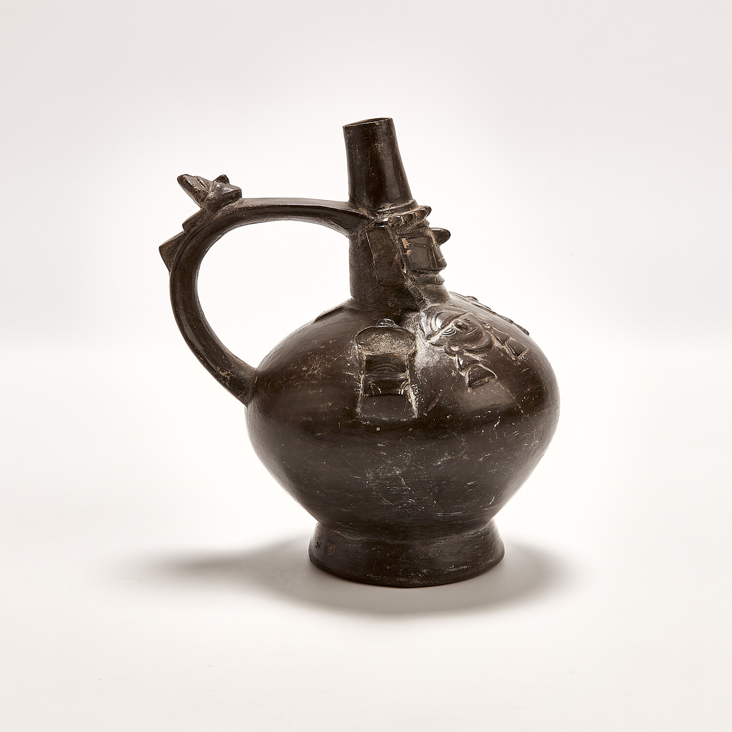Pre-Columbian, North Coast Peru, Sican / Lambayeque culture, circa 750 to 1375 AD. A wonderful blackware stirrup footed jar. The upper body is adorned with several figures: primarily Naylamp, the traditional hero-founder of the Lambayeque culture, and god of the underworld. Naylamp's head and headdress are displayed beneath the conical spout while an abstract zoomorphic head projects from each of his shoulders, and two additional figures are draped around the front half. Two figures lay prone atop the handle with heads raised above the surface. H: 6.75". Ex New York City private collection. Accompanied by a hand-signed certificate of authenticity which includes all the details, culture, dating, motifs/inscriptions when applicable, historical relevance, and provenance.