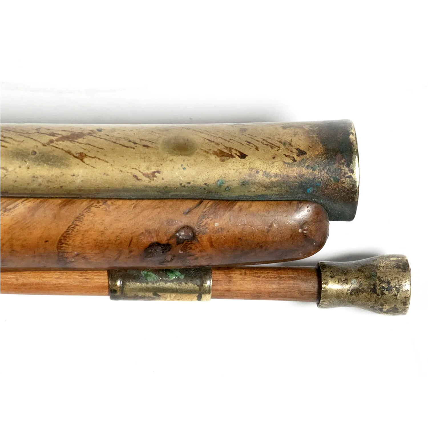An excellent British bronze-barreled flintlock pistol made in the early 1800’s and converted to a percussion lock system shortly thereafter. The gun features an octagonal to round barrel with "London" engraved on the top flat and two British proof marks to the left. The original firing system has been replaced with a cast bronze lock plate supporting a steel hammer. The bore shows green oxidization throughout and there is heavy fouling at the muzzle. Overall in very nice condition with some damage commensurate with age. Total length 16.25”. Hammer still holds at half and full cock with strong action. This is an antique and not warranted safe to shoot and it should not be attempted without the aid of an expert. It definitely has a great "pirate" vibe... an excellent addition to any collection! Ex Thomaston, ME private weapons collection. Accompanied by a hand-signed certificate of authenticity which includes all the details, culture, dating, motifs/inscriptions when applicable, historical relevance, and provenance.