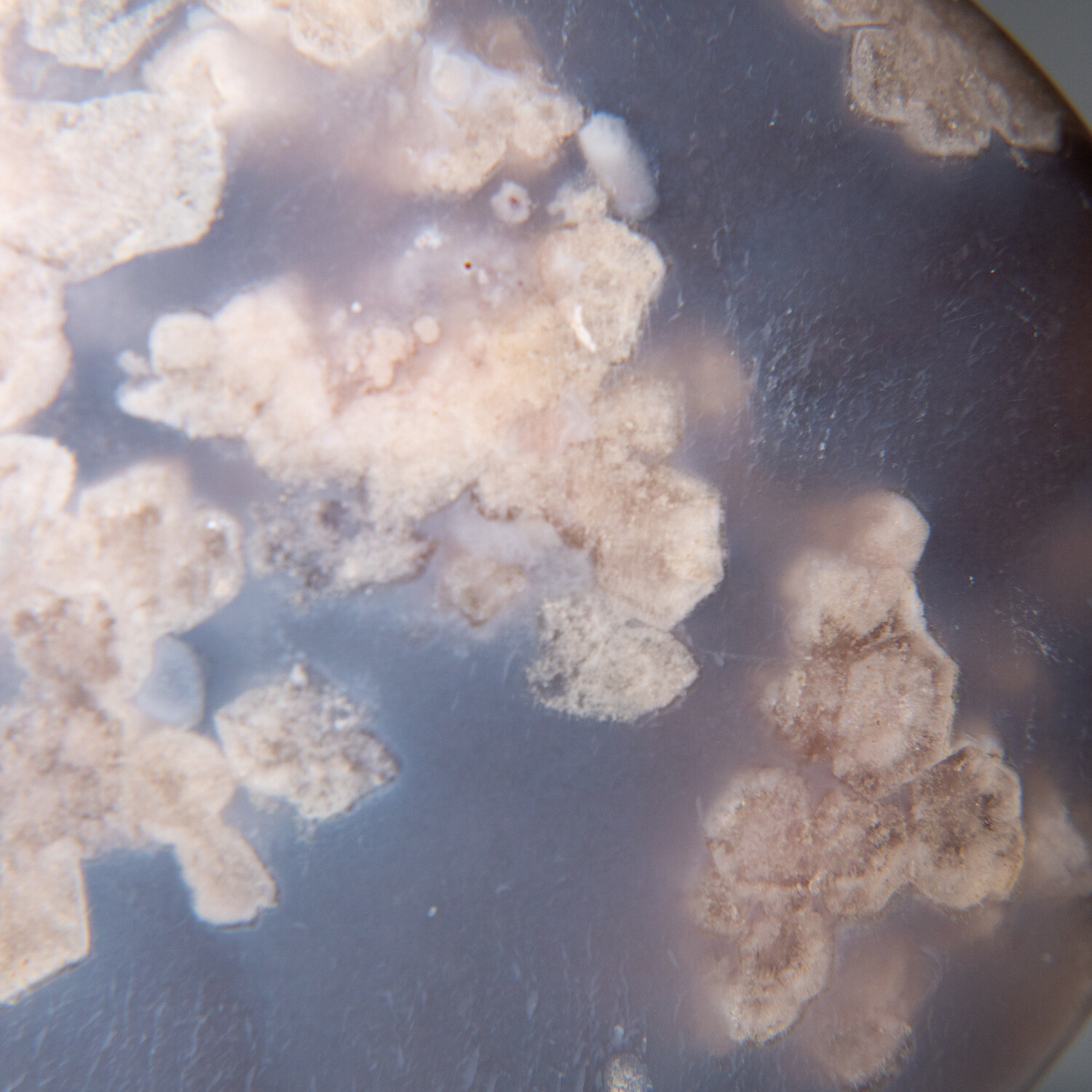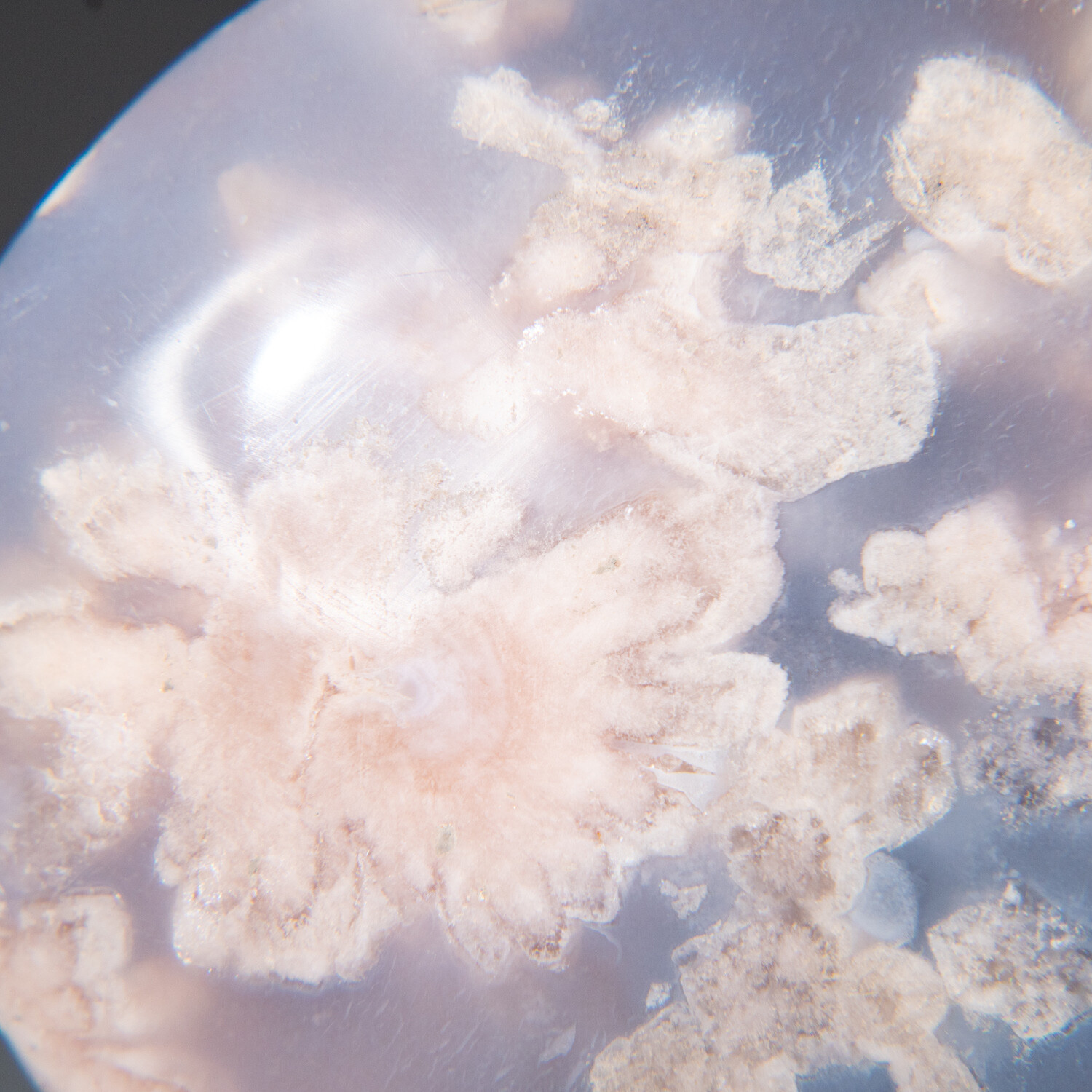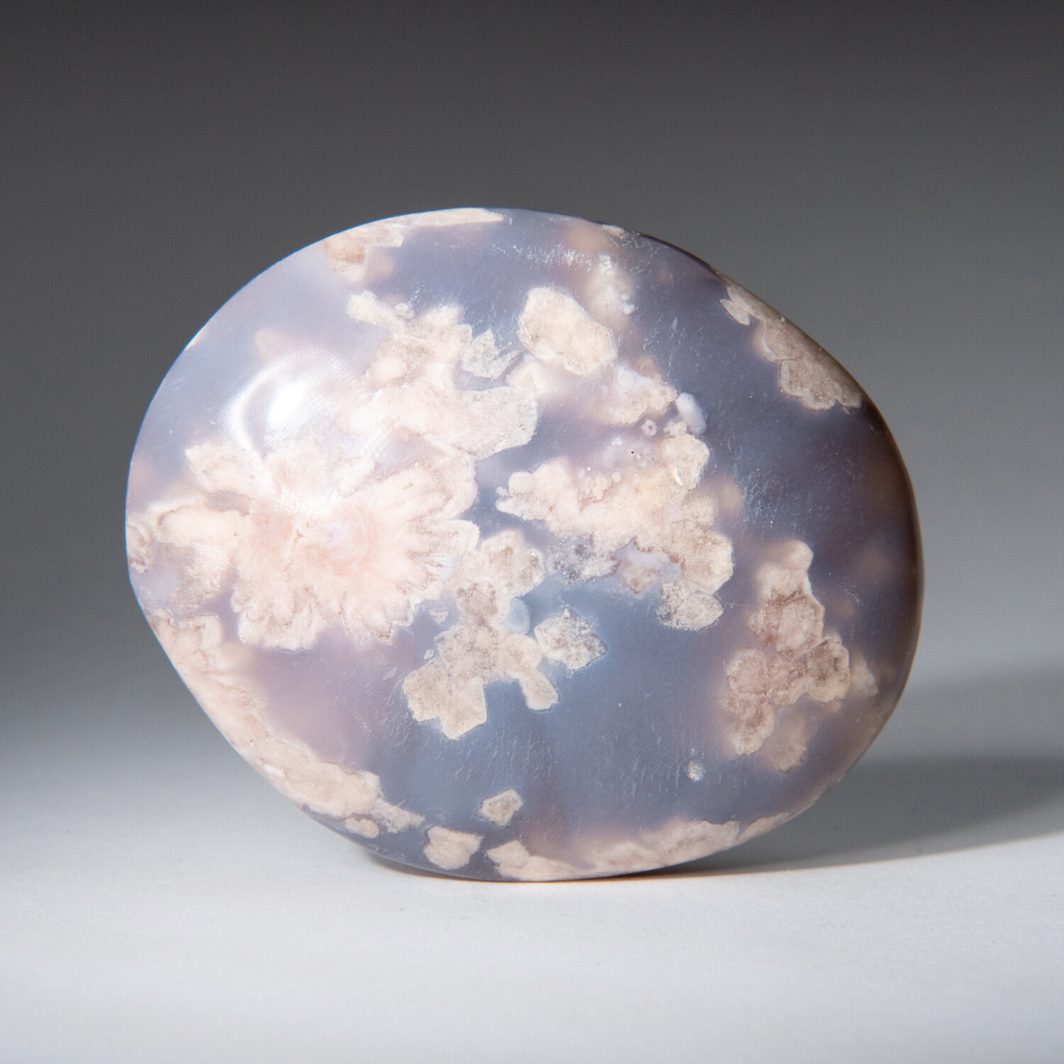 This solid, top-quality, hand-polished genuine Flower Agate palm stone, is sourced from Madagascar. Flower Agate is a type of Agate with opaque Chalcedony inclusions that resemble tiny floral formations.