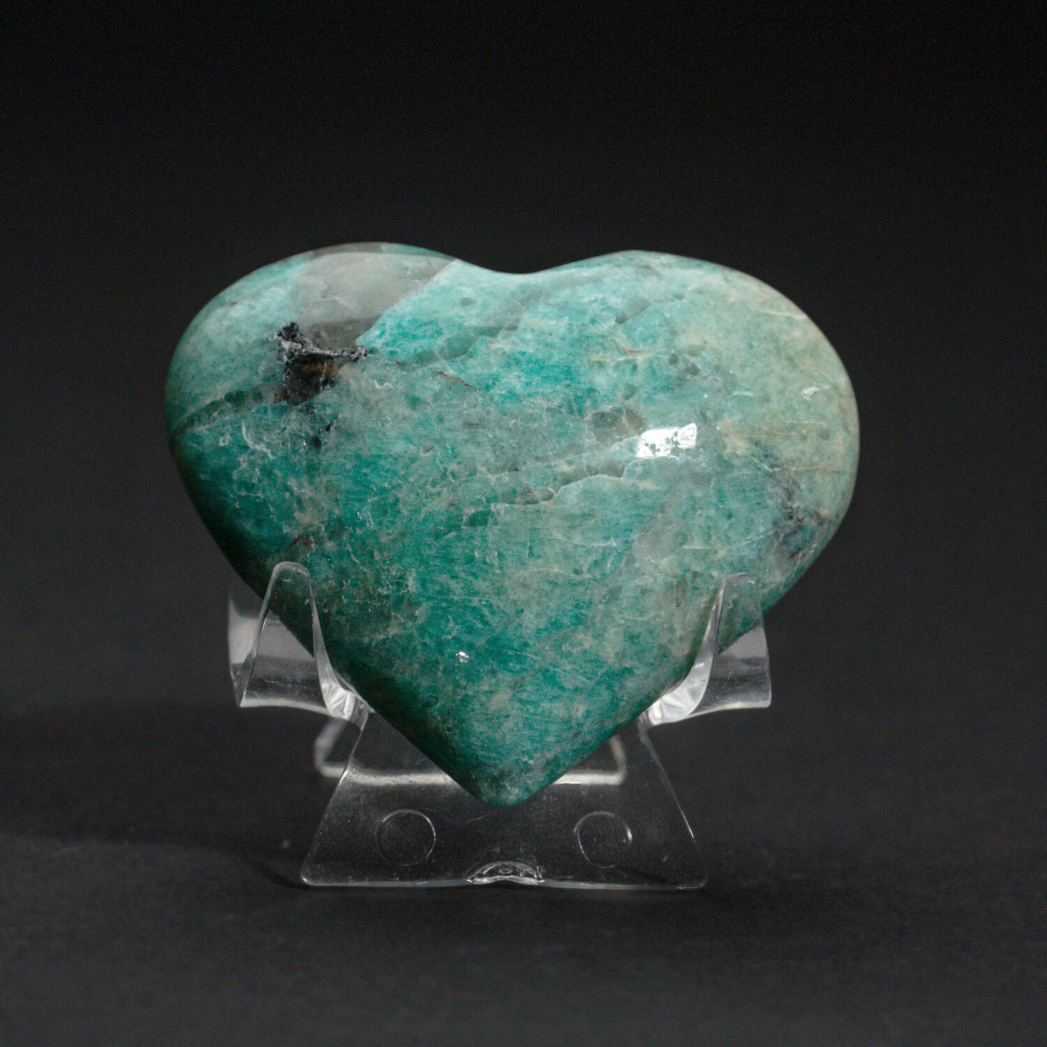 AAA quality Polished Amazonite Heart hand polished to a smooth mirror finish. Amazonite is a beautiful green variety of microcline feldspar. This heart has a vibrant blue/green color with unique veins throughout. Amazonite has healing powers to help with physical ailments, emotional issues, and in Energy Healing and chakra balancing. Amazonite crystal therapies are primarily associated with filtering out stresses, healing traumas, and soothing energies in the home and workplace.