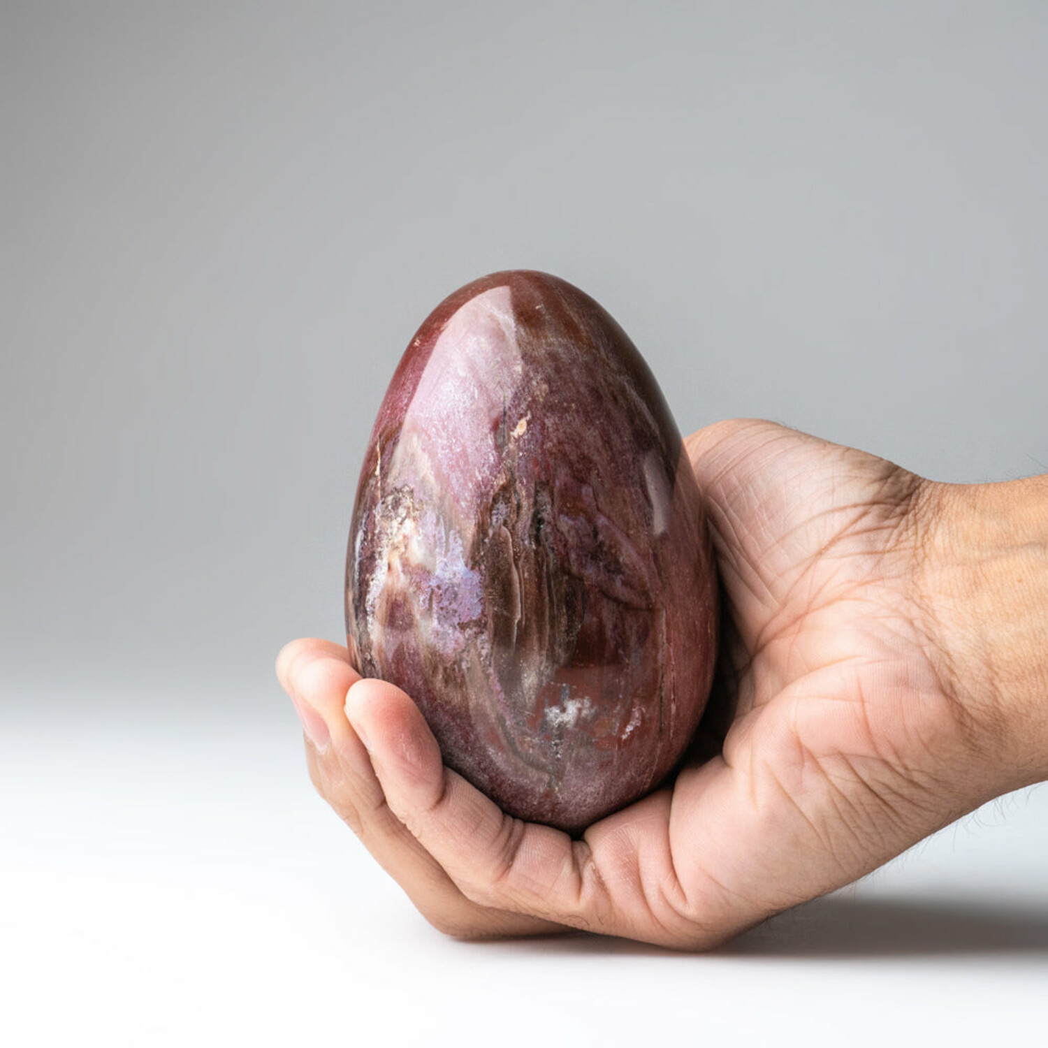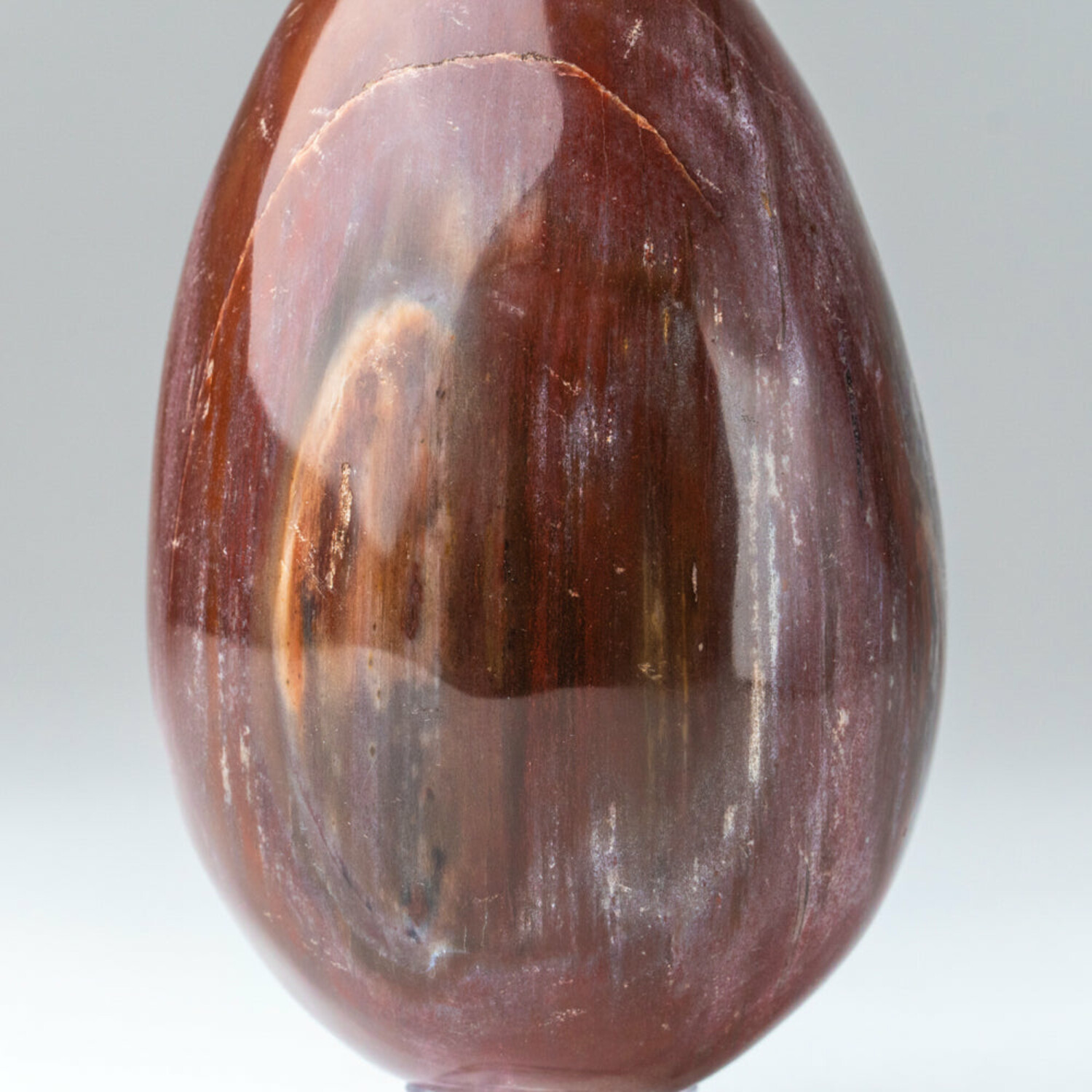 This beautiful, hand-polished petrified wood egg from Madagascar has an amazing pattern with vibrant hues of red, brown, and orange. Fossilized Petrified Wood, which is also known as Agatized Wood, forms when a tree has died and silicon dioxide forms in place of the wood that degrades until there is no wood left, only quartz.