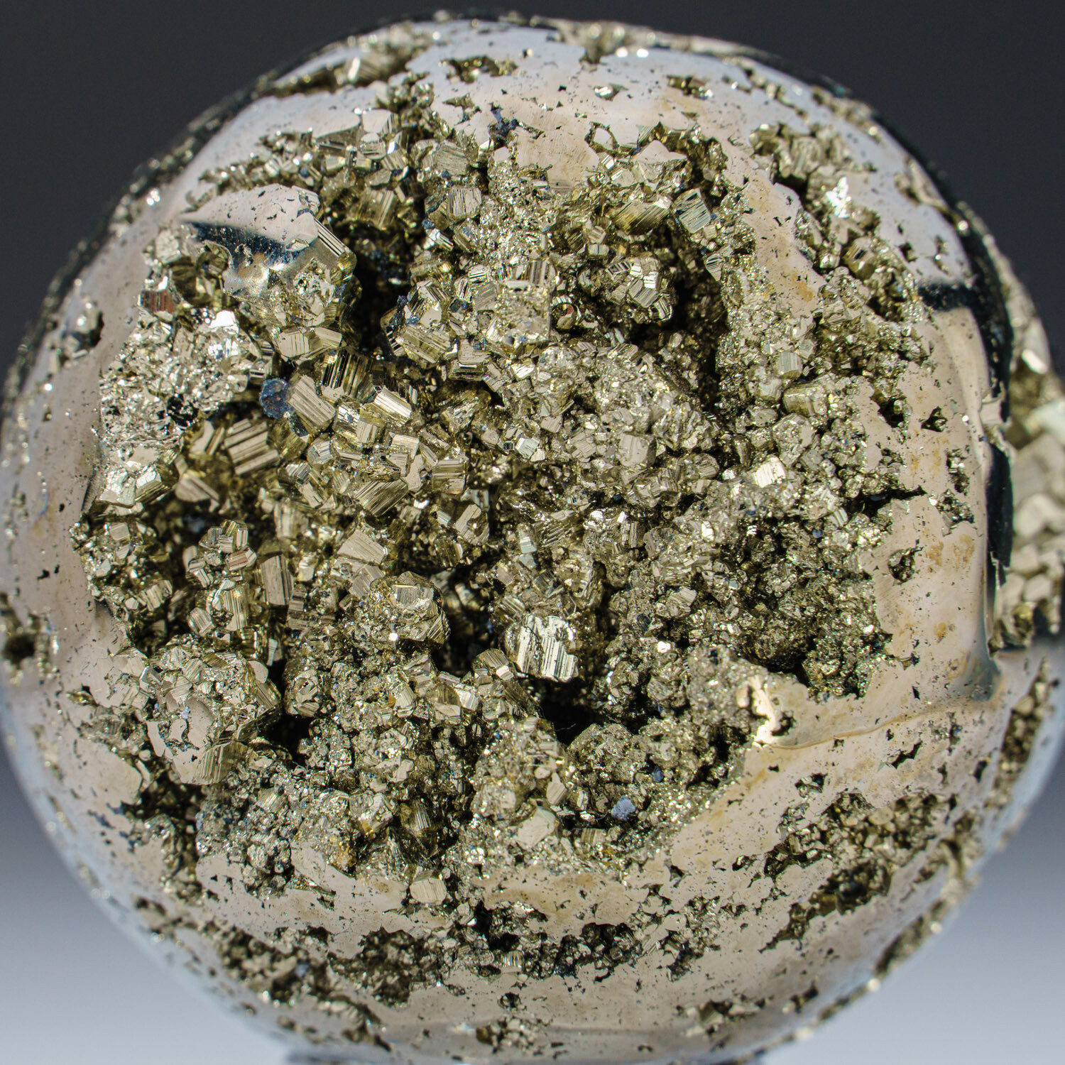 This Pyrite Sphere has a metallic luster and pale brass-yellow hue that gives it a superficial resemblance to gold. Each piece is polished to a high mirror finish with mesmerizing crystal pockets revealing its natural crystallized cubic formation.