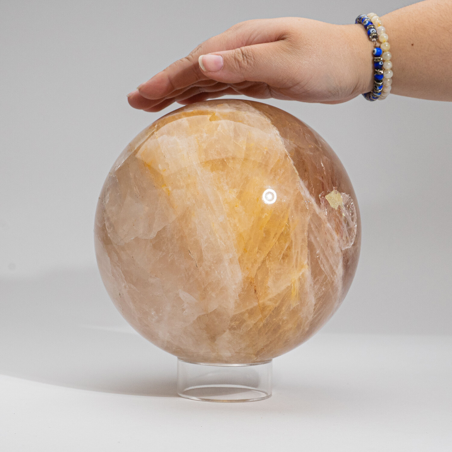 This top AAA-quality sphere of natural, gem translucent Rose Quartz is hand-polished to a brilliant shine. It features a beautiful pink hue with hints of peach tones throughout.