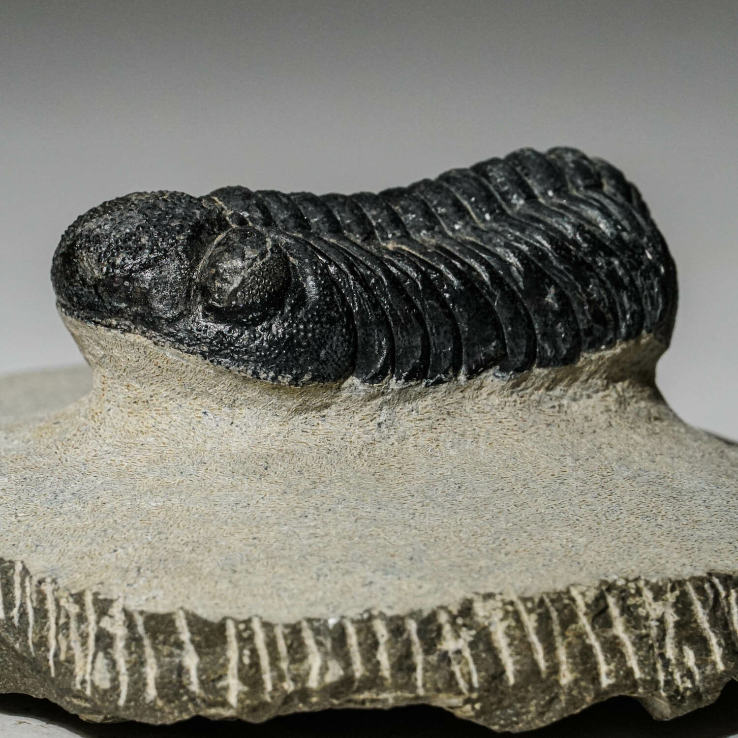 This is a large Genuine Asaphus Intermedius Trilobite In Matrix. Asaphus intermedius is known for its highly stalked compound eyes. This adaptation becomes even more apparent in its stark contrast to the lack of ornamentation over the rest of the animal's body. This is because Asaphus was a response to new predatory threats: instead of swimming away, these trilobites buried themselves in the sand. This trilobite is from the middle Devonian, approximately 400 MYO.