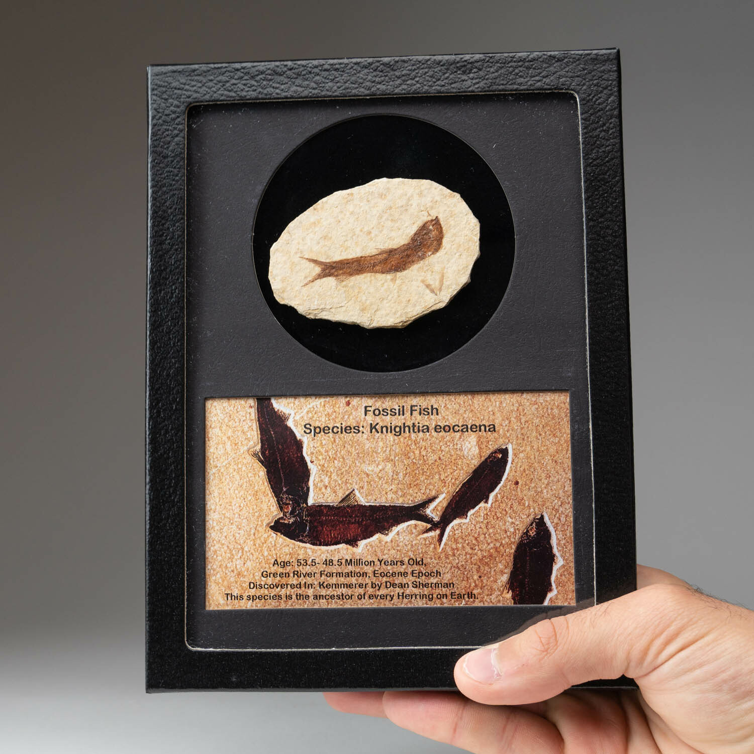 This is a Genuine Knightia Fossil Fish in a Glass Display Box. This specimen comes in a labeled display box with color image and a brief written description. These make amazing gifts as they come perfectly displayed and labeled. Here's a 50 million year old fossil herring from the Green River Formation of Wyoming. The species is Knightia eocaena, and it was collected near Kemmerer, Wyoming.
