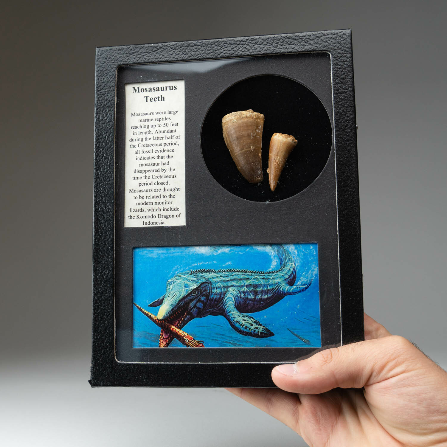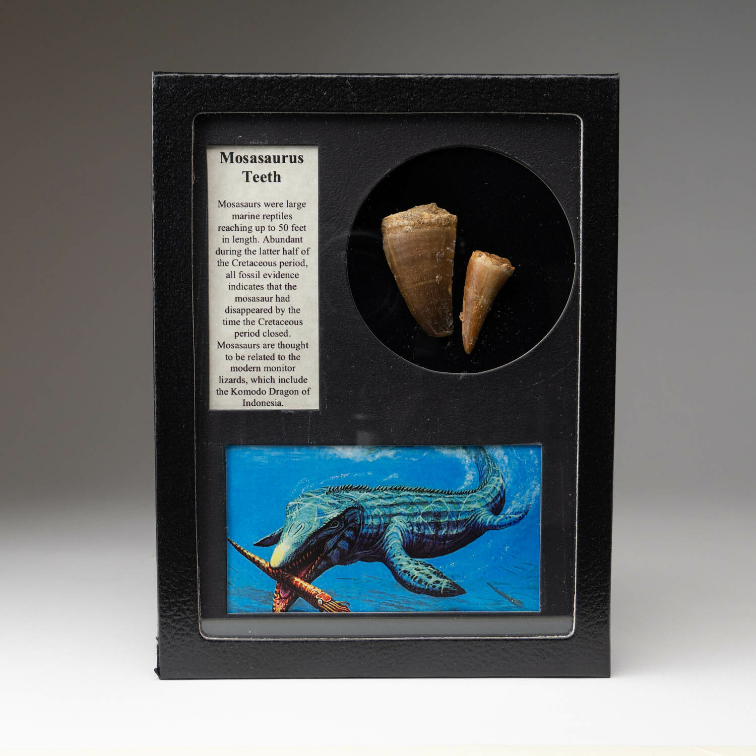 This is a Genuine Mosasaur Dinosaur Tooth in a glass display box. This tooth is from the Cretaceous Period - 80 million years old. This specimen (roughly 2") comes in a labeled display box with a brief written description. These make amazing gifts as they come perfectly displayed and labeled.