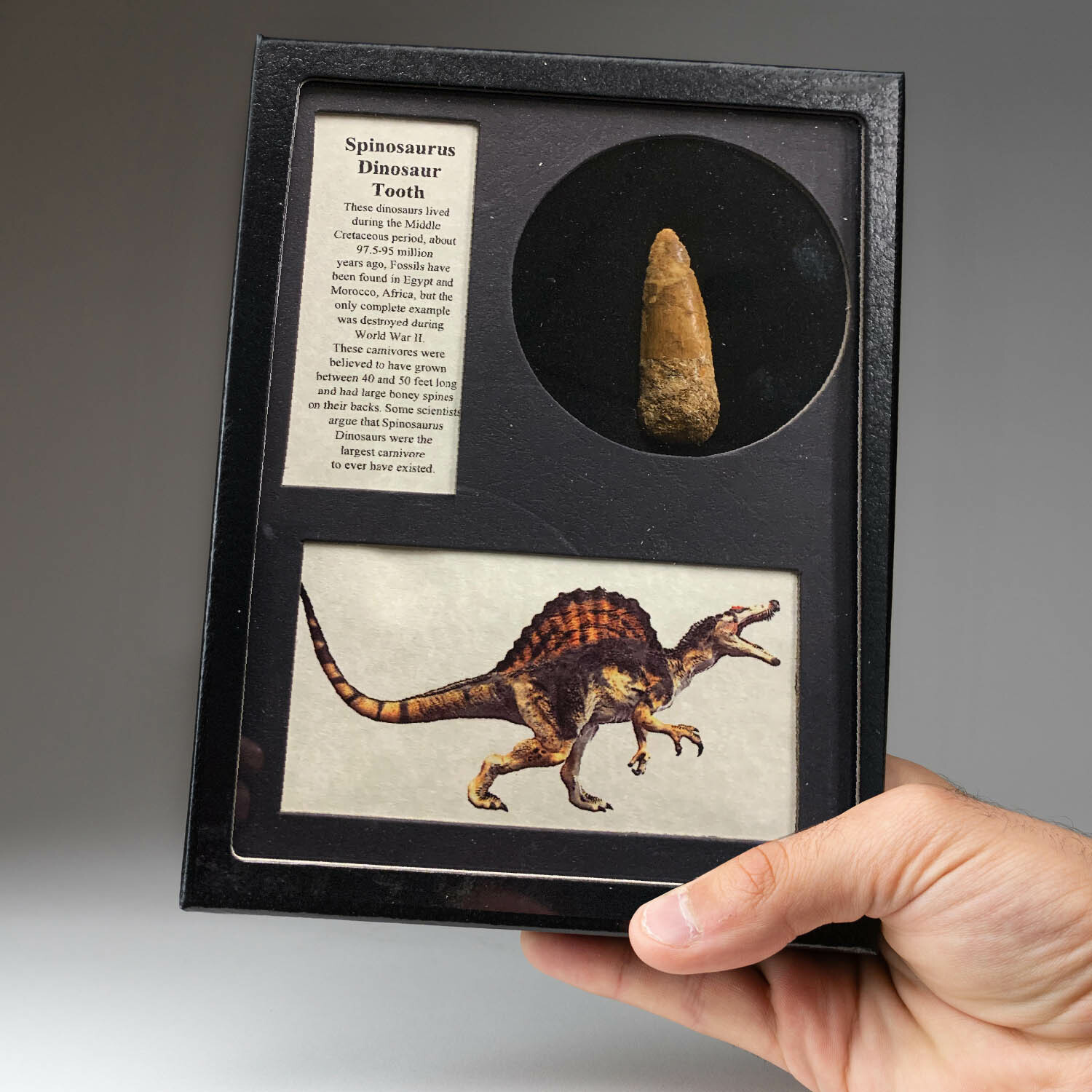 This is a Genuine Spinosaur Dinosaur Tooth In Display Box. This specimen comes in a labeled display box with color image and a brief written description. These make amazing gifts as they come perfectly displayed and labeled. Spinosaurus (meaning "spine lizard") is a genus of theropod dinosaur that lived in what now is North Africa, during the upper Albian to upper Turonian stages of the Cretaceous period, about 112 to 93.5 million years ago. This genus was known first from Egyptian remains discovered in 1912 and described by German paleontologist Ernst Stromer in 1915.