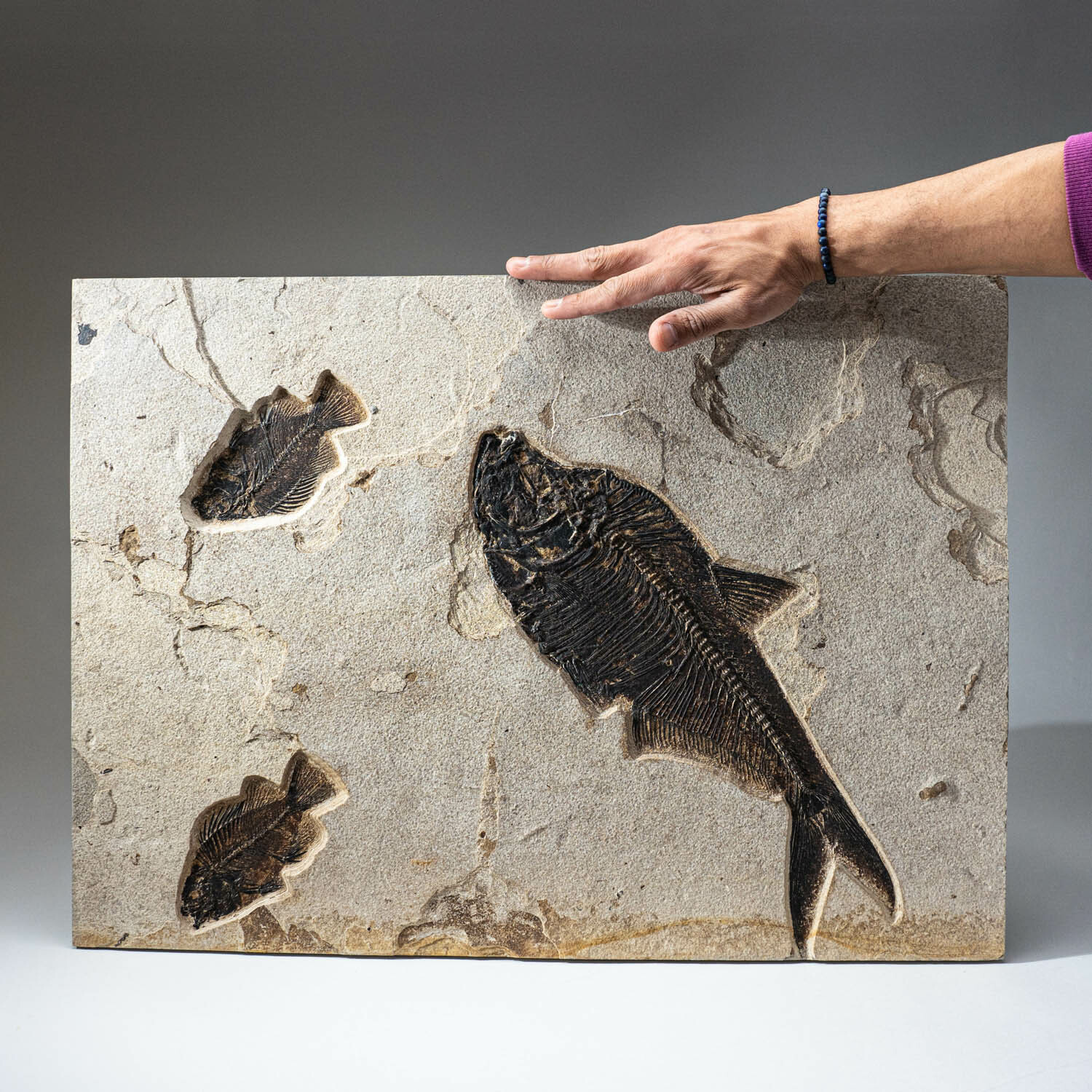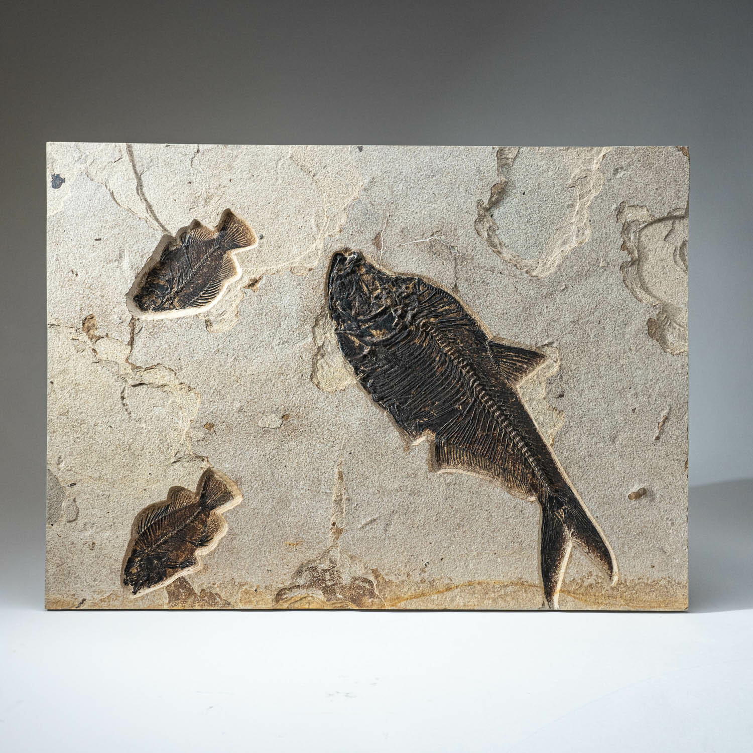 This Giant Diplomytus + Cockerellites Fish Fossil Plate is incredibly unique, featuring a long Diplomystus dentatus along with two Cockerellites (Priscacara) liops, fossilized in its natural matrix. The entire piece has been backed with wood for stability and convenient display. This piece was found from the Green River Formation in Wyoming.