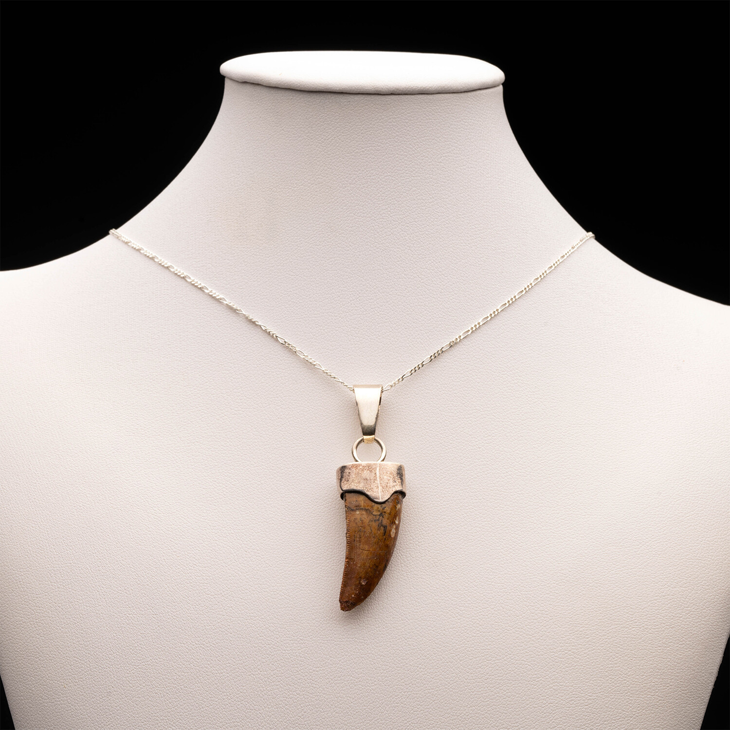 Beautifully set in sterling silver, this African T. Rex tooth is from the Kem Kem Formation in Morocco and dates back to the Cretaceous period. This specimen makes a wonderful accessory and conversation piece. The sterling silver chain is included. Dimensions referenced are of the specimen and cap without the bail.
