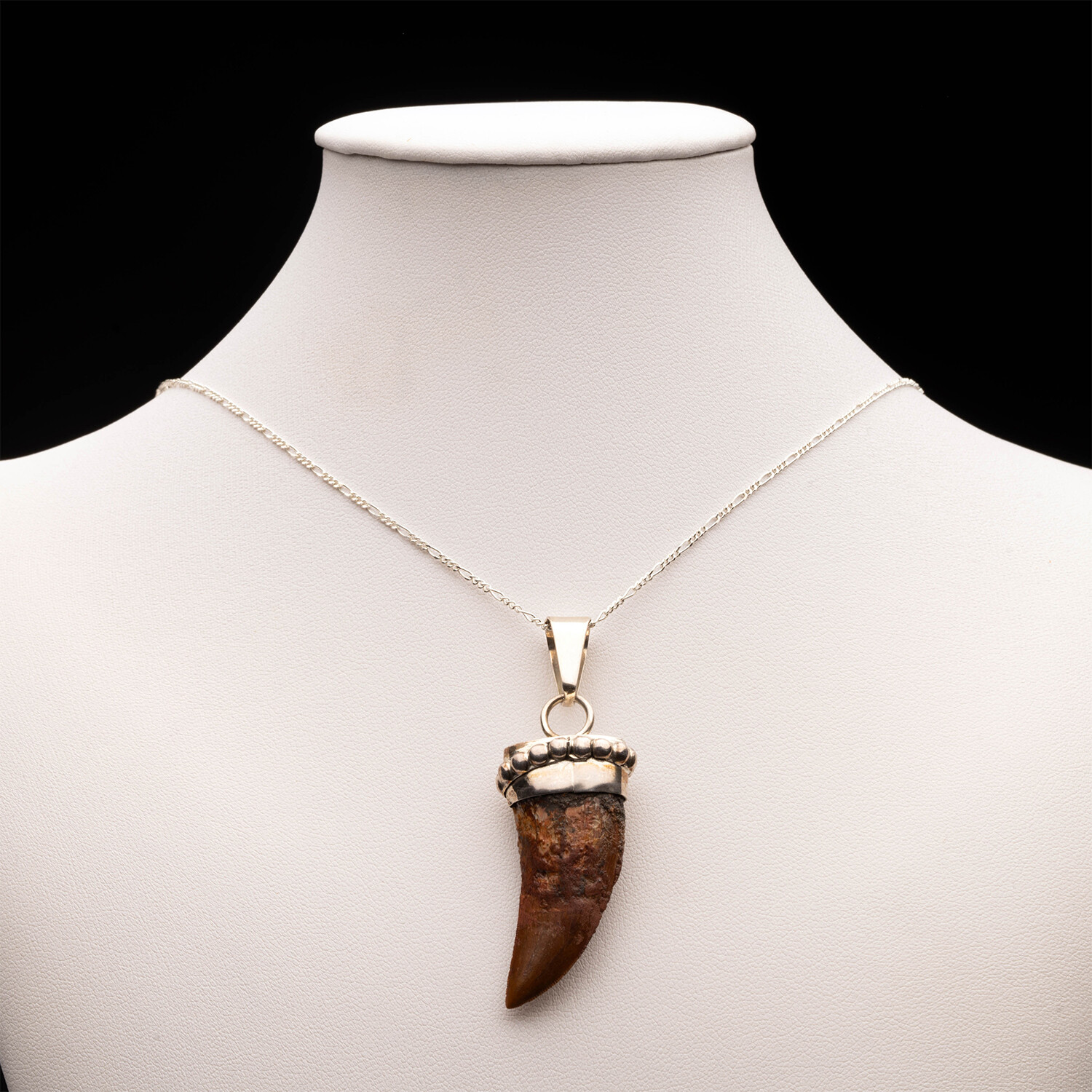 Beautifully set in sterling silver, this African T. Rex tooth is from the Kem Kem Formation in Morocco and dates back to the Cretaceous period. This specimen makes a wonderful accessory and conversation piece. The sterling silver chain is included. Dimensions referenced are of the specimen and cap without the bail.