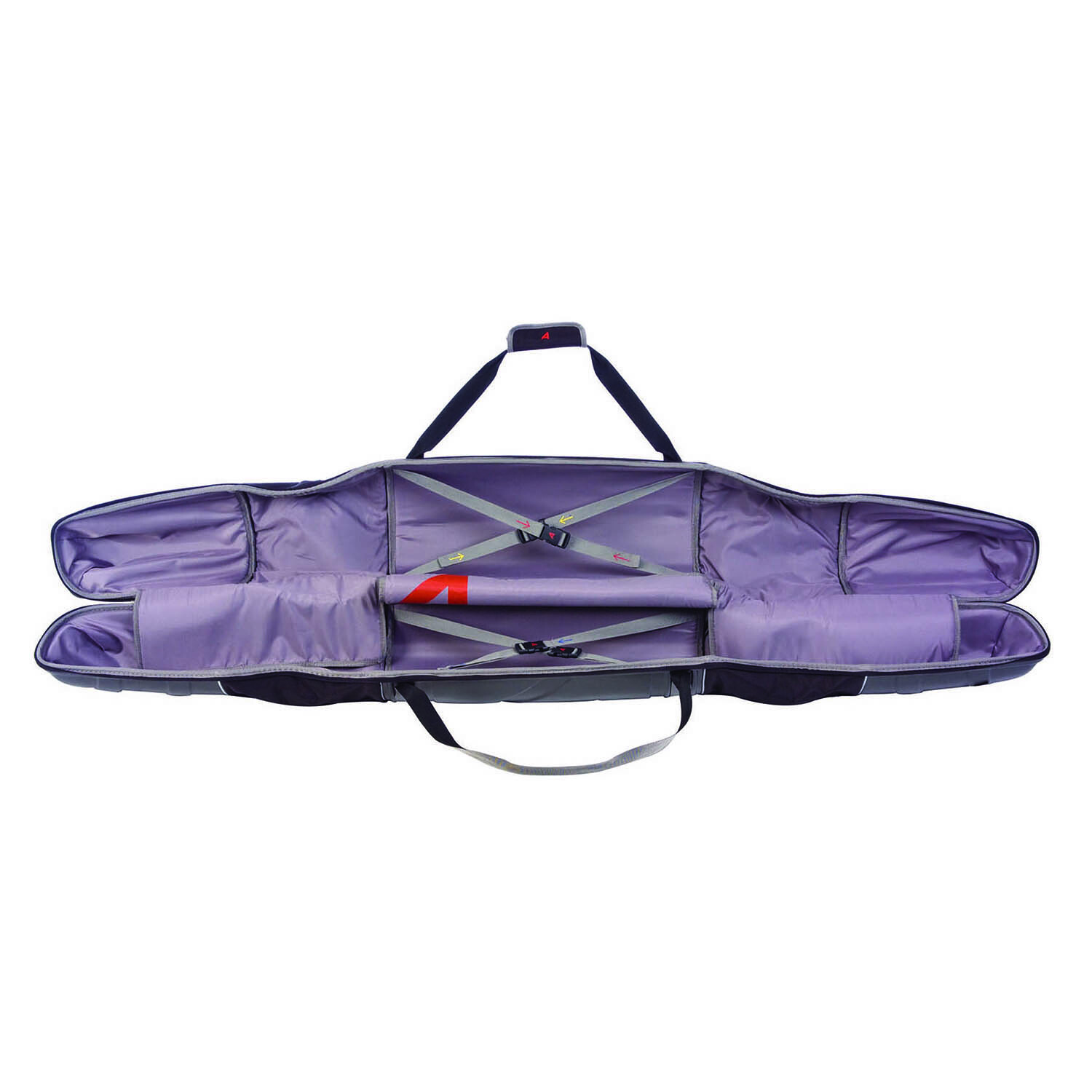 Stow your gear for your next snow adventure in this streamlined molded double ski bag. The Athalon Platinum Molded Wheeling Double Ski Bag is constructed from durable, high-density polyester combined with ABS molded plastic, a full lining, and a padded interior. Hit the mountain with this functional bag that is roomy enough to hold two sets of skis and poles. This convenient wheeled bag has self-healing nylon zippers for security and locking zipper pulls so you can travel securely, knowing your important gear is safe inside.