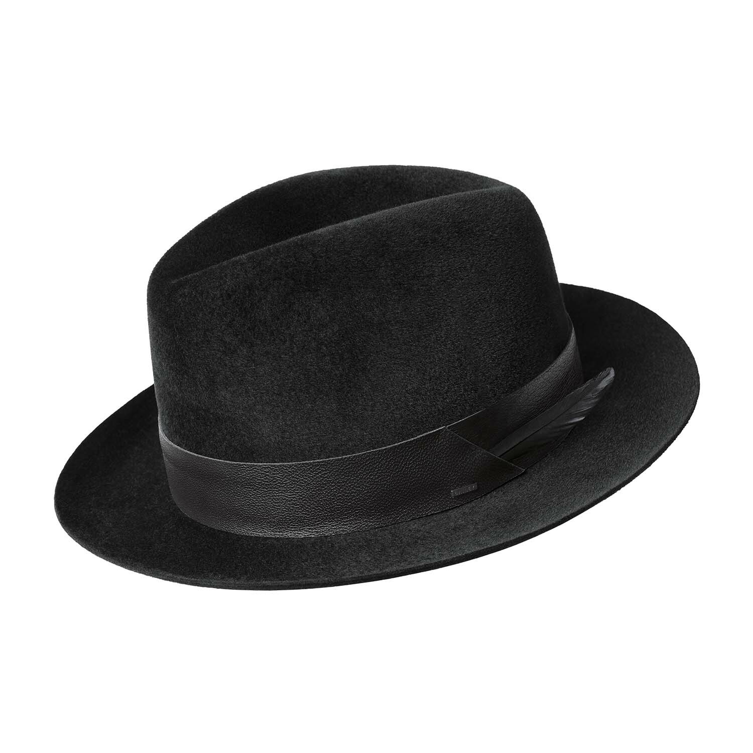 Flume is a Pinch Front Crown with a classic Snap Brim. It is crafted out of a plush Fur Velour body and trimmed with a contrasting smooth leather band. This hat also includes a removable feather, is fully lined and has a Fine Woven Sweatband