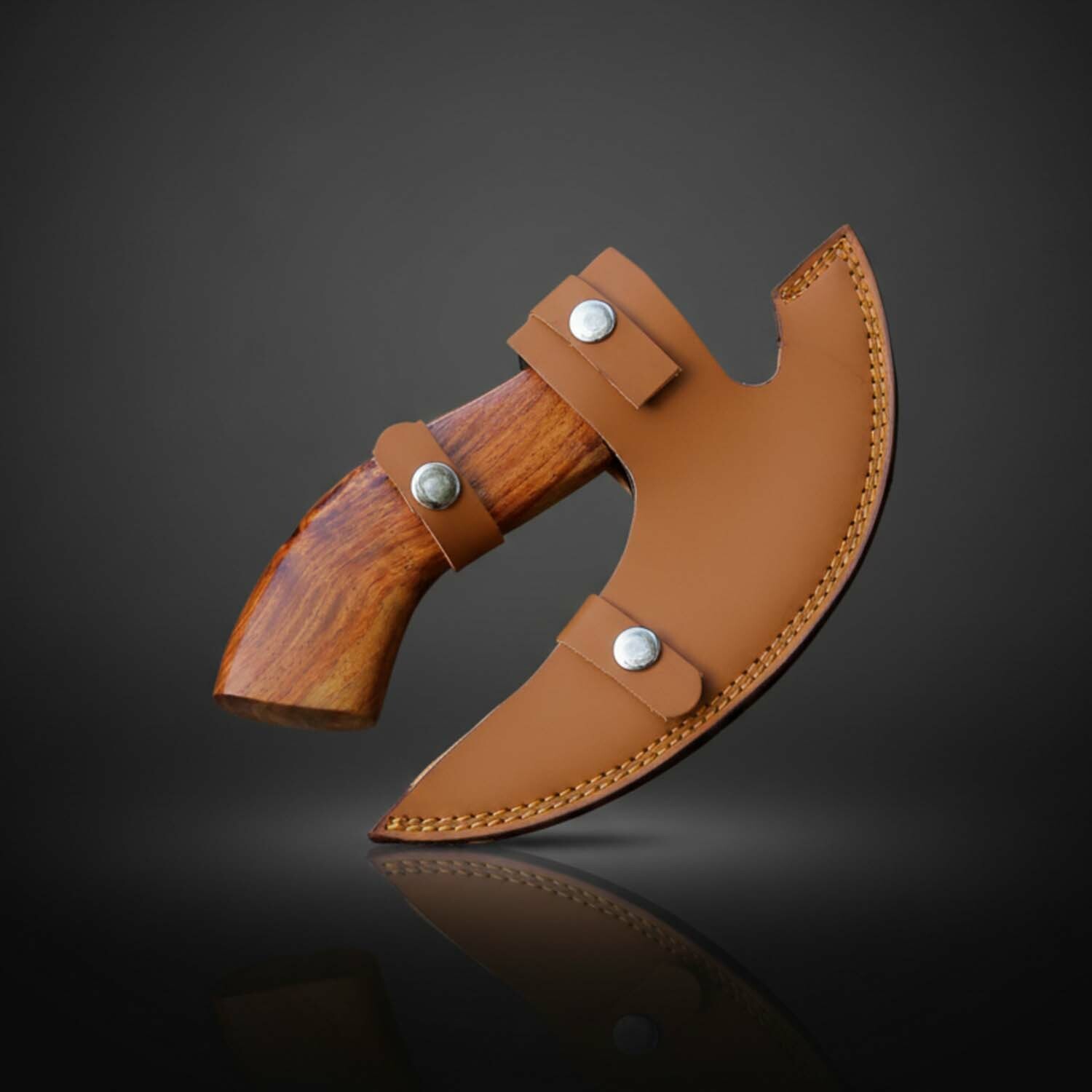 A compact Viking-style axe featuring a hand-engraved carbon steel head and a smooth polished wood handle. Designed for display, gifting, or light outdoor use, it includes a custom-fit leather sheath for safe storage. A striking piece with Norse artwork that adds character to any collection.