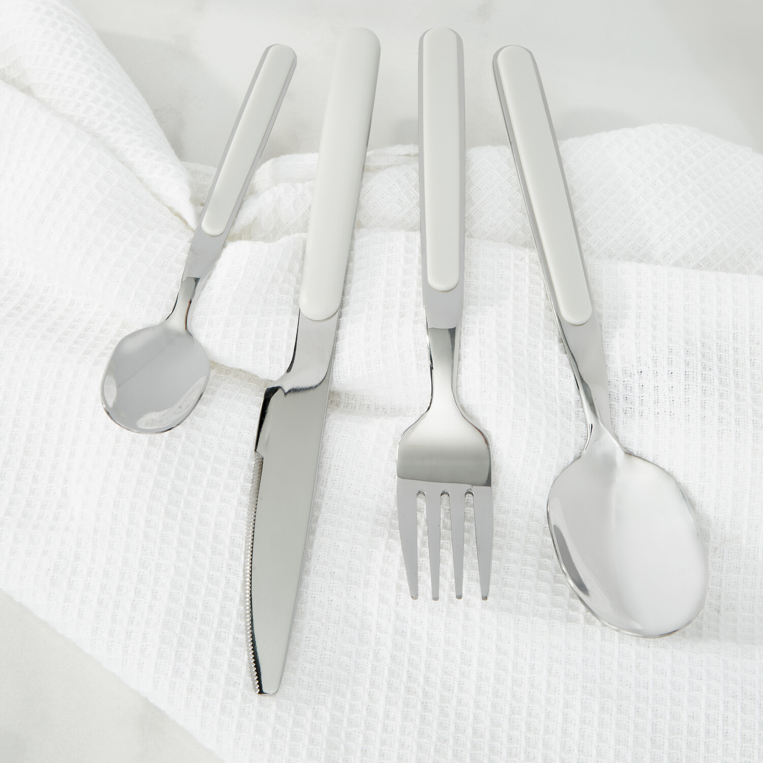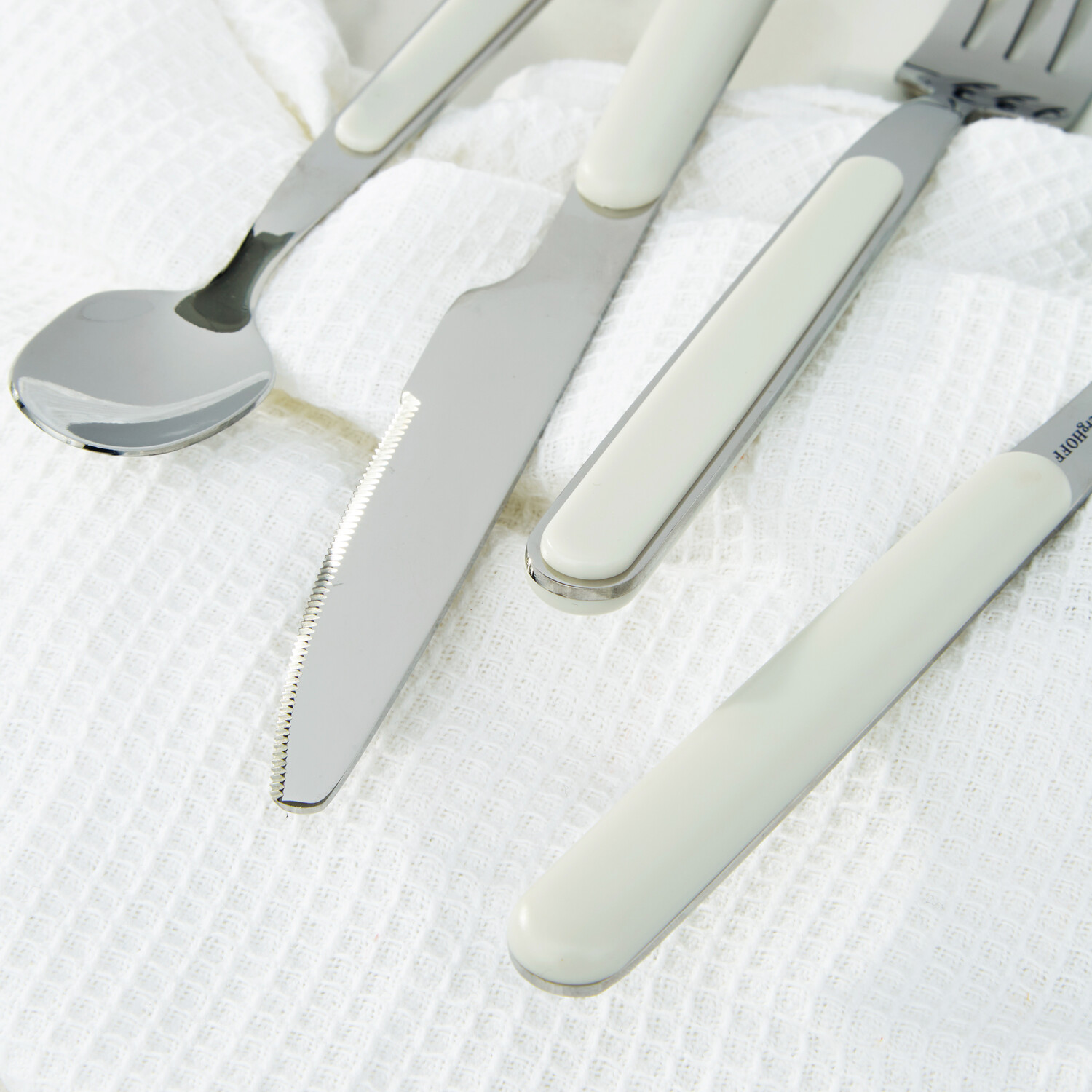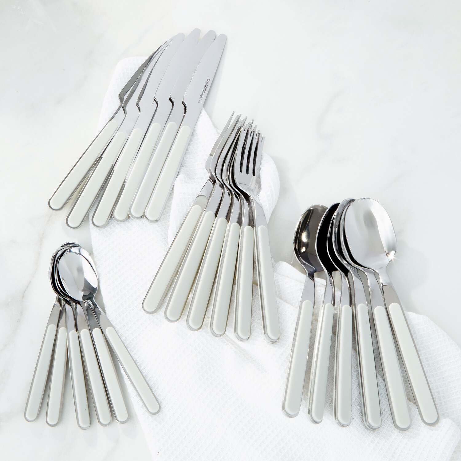 Elevate your dining experience with our Leo Balance 24pc flatware set. Crafted from durable stainless steel, each piece combines sleek design with functionality. The dinner knives glide effortlessly through meals, while the dinner forks and spoons ensure a perfect bite every time. Complete your coffee or tea rituals with the teaspoons. Ergonomically designed ABS handles provide a comfortable grip, making each meal a delight. Perfectly designed to serve up to six people, this flatware set is ideal for family dinners, gatherings, and entertaining guests or even during everyday use or special occasions. This set is a must-have for any modern table setting. Available in Moonmist or Moonbeam. Set includes: 6x Dinner Knives 8.25", 6x Dinner Forks 7.75", 6x Dinner Spoons 7.75", 6x Coffee/teaspoons 5.75"