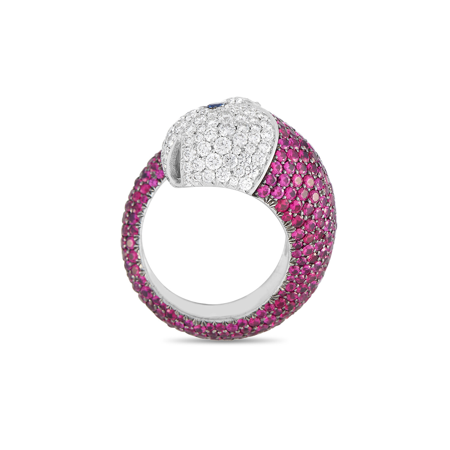 18K White Gold Diamond + Ruby + Sapphire Fish Ring // Ring Size: 6.5 // New