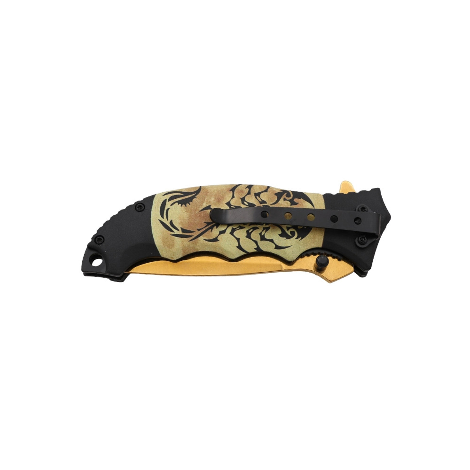 This collection of spring assisted pocket knives is built for fast, reliable one handed use with bold, graphic designs that stand out. Each piece features a tension driven opening mechanism for quick deployment, textured grips for control, and durable stainless steel blades suited for everyday tasks. From tactical profiles to statement finishes, these knives deliver dependable function and solid build quality at an easy entry price.