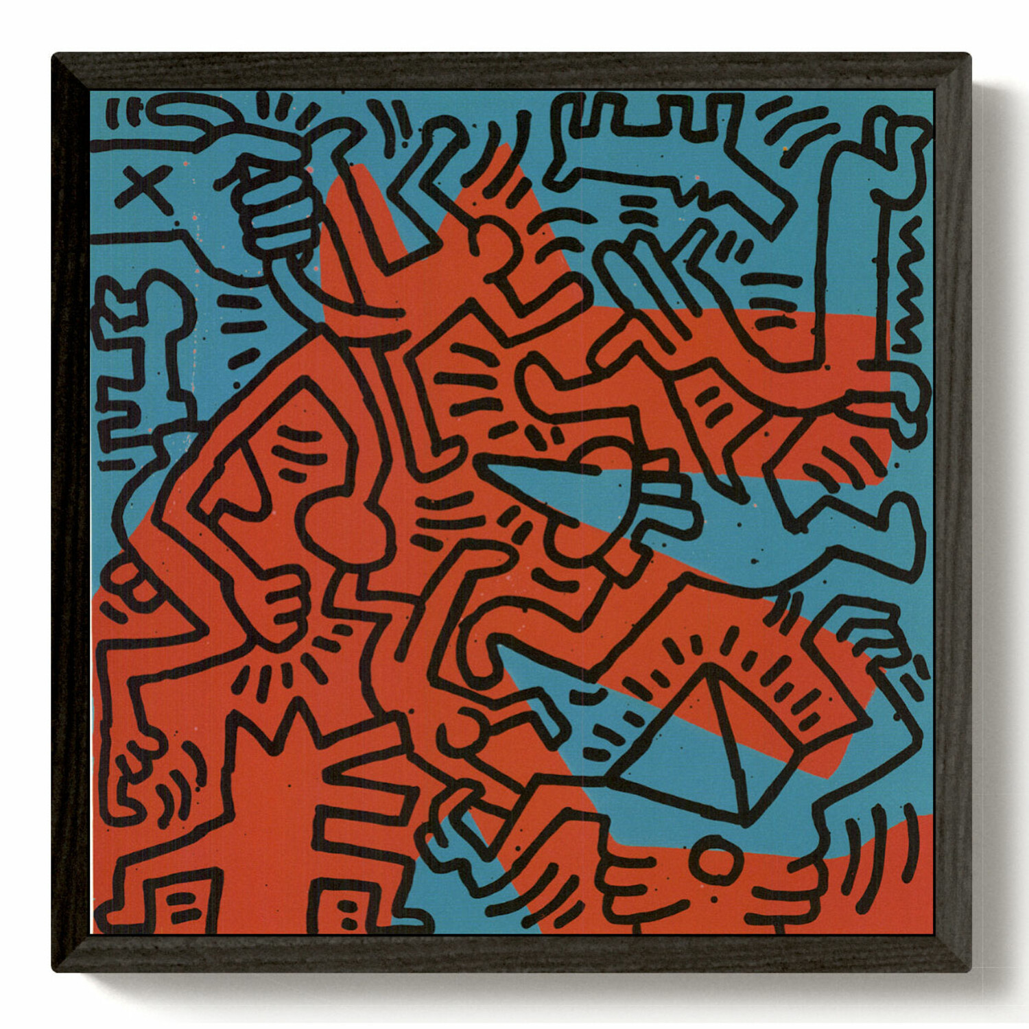 "Untitled, 1984" by Keith Haring, Unsigned Offset Lithograph printed in 2010. The overall size of the Offset Lithograph is 18.25 x 18 inches. The condition of this piece has been graded as A: Mint. Here is some supplemental information about the Offset Lithograph: This is a page from a spiral-bound calendar from 2010 with a different image by Keith Haring for each month. The calendar was published and printed by te Neues Verlag, Germany. Framed in a black wood frame with a 3/4 inch front profile and a 1 1/14 inch side profile. Overall dimensions are approximately 18.75 x 18.5 x 1 1/4 inches.