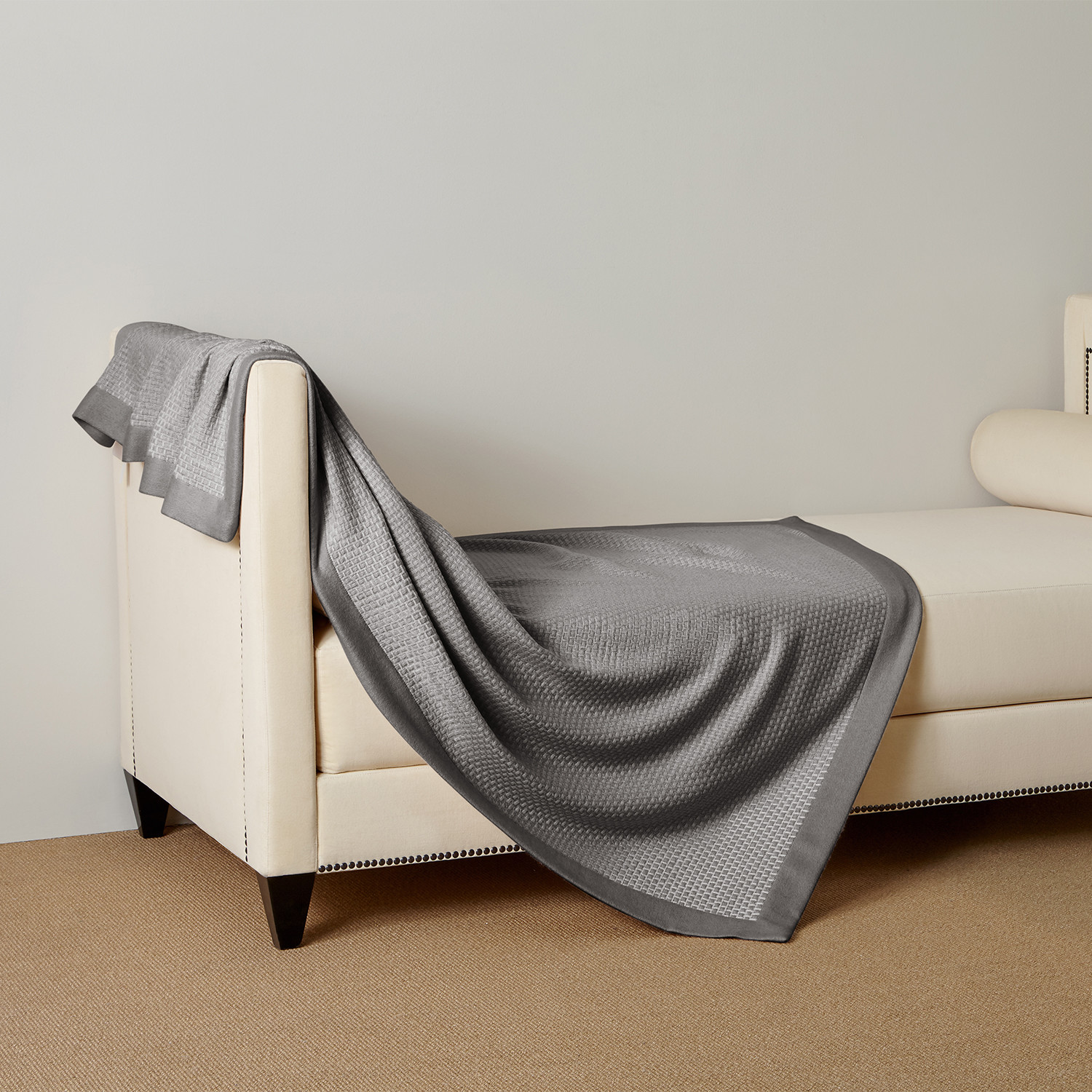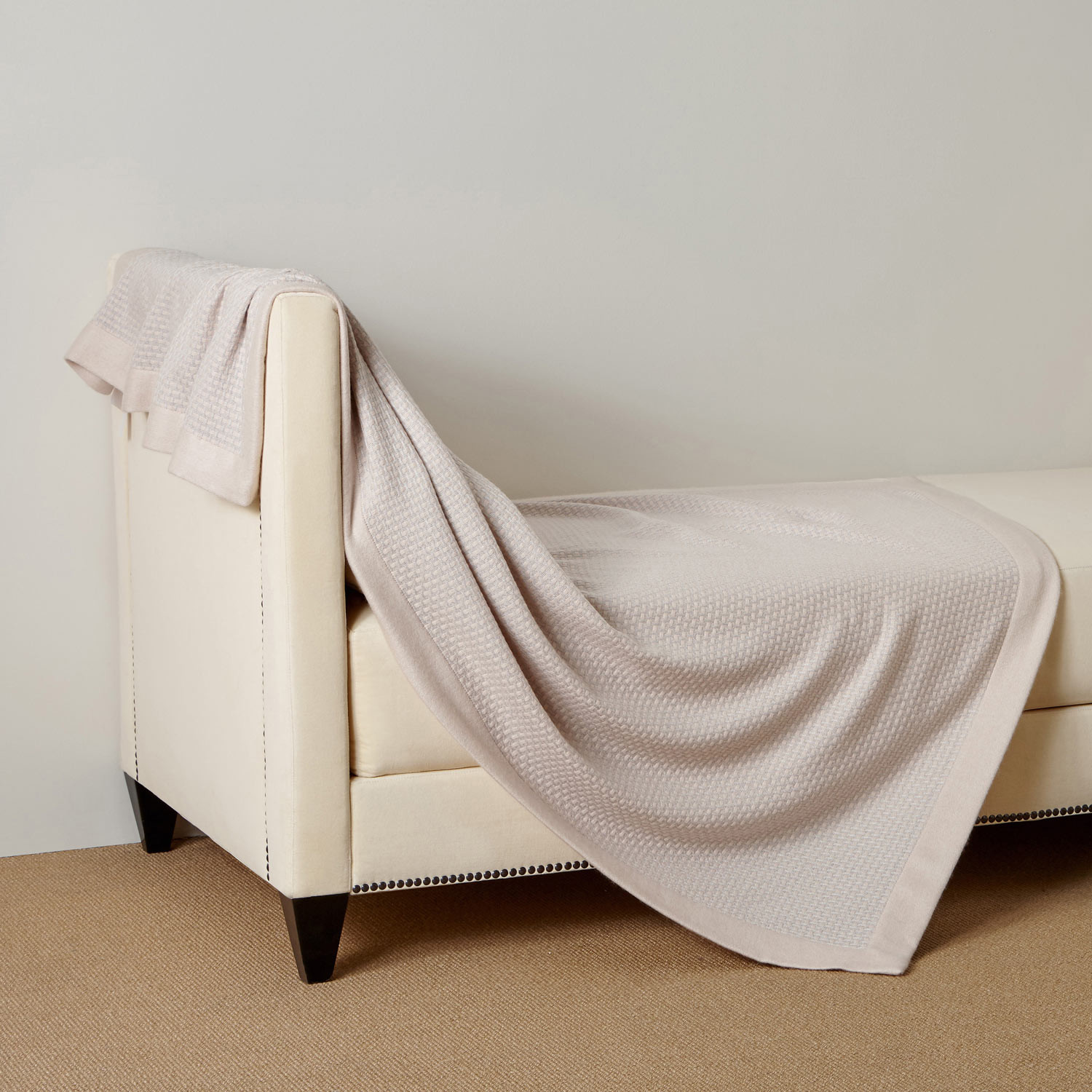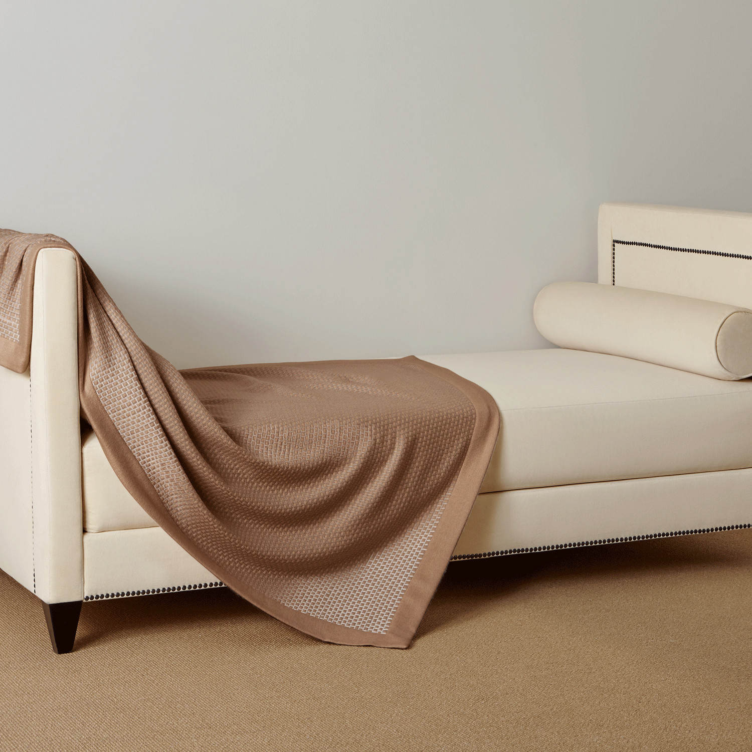 The Modus throw boasts a contrast ladder stitch jacquard motif and solid mitered border, made in a cozy wool, silk, and cashmere blend.