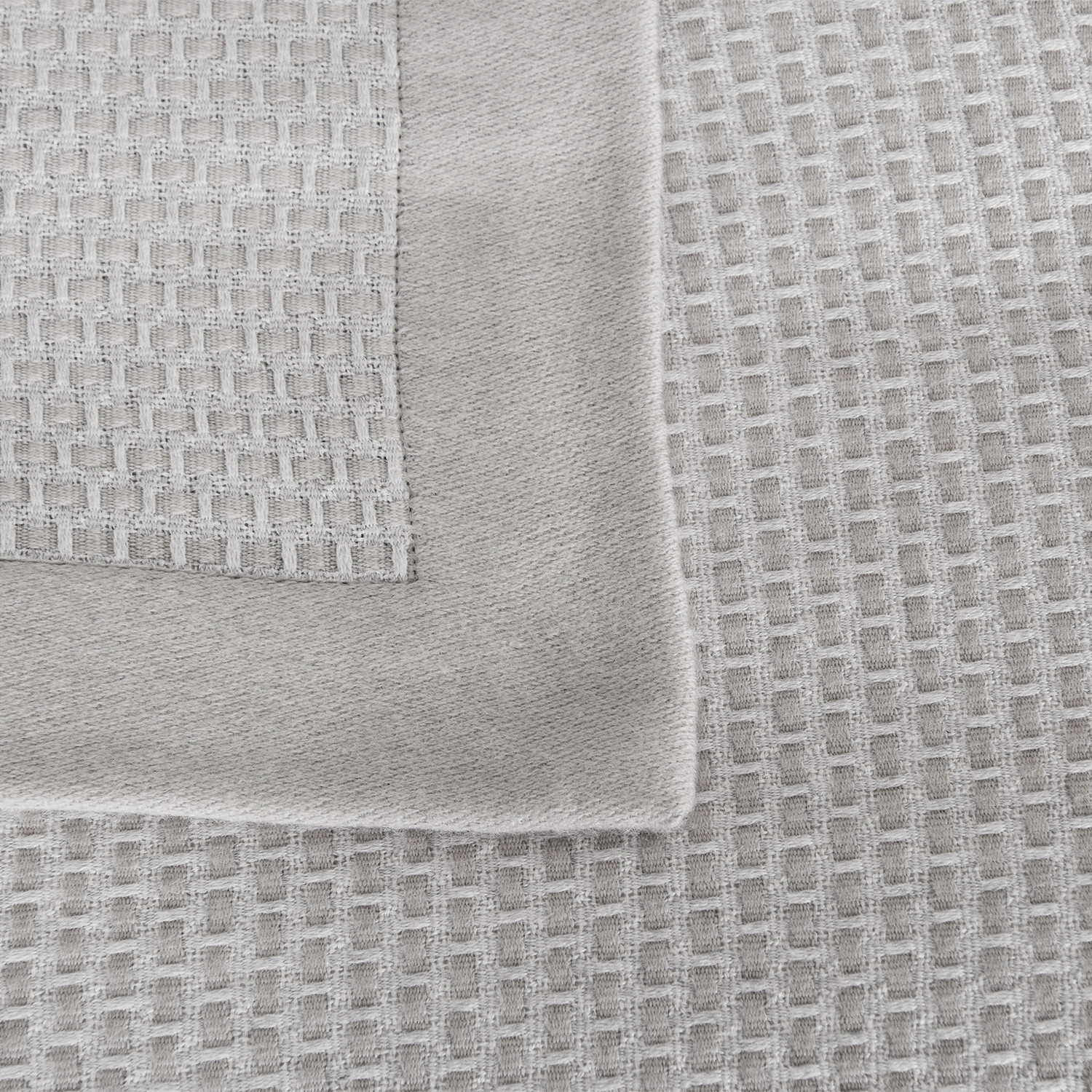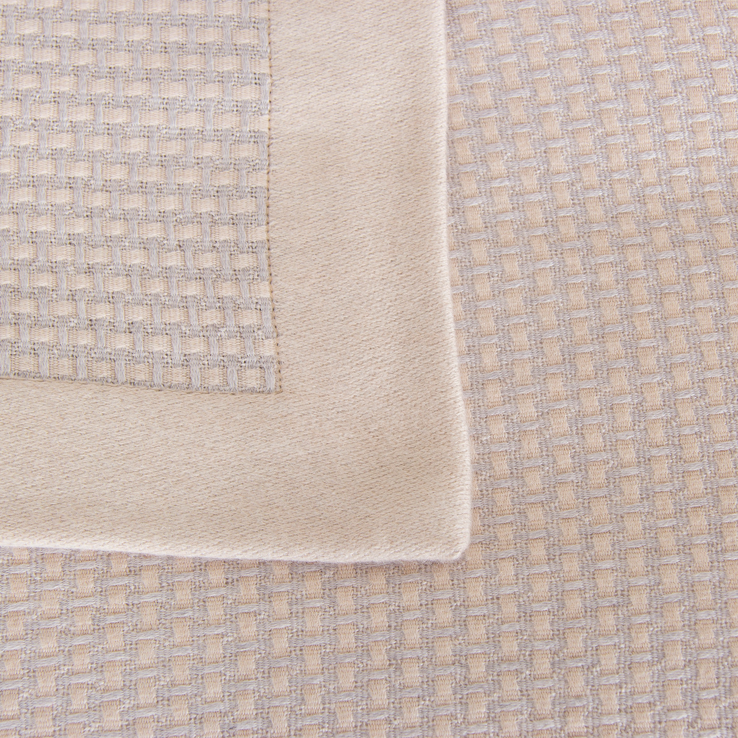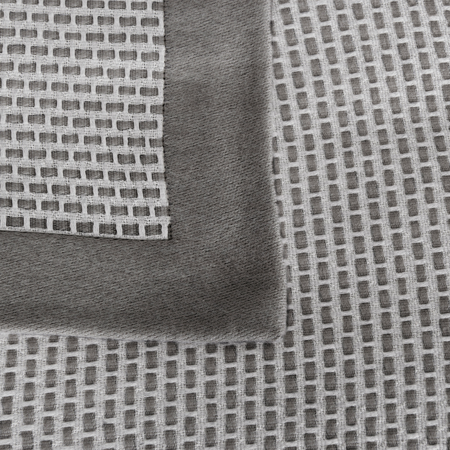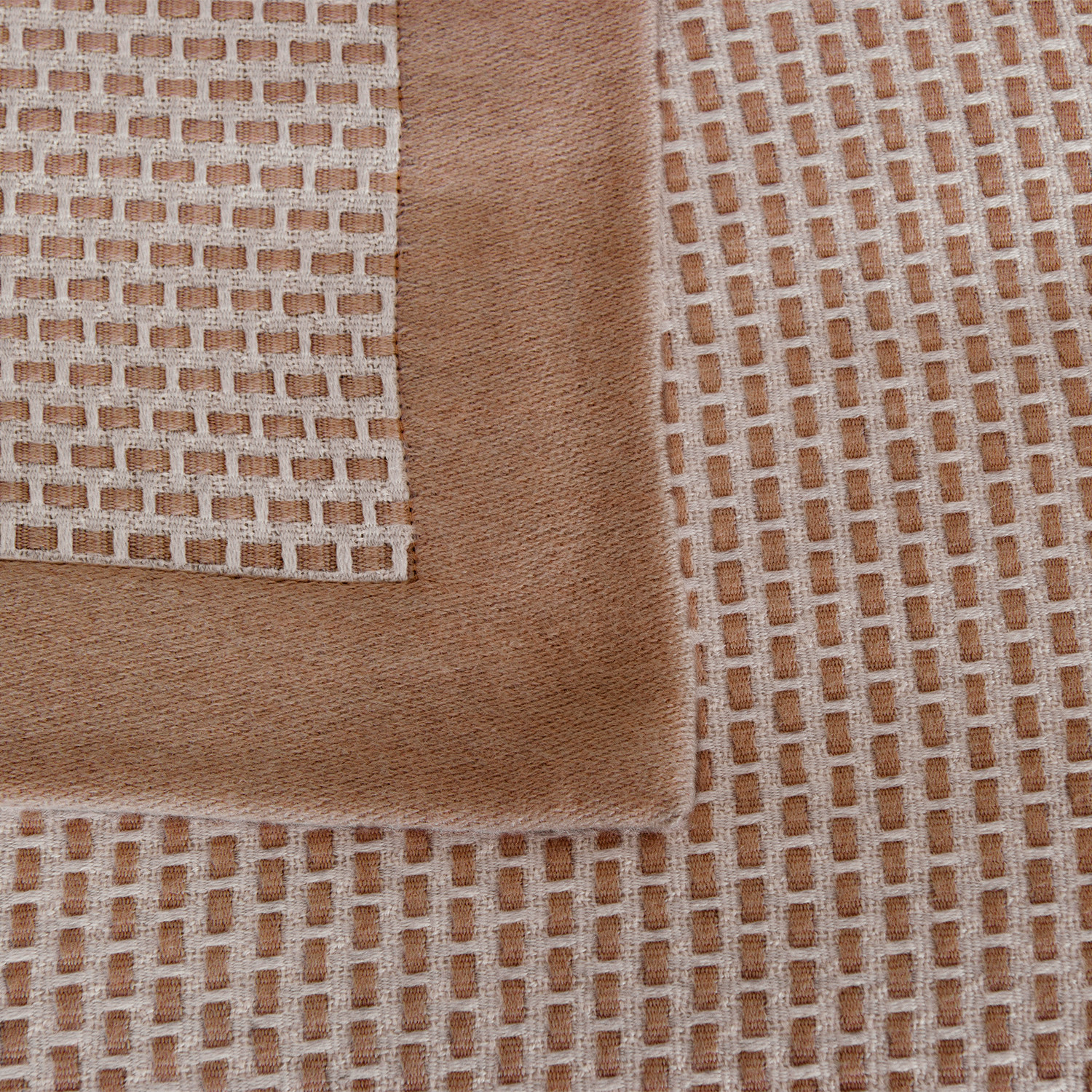 The Modus throw boasts a contrast ladder stitch jacquard motif and solid mitered border, made in a cozy wool, silk, and cashmere blend.