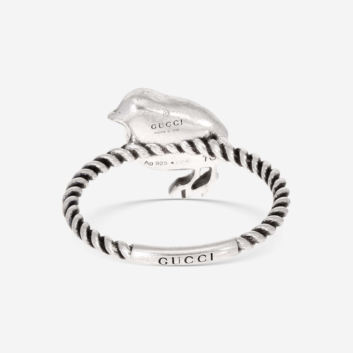A playful yet refined tribute to nature, the Gucci Animals Chick Motif Ring adds a touch of whimsical luxury to your collection. Crafted from high-quality sterling silver, this size 7.75 ring features an intricately detailed chick motif, symbolizing innocence and new beginnings. The delicate design captures the charm of the animal world, making it a unique and charming statement piece. With its polished finish and subtle elegance, this ring is perfect for those who love to incorporate nature-inspired elements into their style while embracing the artistry and luxury of Gucci.