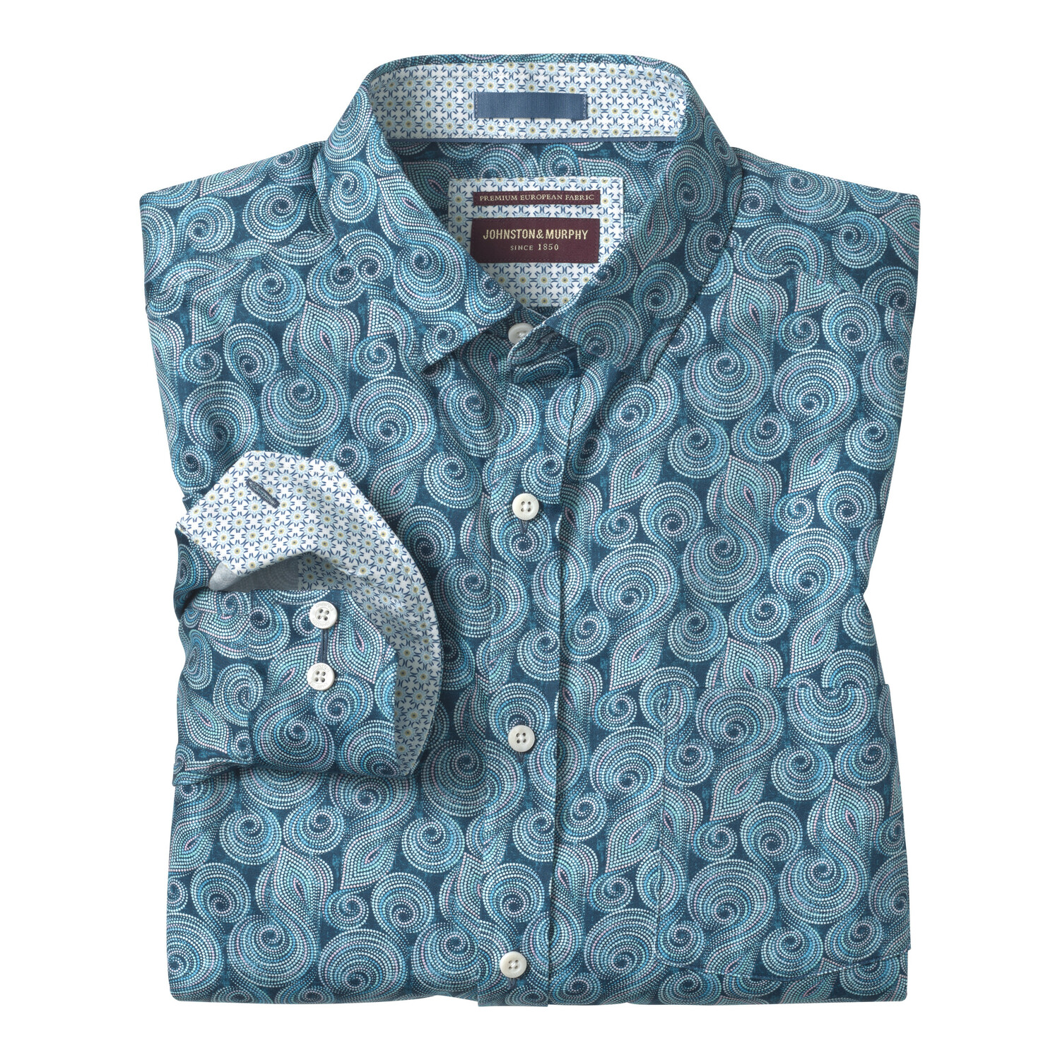 The shirt is crafted from sateen finished printed cotton that delivers a smooth feel and a clean, polished look. Contrast facing adds subtle detail at the collar and cuffs, while the hidden button down construction keeps the neckline tidy without visible hardware.