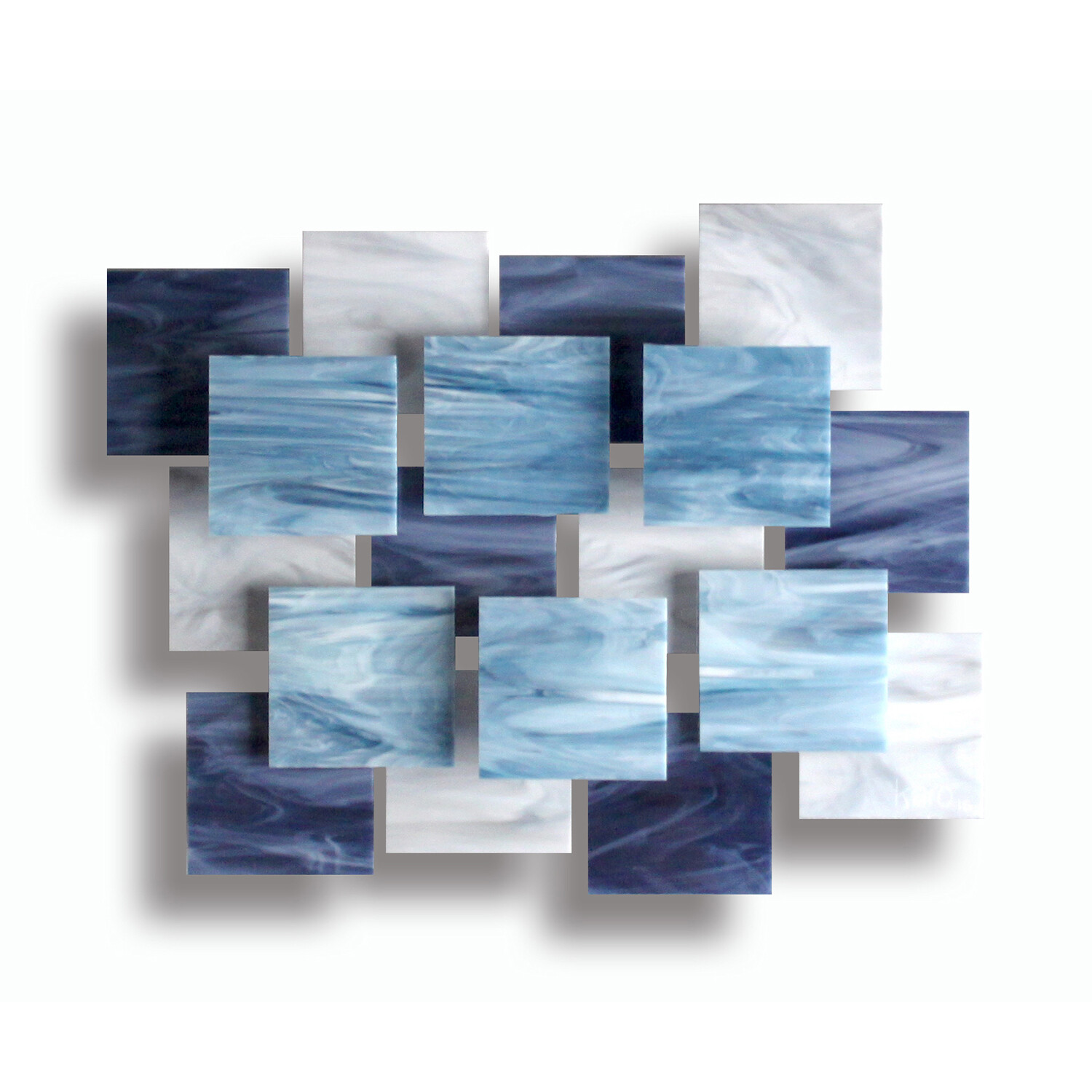 Individual pieces of glass are hand cut and placed over a welded metal frame on different elevations to create a 3D dynamic in this soothingly harmonious composition. The rear steel structure on the piece is primed and powder coated for durability, and the colors are baked inside each sheet of glass. Each piece is hand created by the artist in his studio in Los Angeles. The artist draws upon his background in architecture to find the balance and color that mark the unique aesthetic of this wall art.