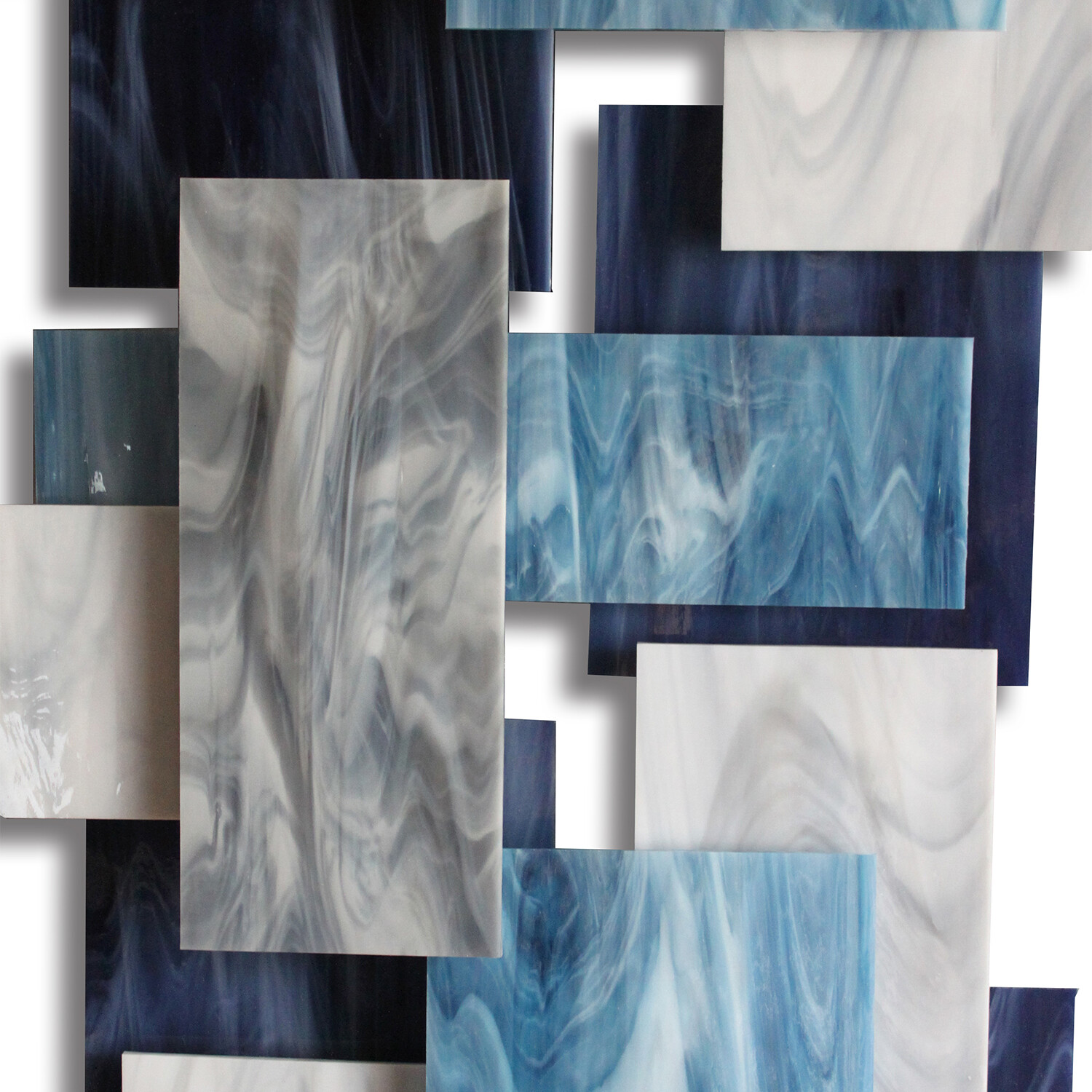 Individual pieces of glass are hand cut and placed over a welded metal frame on different elevations to create a 3D dynamic in this soothingly harmonious composition. The rear steel structure on the piece is primed and powder coated for durability, and the colors are baked inside each sheet of glass. Each piece is hand created by the artist in his studio in Los Angeles. The artist draws upon his background in architecture to find the balance and color that mark the unique aesthetic of this wall art.