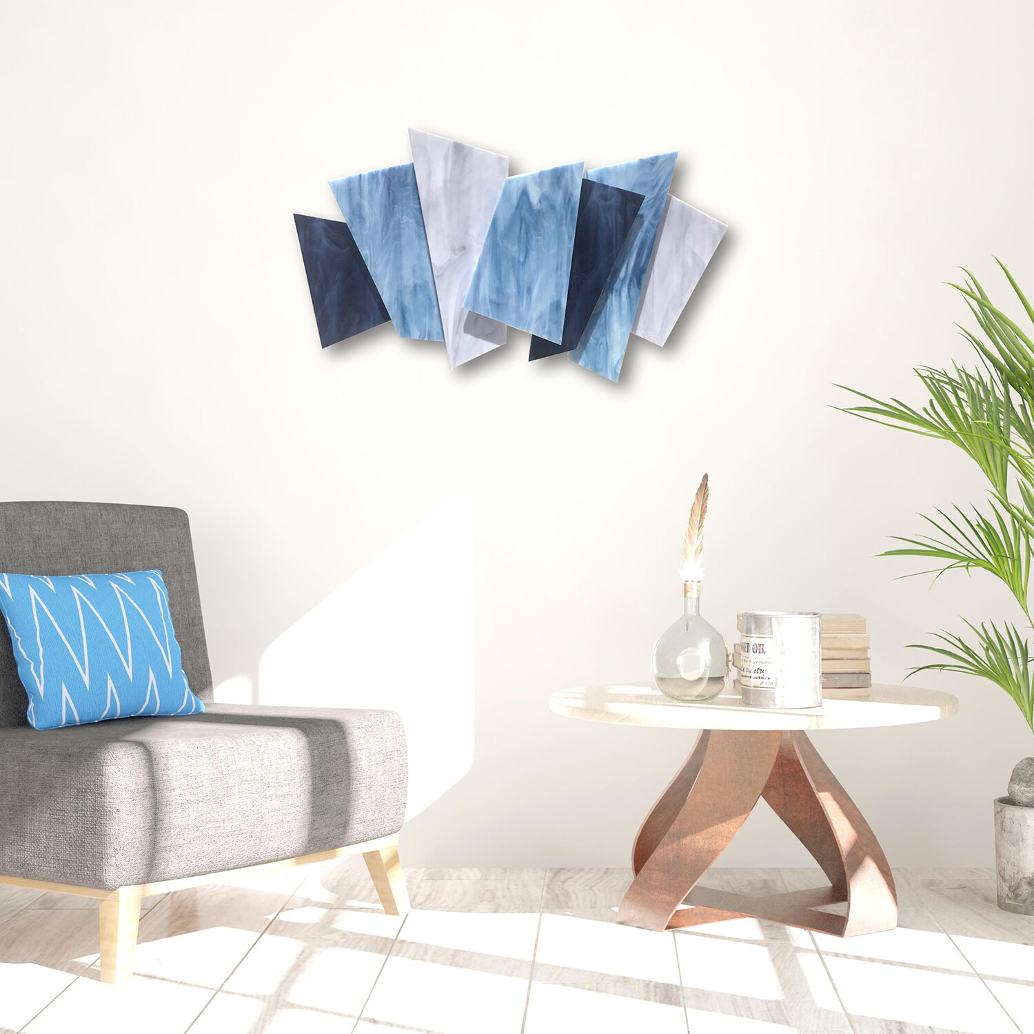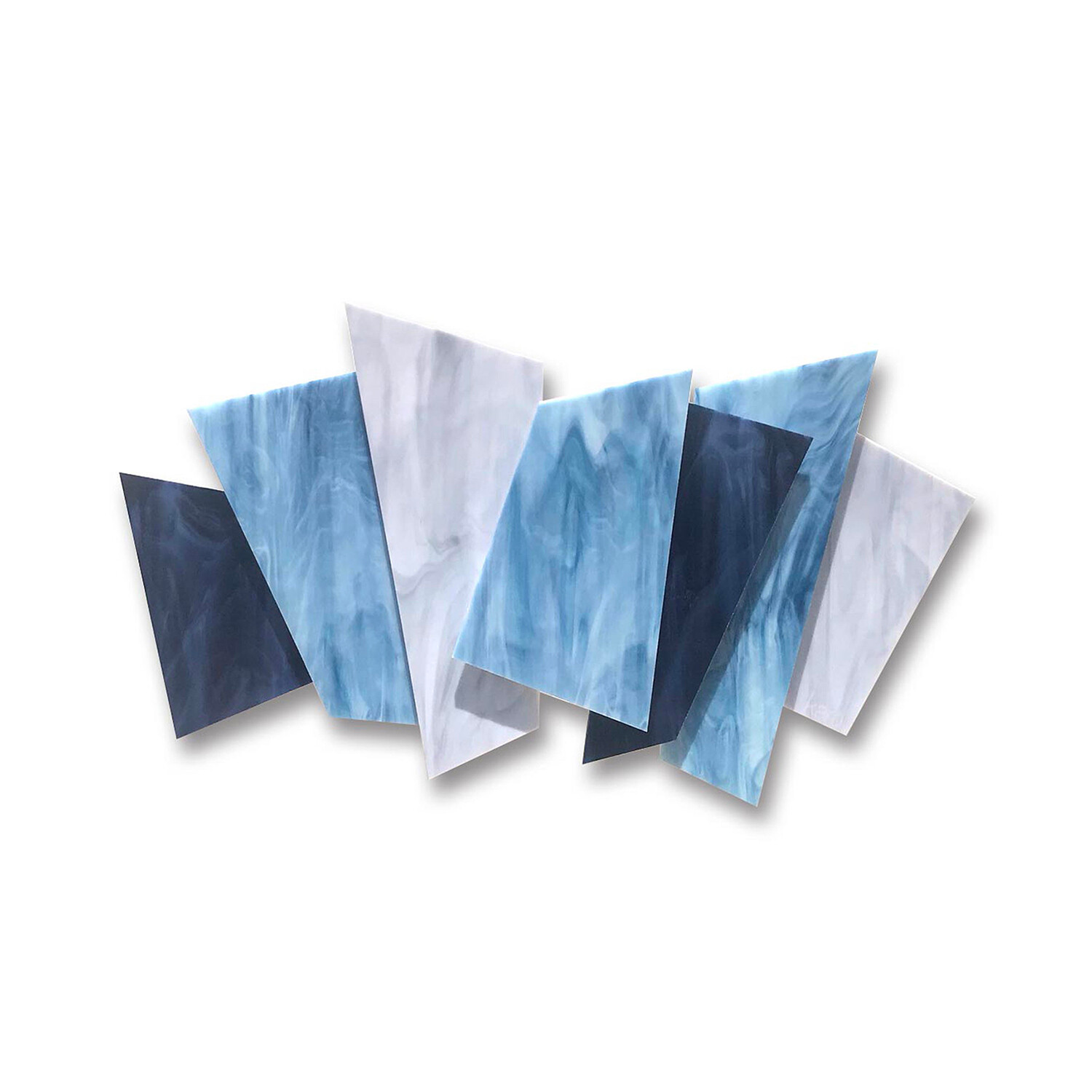 Individual pieces of glass are hand cut and placed over a welded metal frame on different elevations to create a 3D dynamic in this soothingly harmonious composition. The rear steel structure on the piece is primed and powder coated for durability, and the colors are baked inside each sheet of glass. Each piece is hand created by the artist in his studio in Los Angeles. The artist draws upon his background in architecture to find the balance and color that mark the unique aesthetic of this wall art.