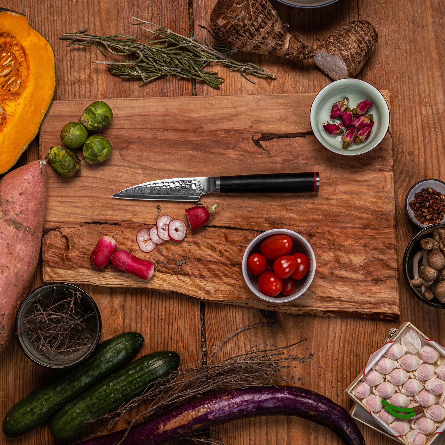 Damascus Steel Paring Knife features a 9 cm AUS-10 blade with a hybrid profile—flat edge for precision and a fine tip for detailed work. Forged from 67 layers of Damascus steel and finished with a Tsuchime pattern, it's the go-to blade for all off-the-board prep tasks.