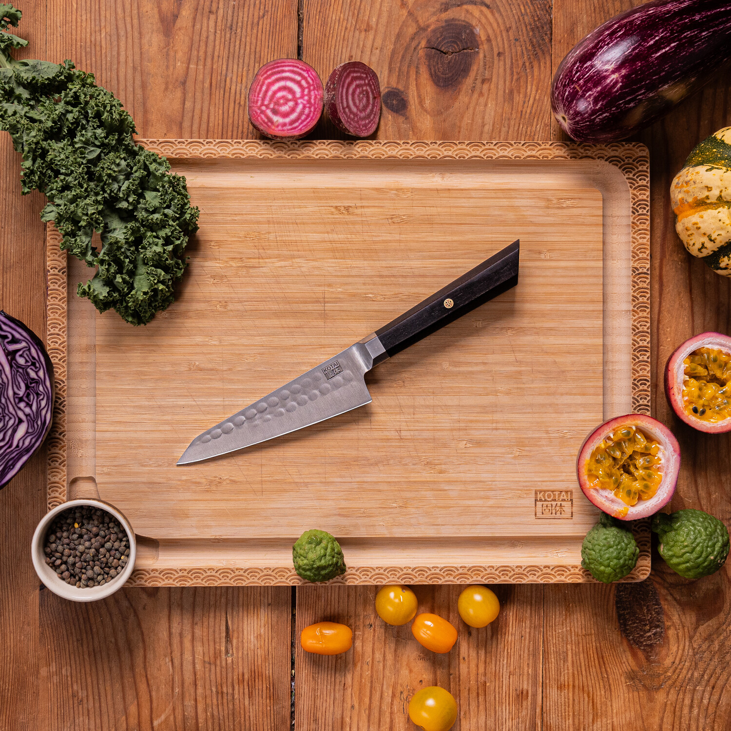 The Bunka Petty knife is the Japanese equivalent to a small utility knife. It is ideal for small and detailed cutting tasks, where a full-sized chef knife would be too cumbersome. Just like the common Petty knife, the Bunka Petty has a medium-sized blade with a flat profile; however, their blade tips are shaped very differently. Bunka knives are recognizable from their “reverse Tanto” profile, also called “K-tip”, which makes them more precise than a classic rounded blade.