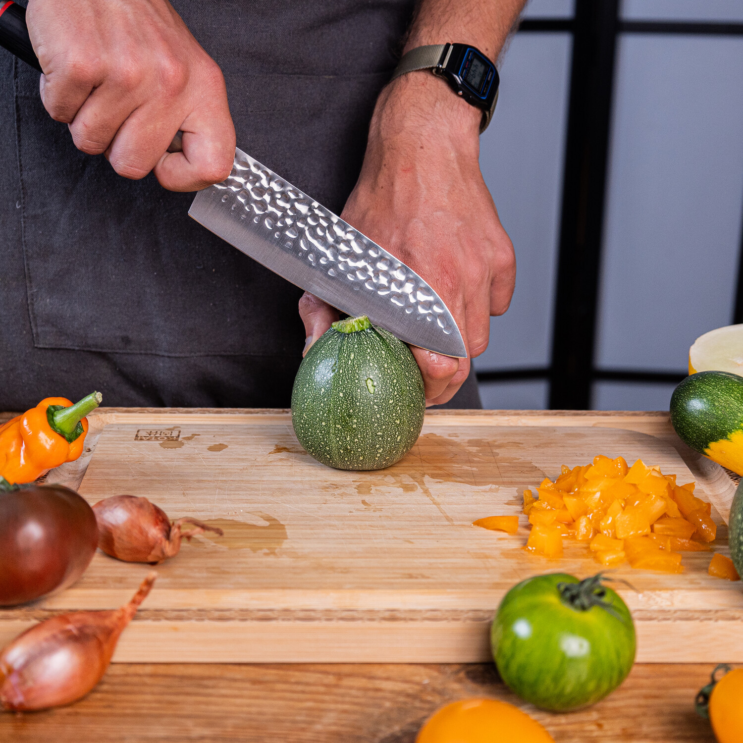 The Santoku is a Japanese all-purpose kitchen knife. The name translates to “three virtues”, a reference to its versatile blade designed to chop vegetables and fruits, slice through meats, and prepare fish with ease. The “scallops”— series of hollow-ground cavities— reduce drag so the blade glides through food more easily.