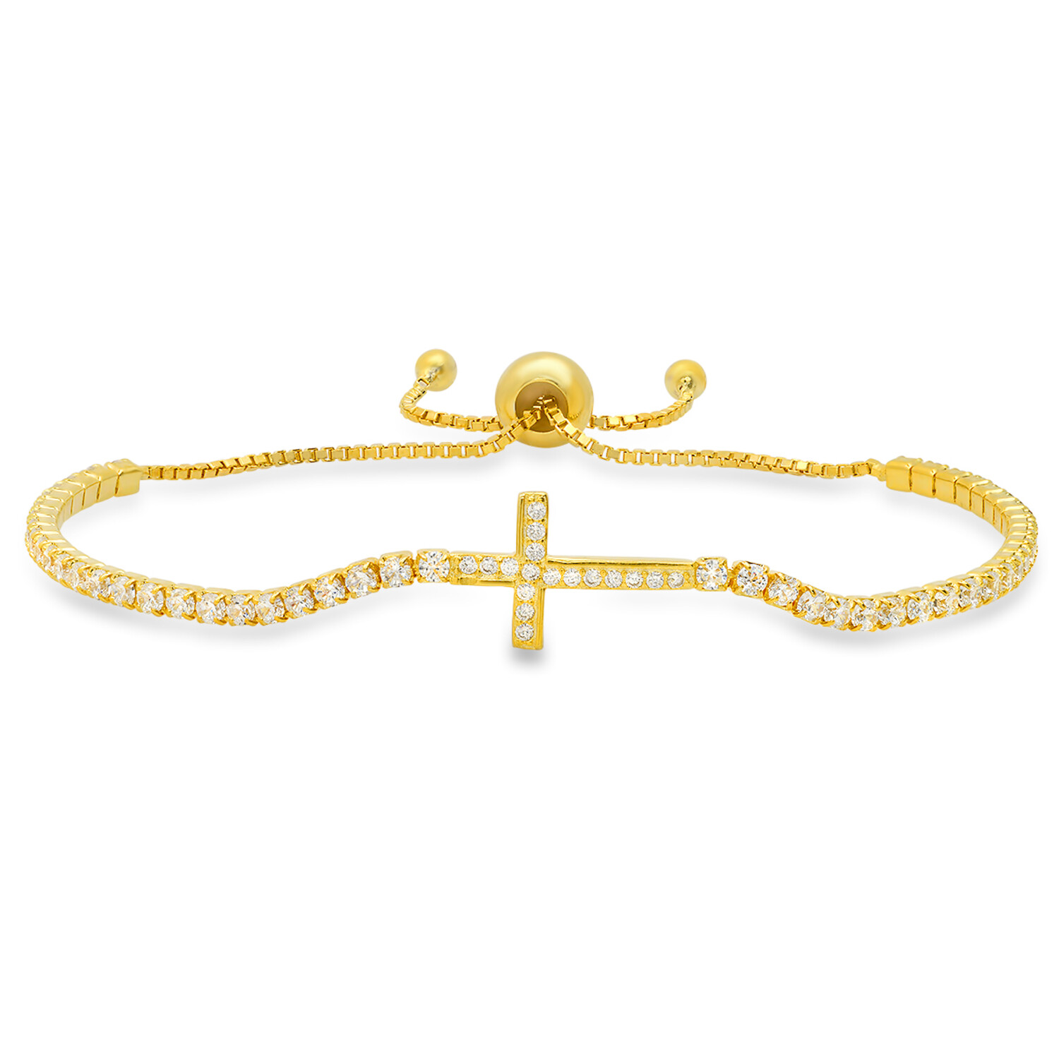 14k Yellow Gold Over Silver Petite CZ Cross Adjustable Bracelet