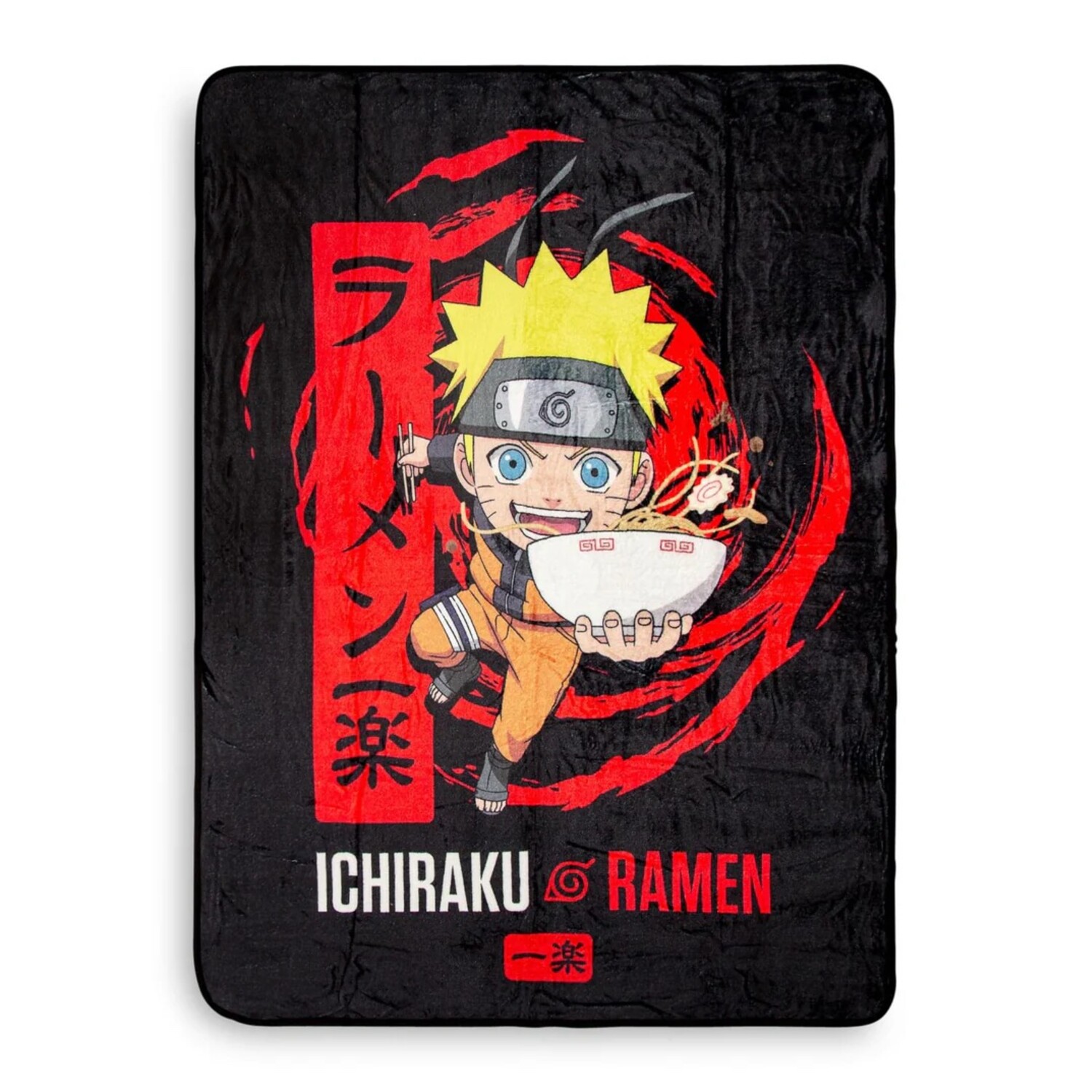 YOUR NEXT ANIME MARATHON JUST GOT COZIER: Watch all your favorite episodes while cuddled up in this black throw blanket. Naruto Uzumaki is featured in chibi form holding a bowl of Ichiraku Ramen noodles.