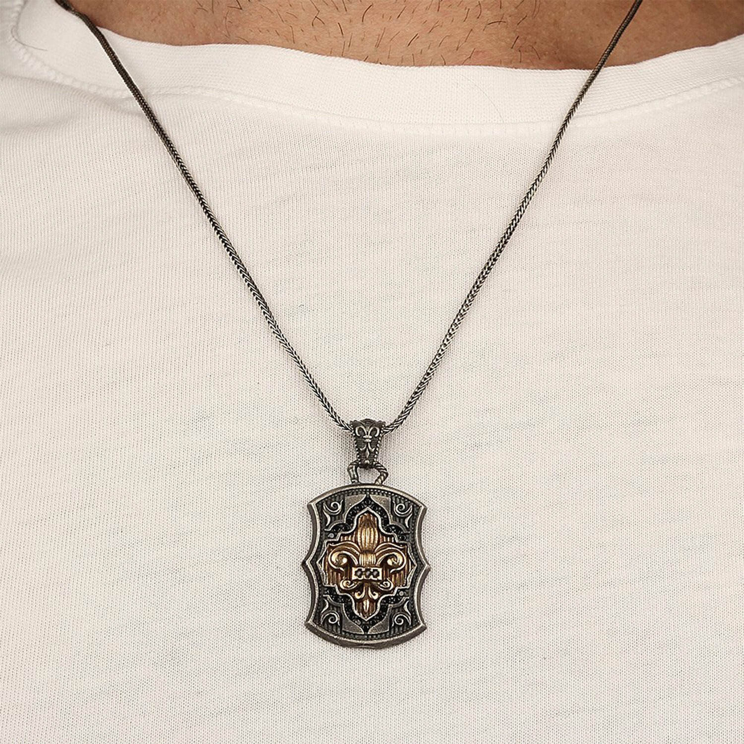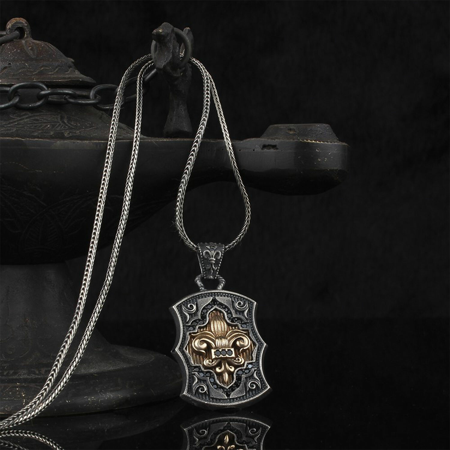 925 Sterling Silver Black Zircon Stone Fleur-de-lis Necklace V1