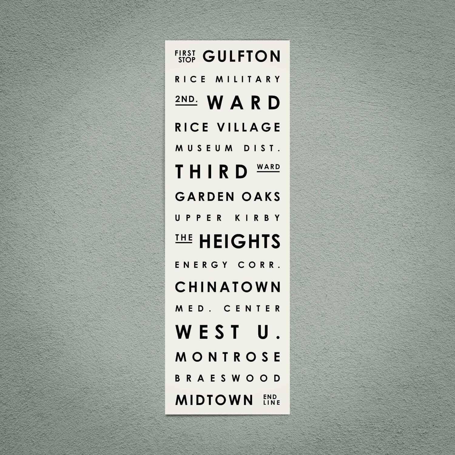 Celebrate your city with this modern typography art print featuring its unique neighborhoods. At 12" x 36", the long, vertical format makes a bold statement, perfect for brightening a hallway, or anchoring a gallery wall.