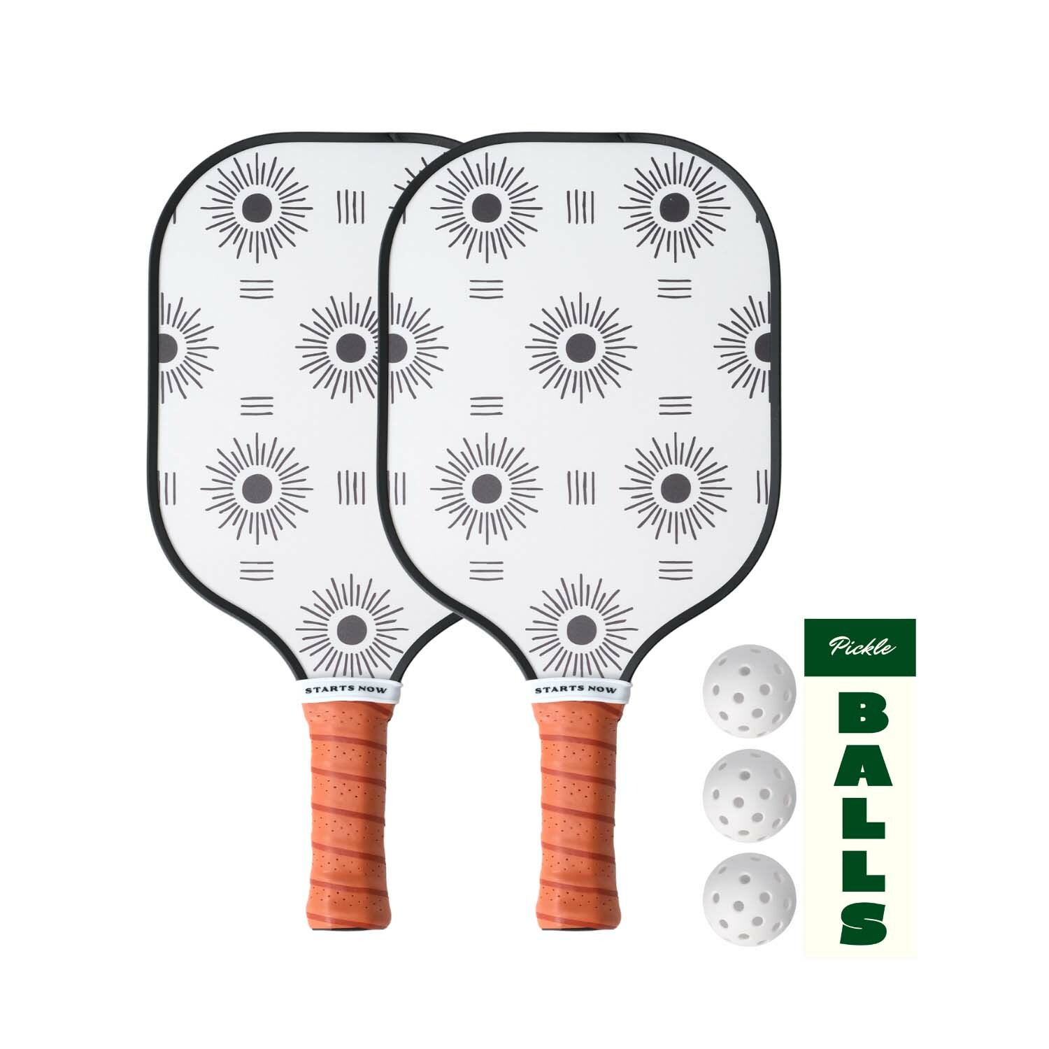 This two paddle pickleball set is built for consistent play and dependable feel across long sessions. Durable fiberglass paddle faces deliver balanced pop and forgiveness, while the sturdy honeycomb core keeps shots stable through quick exchanges. An assembled edge guard helps protect the paddle during aggressive net play. Finished with custom brown grip tape made from condensed foam, each handle manages sweat and stays secure when rallies speed up. Paired with three durable balls, the set is ready for warmups, doubles matches, and extended court time.
