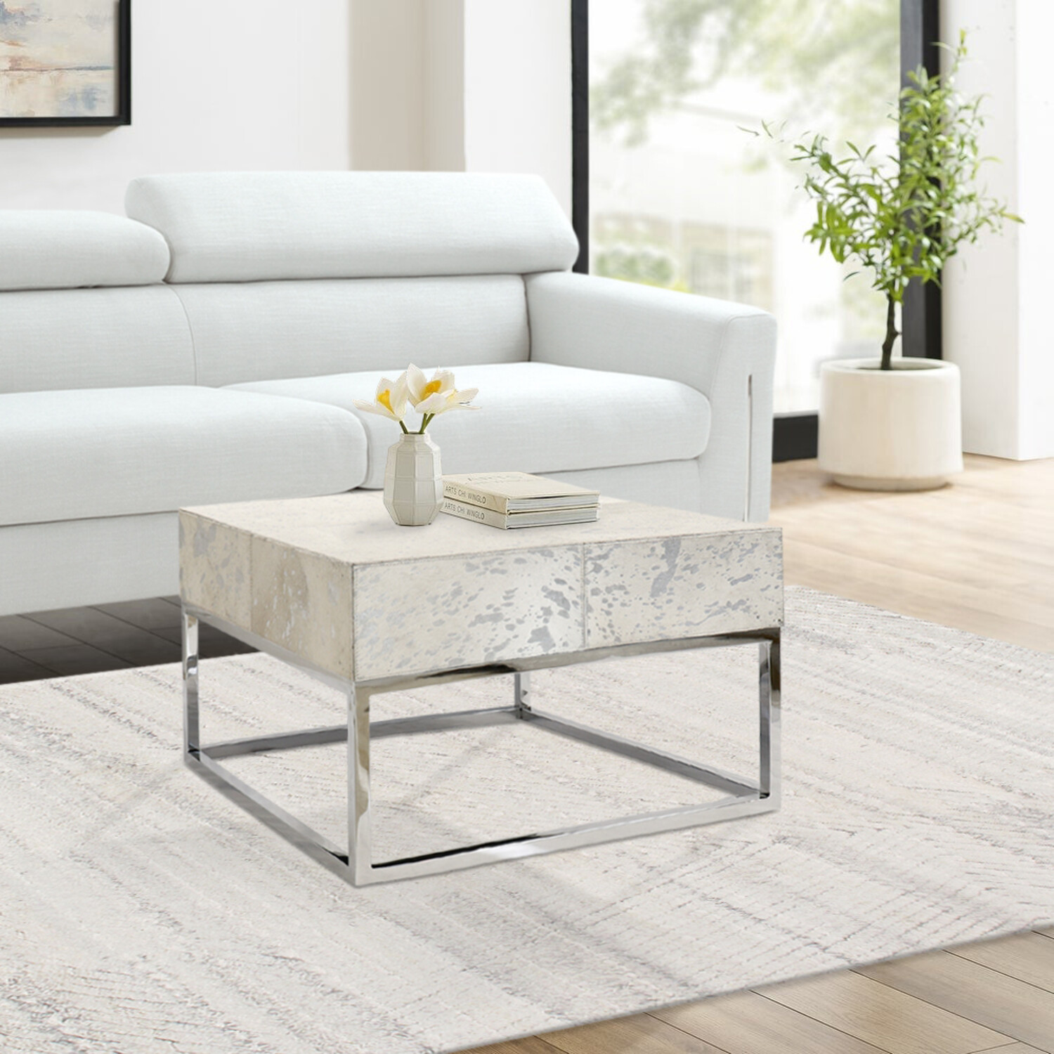 Safari Silver Foil Cowhide & Steel Coffee Table // Silver