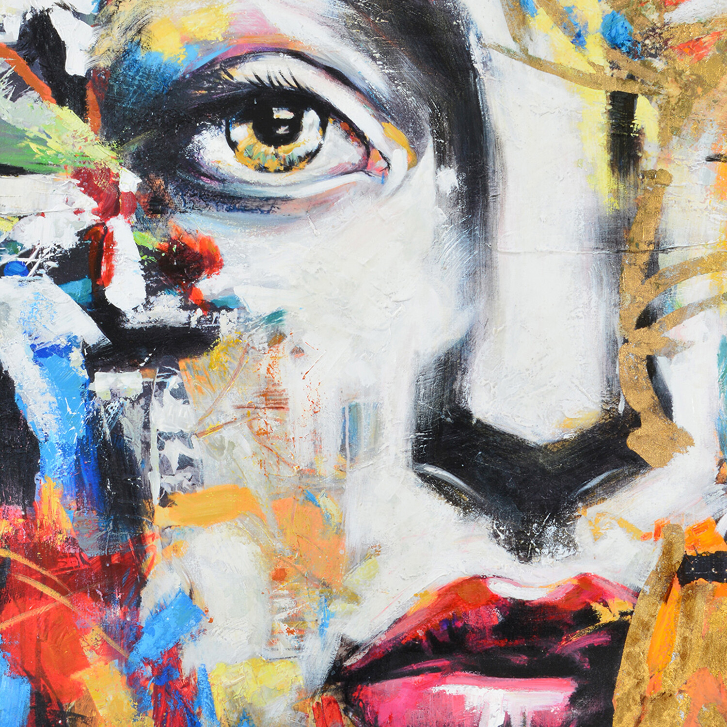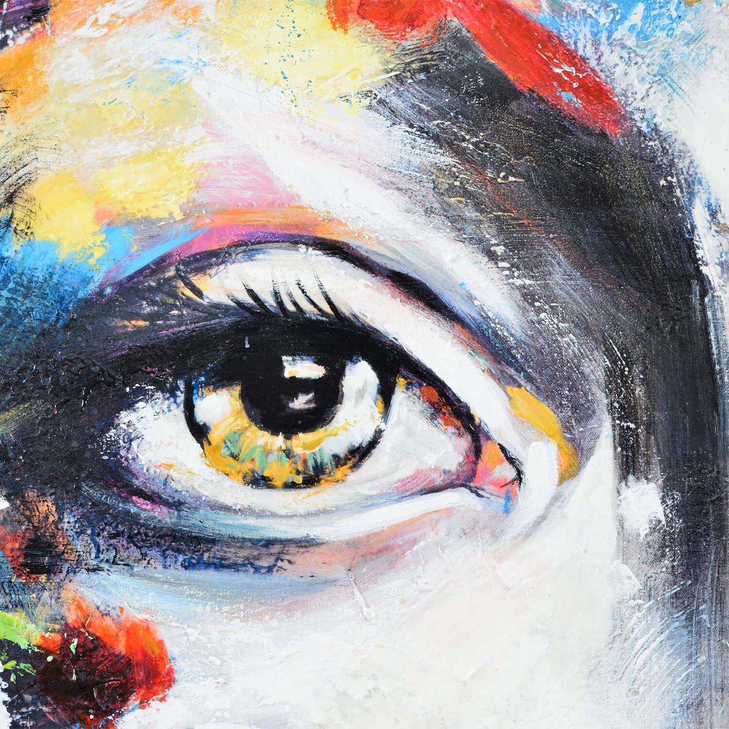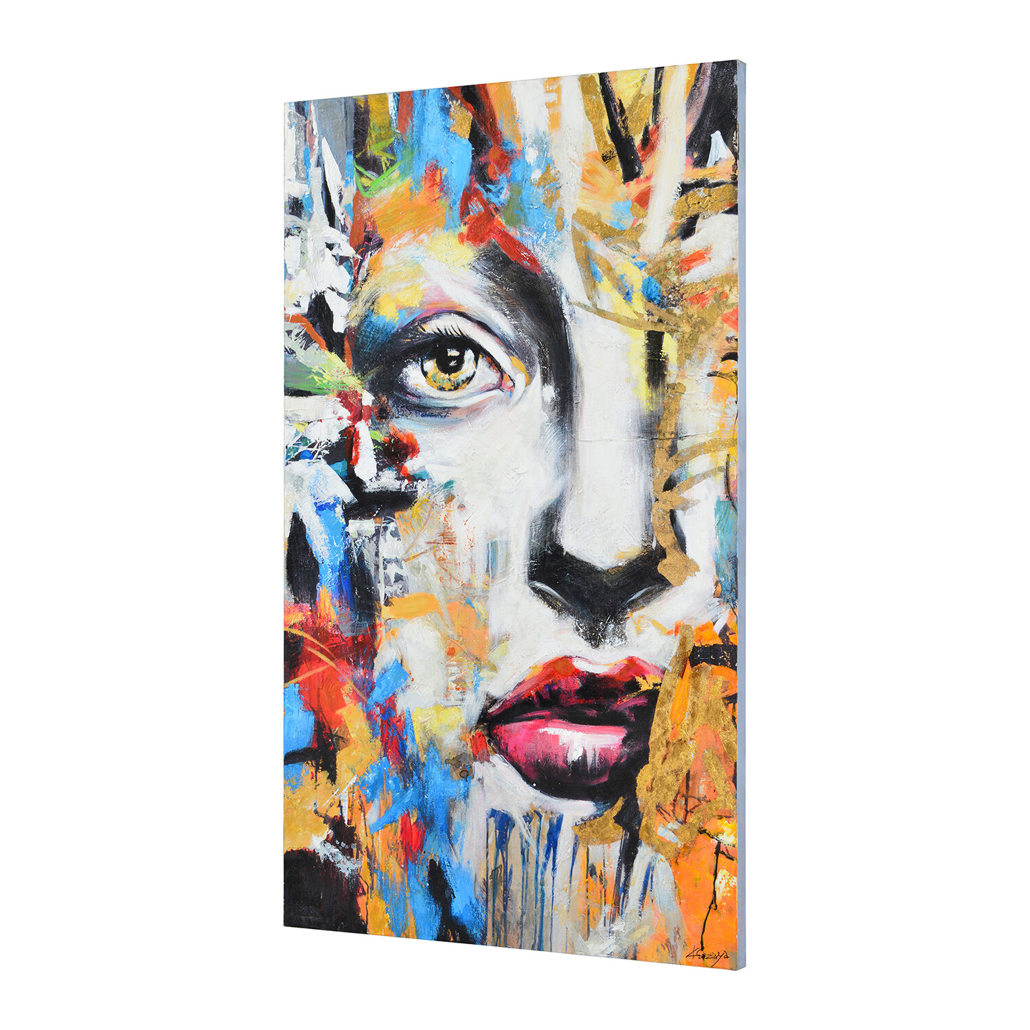 From the full, pink lips to sultry yellow stare, this undeniably feminine artwork is a colorful representation of strong women everywhere. Peering through a confetti of blue, red and gold brushstrokes, the black and white portrait creates an alluring profile with a spot gloss accents for luxe luster. The unframed painting on canvas is a captivating element of accent art for modern interior walls.