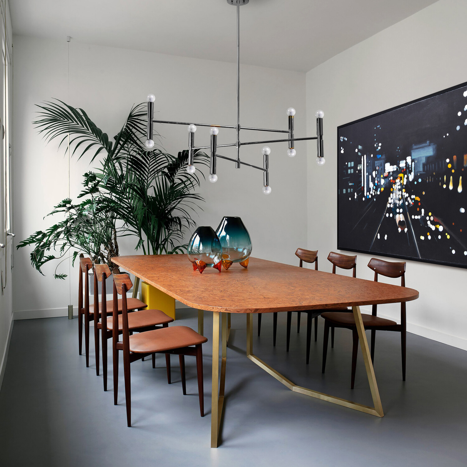 Gold-plated steel bars radiating from a center post make up the simple beauty of the Axis ceiling fixture.