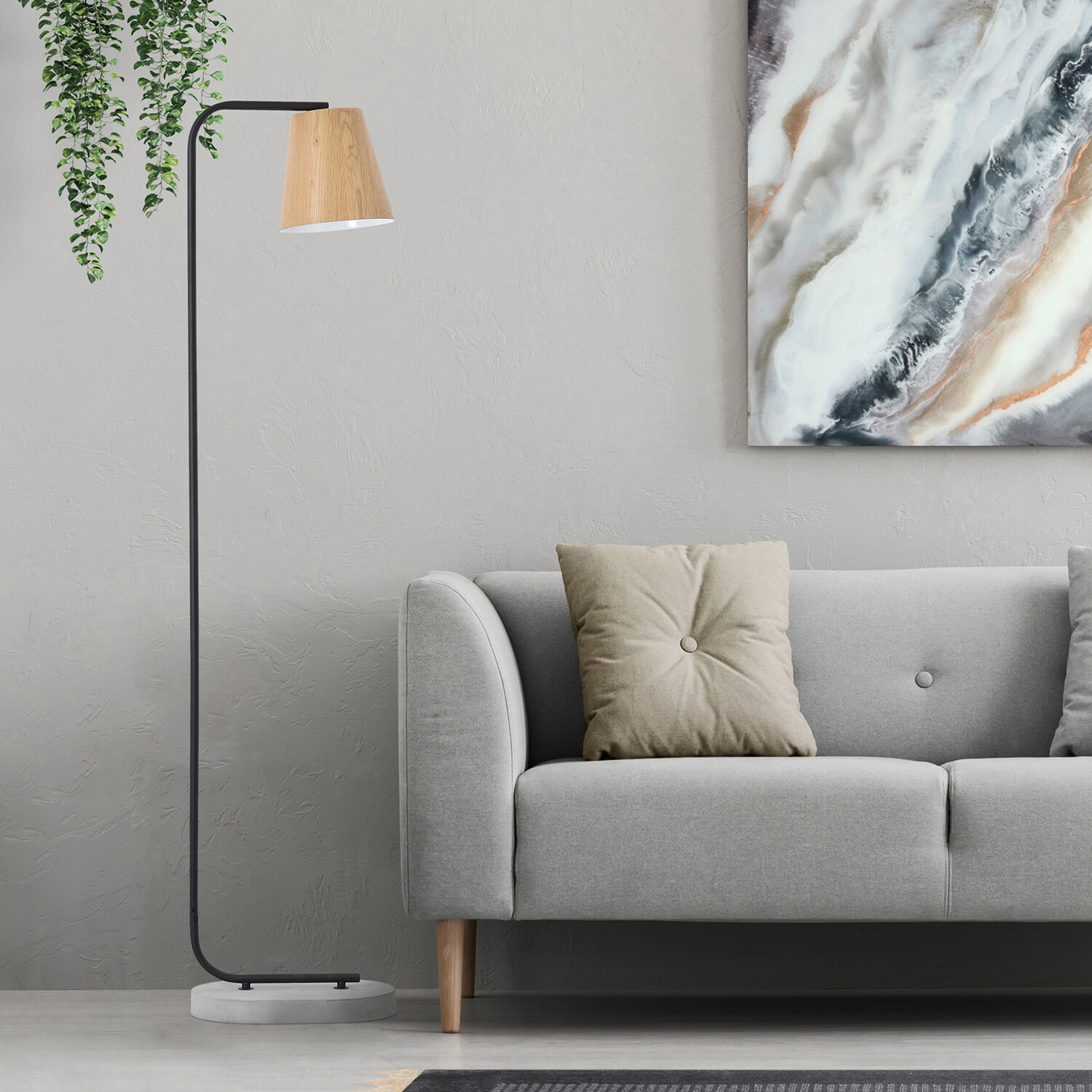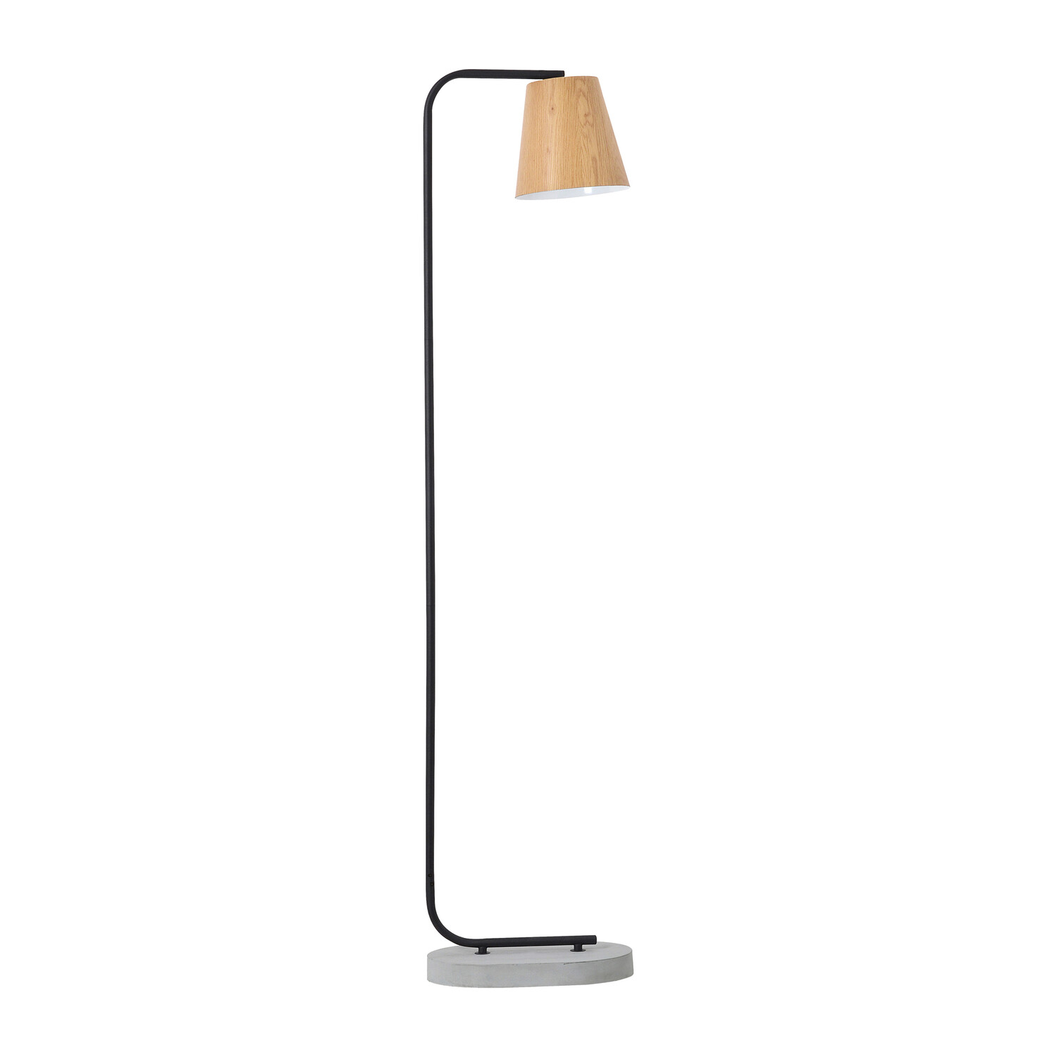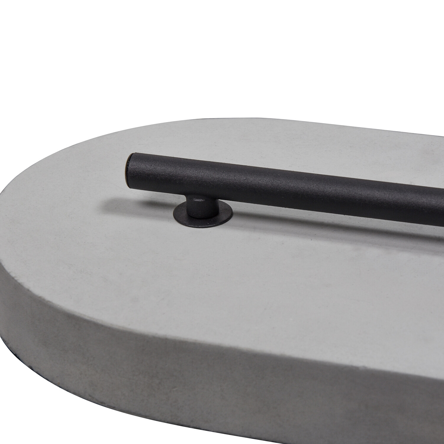 This floor lamp brings a warm glow to the living room. The calming palette and smooth arches of the design permeate the interior, adding a relaxed feeling to the space. The soft tone of the concrete base is balanced beautifully by the textured black steel.