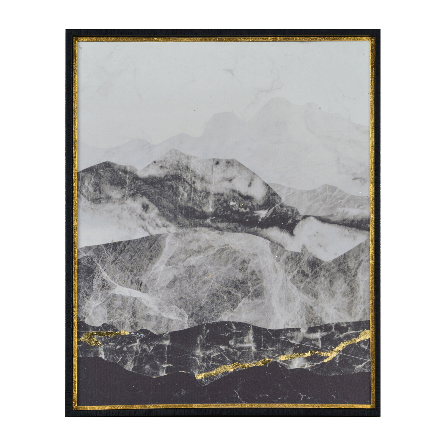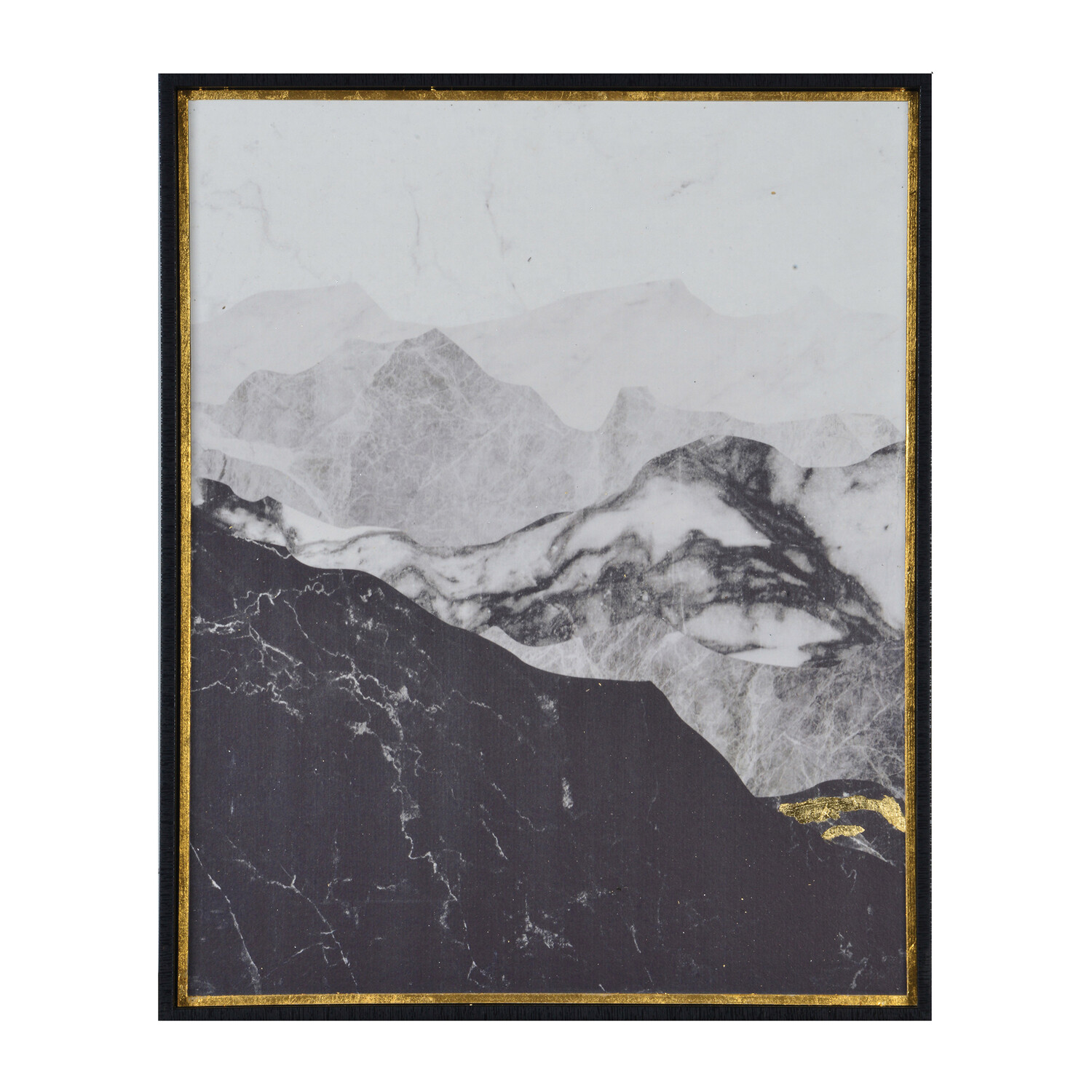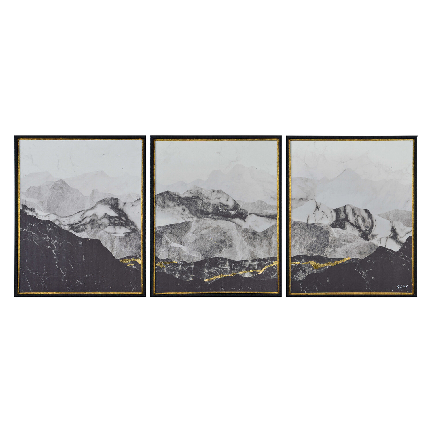 A decorative triptych for the decidedly glam, this set of three fine art prints capture an icy mountainside in graphic black and white. The dramatic mountain range image is split into three, each panel portraying the raw veining of natural stone and rocky landscape in striking detail. An awe-inspiring accent for traditional interiors, the fine art photography series gets a glitzy touch with the help of gold leaf accents.