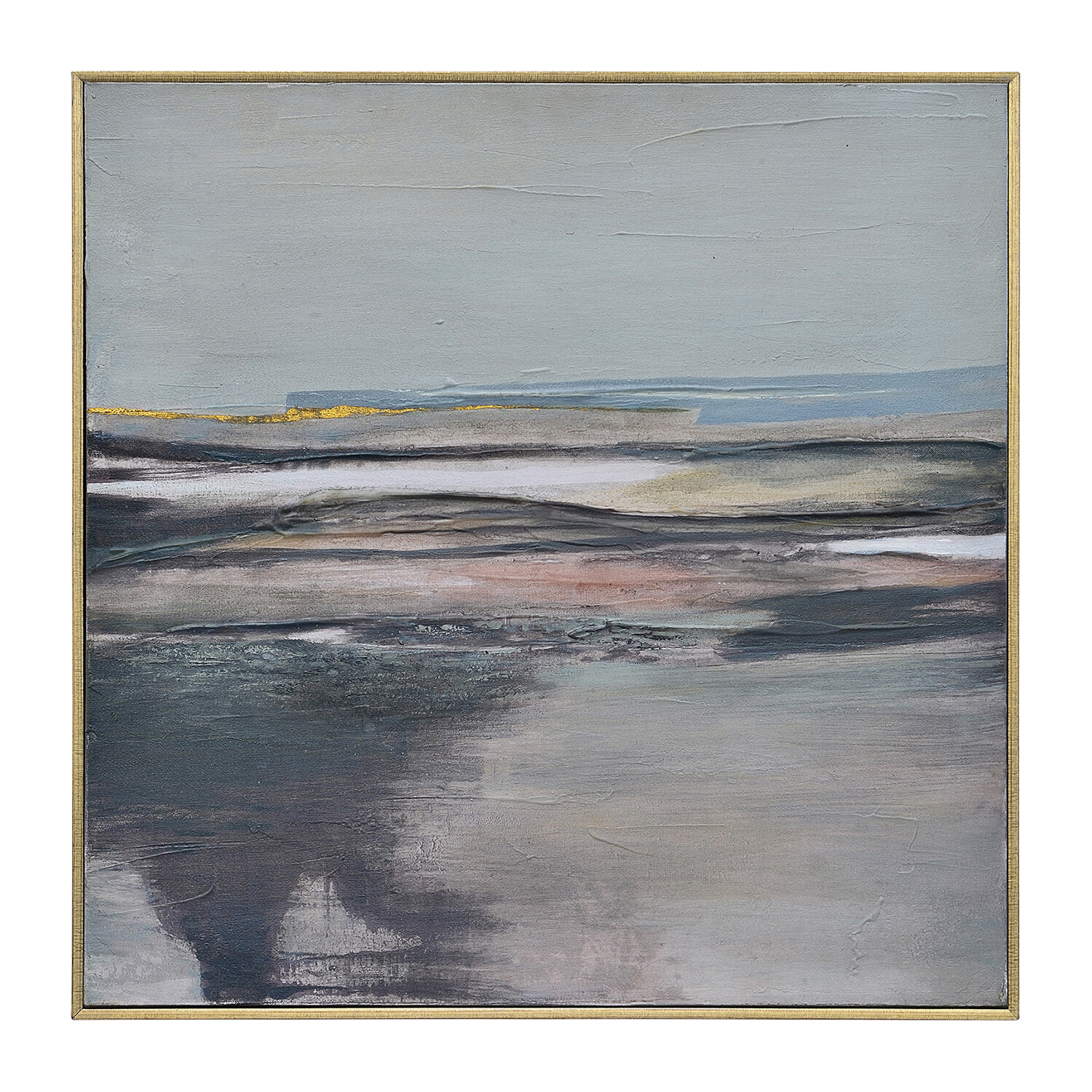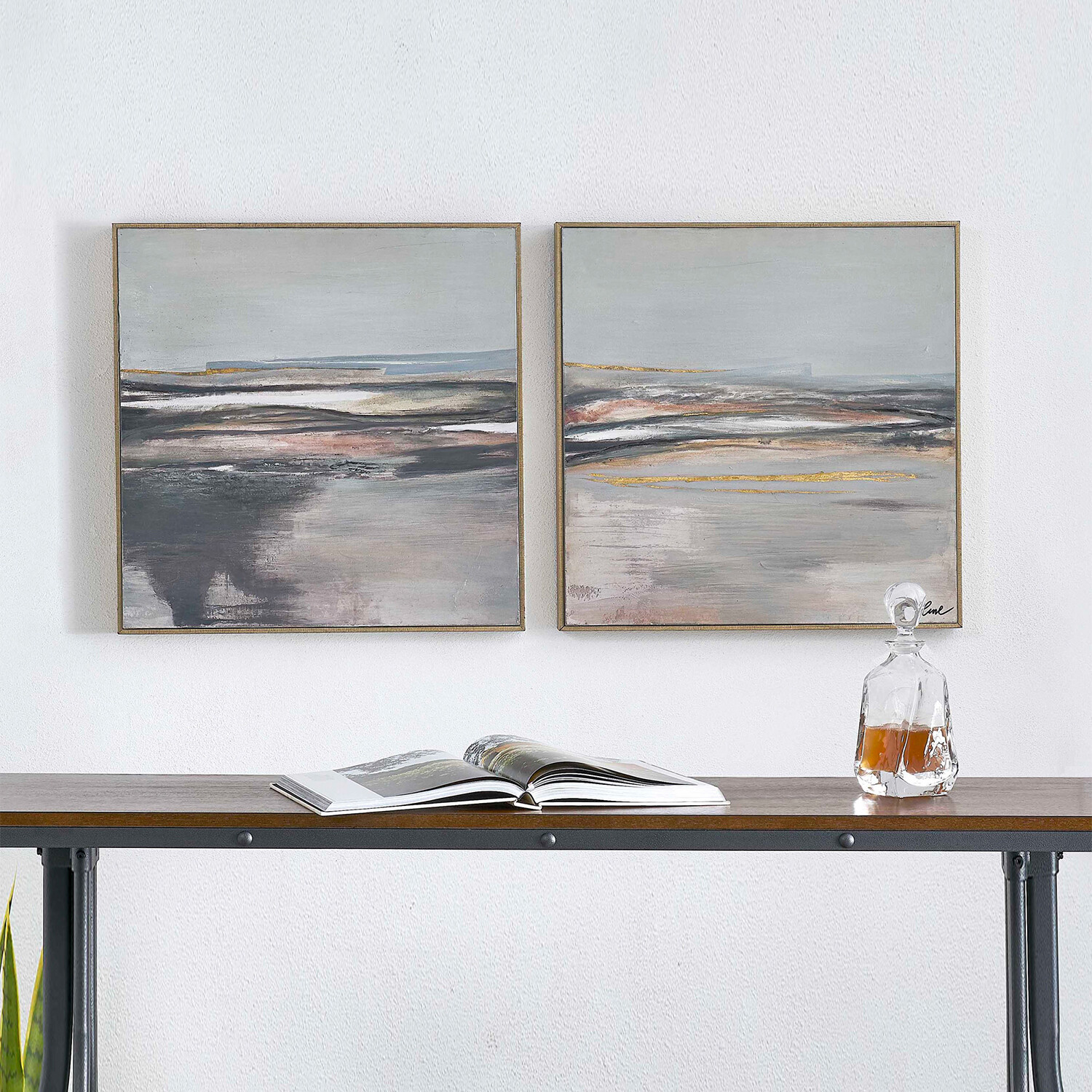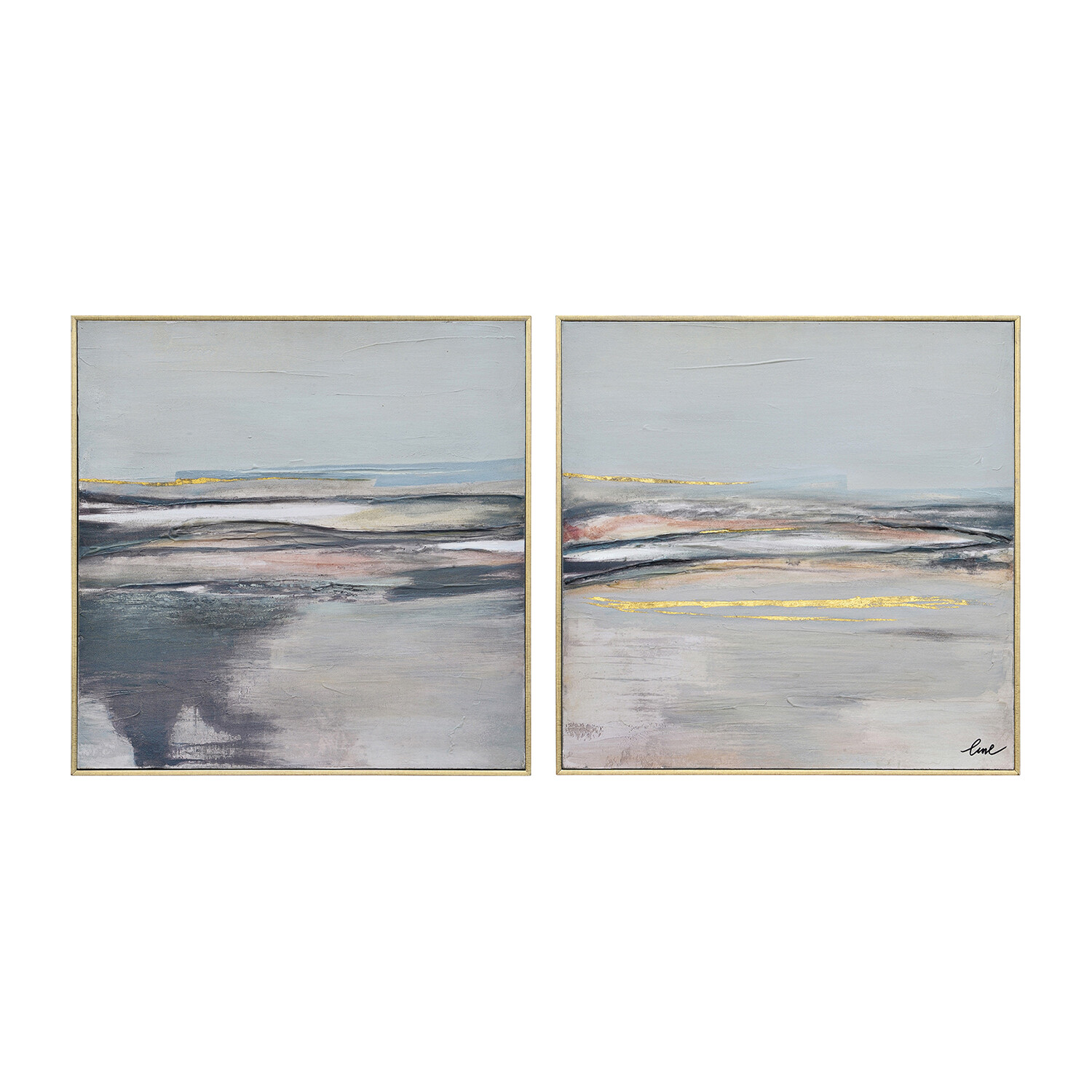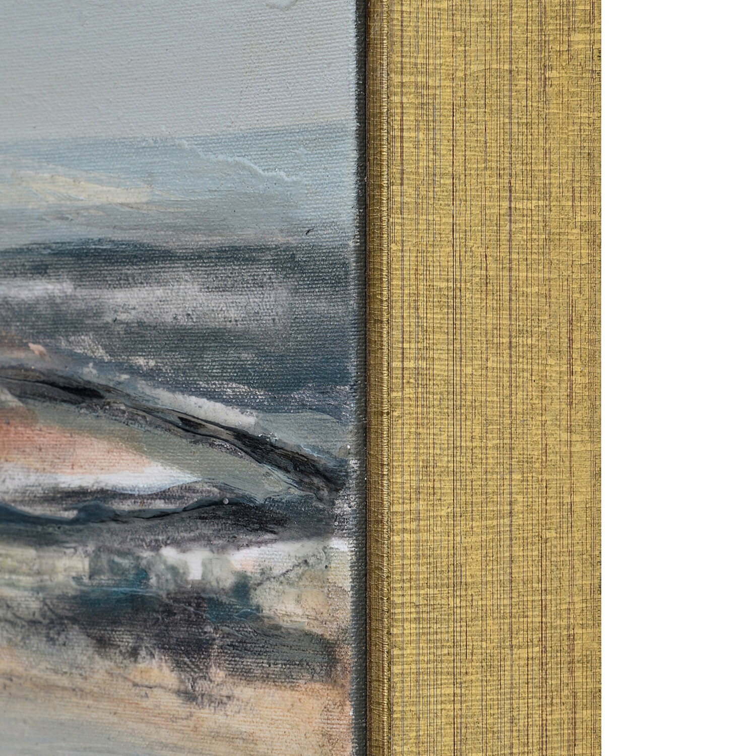 A set of two cotton canvas paintings allows for the classic interior to absorb the picturesque vision of a seaside landscape. A myriad of deep dark grays, soft pale blues, warm rosy tones, and gold leaf details, this work of art strikes the ideal balance of complexity and cohesiveness. Whether contrasted by bold dark paint tones or highlighted by stark white, it can't help but create the tone for the space.
