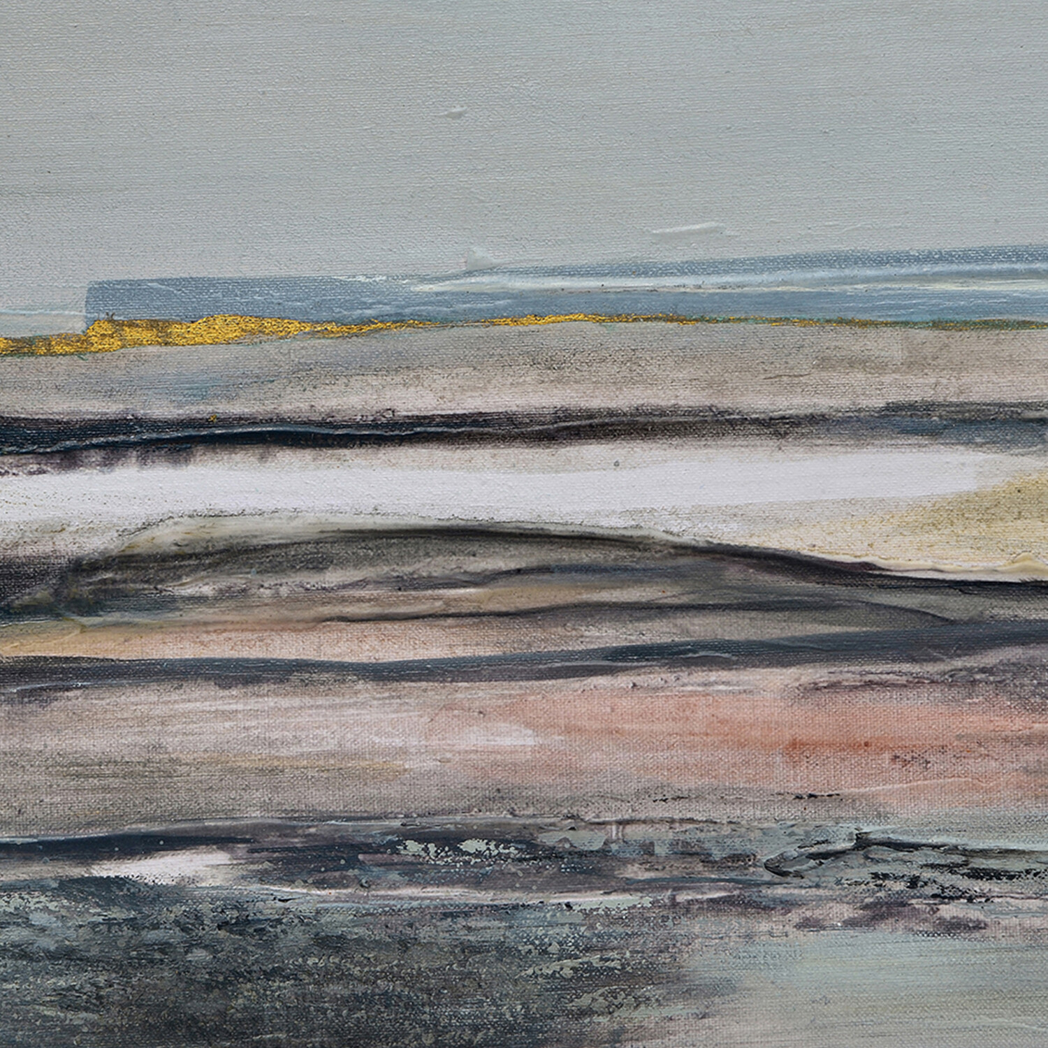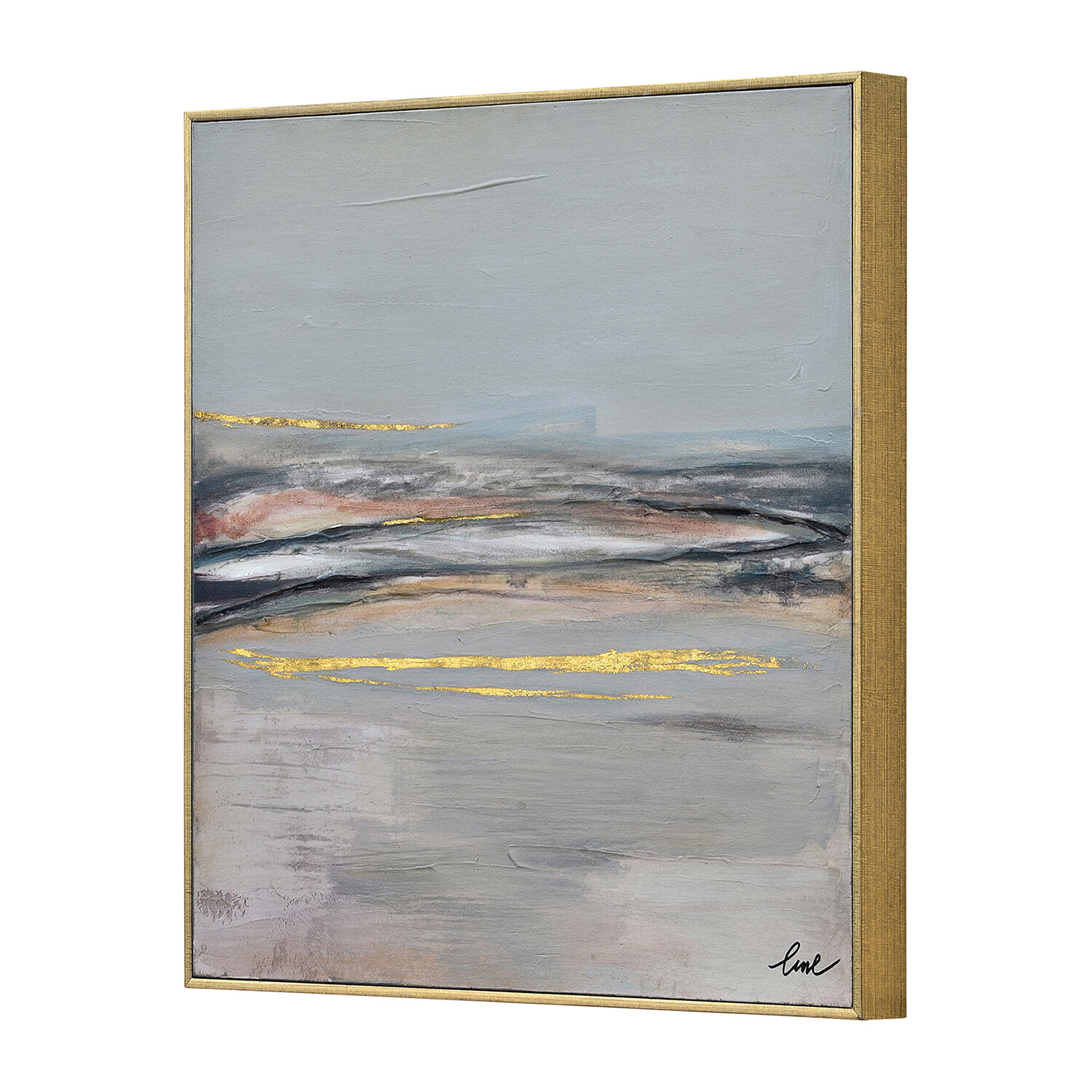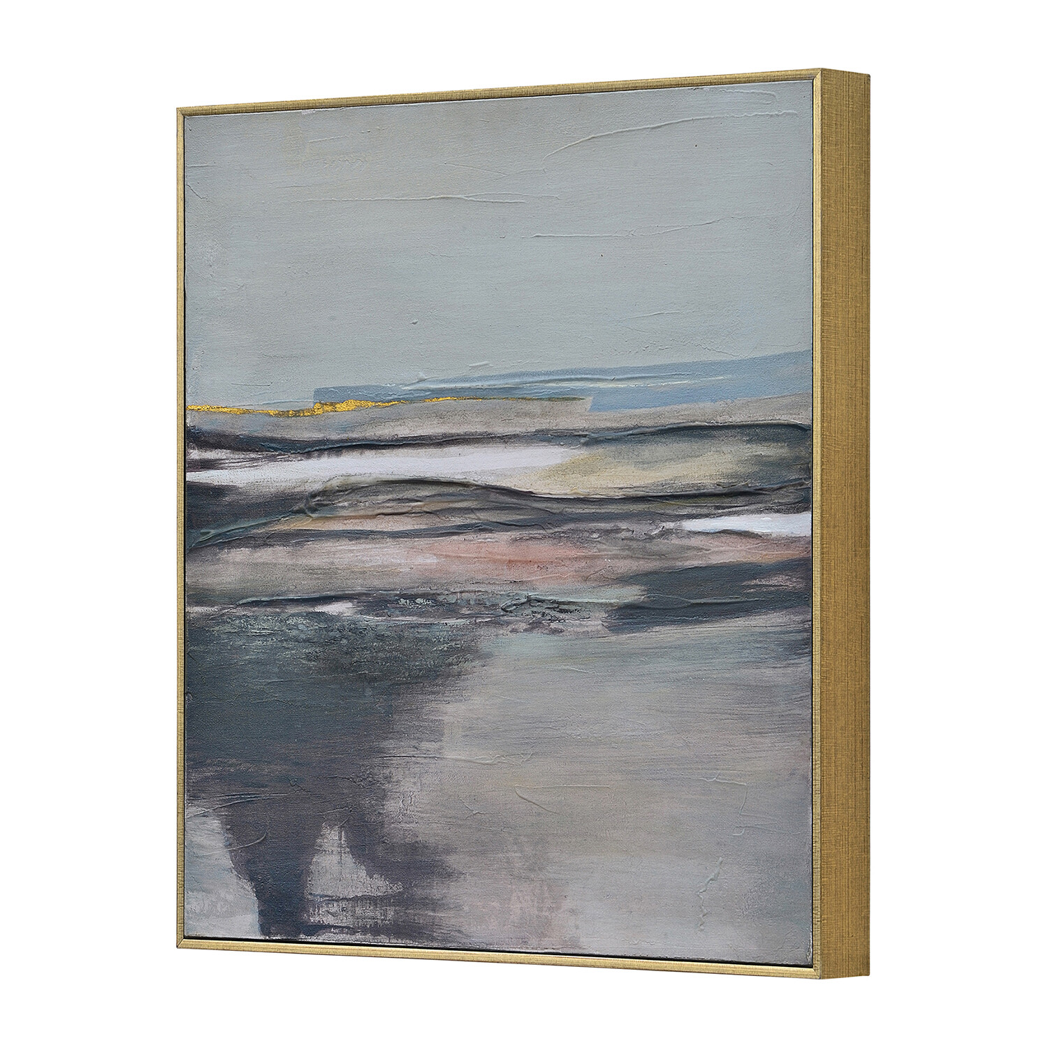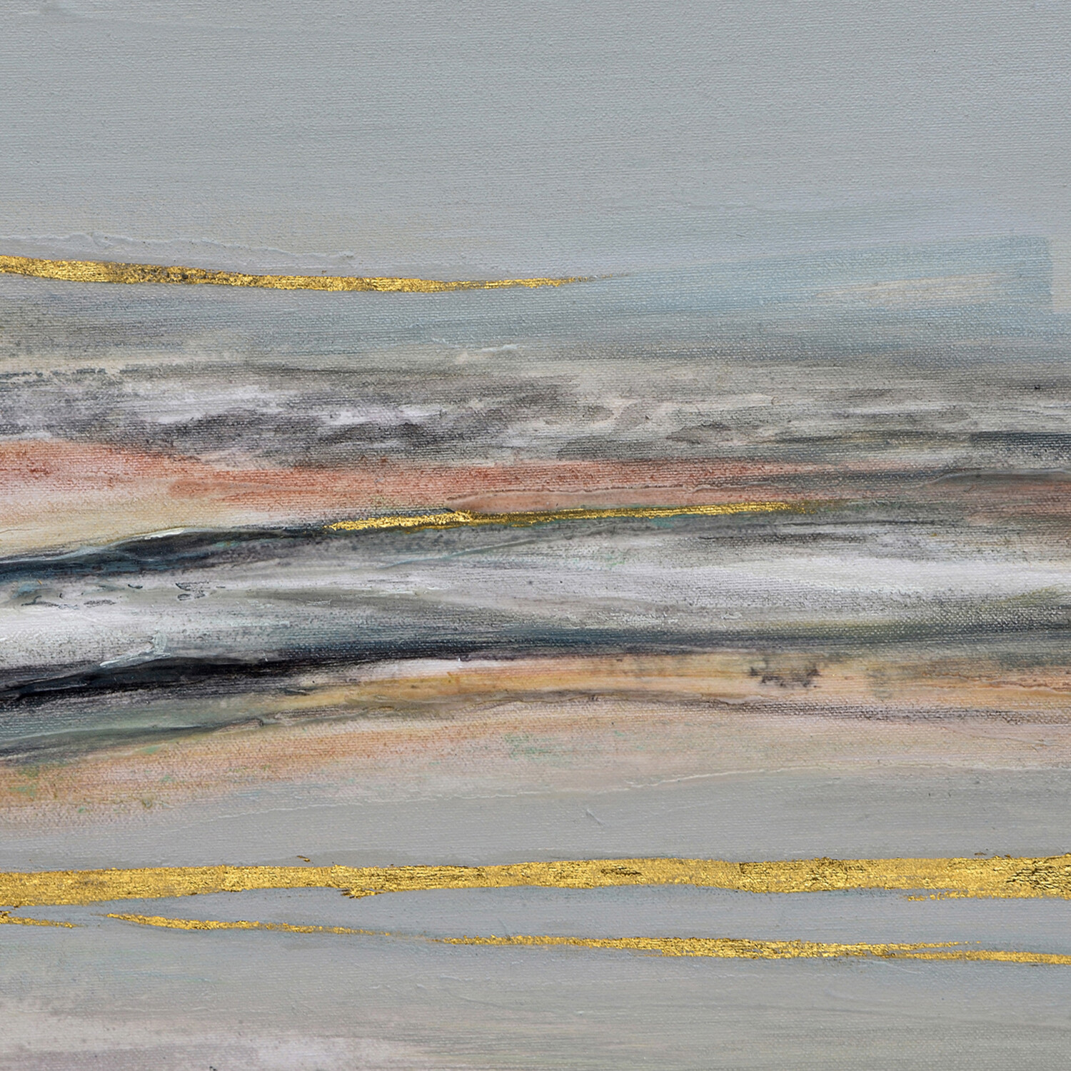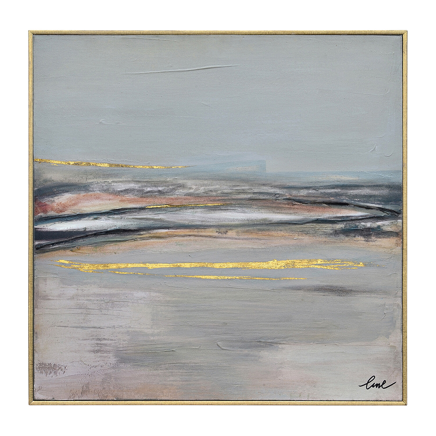 A set of two cotton canvas paintings allows for the classic interior to absorb the picturesque vision of a seaside landscape. A myriad of deep dark grays, soft pale blues, warm rosy tones, and gold leaf details, this work of art strikes the ideal balance of complexity and cohesiveness. Whether contrasted by bold dark paint tones or highlighted by stark white, it can't help but create the tone for the space.