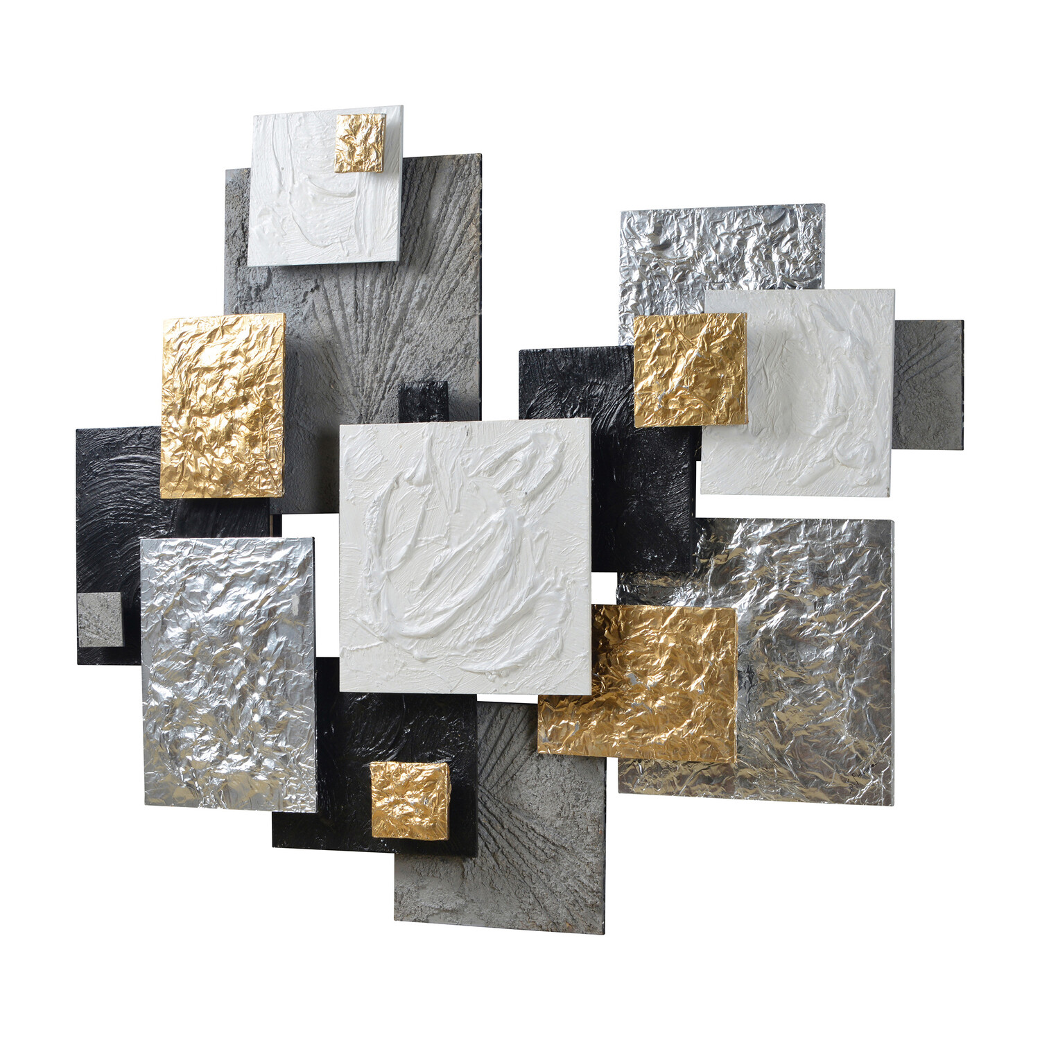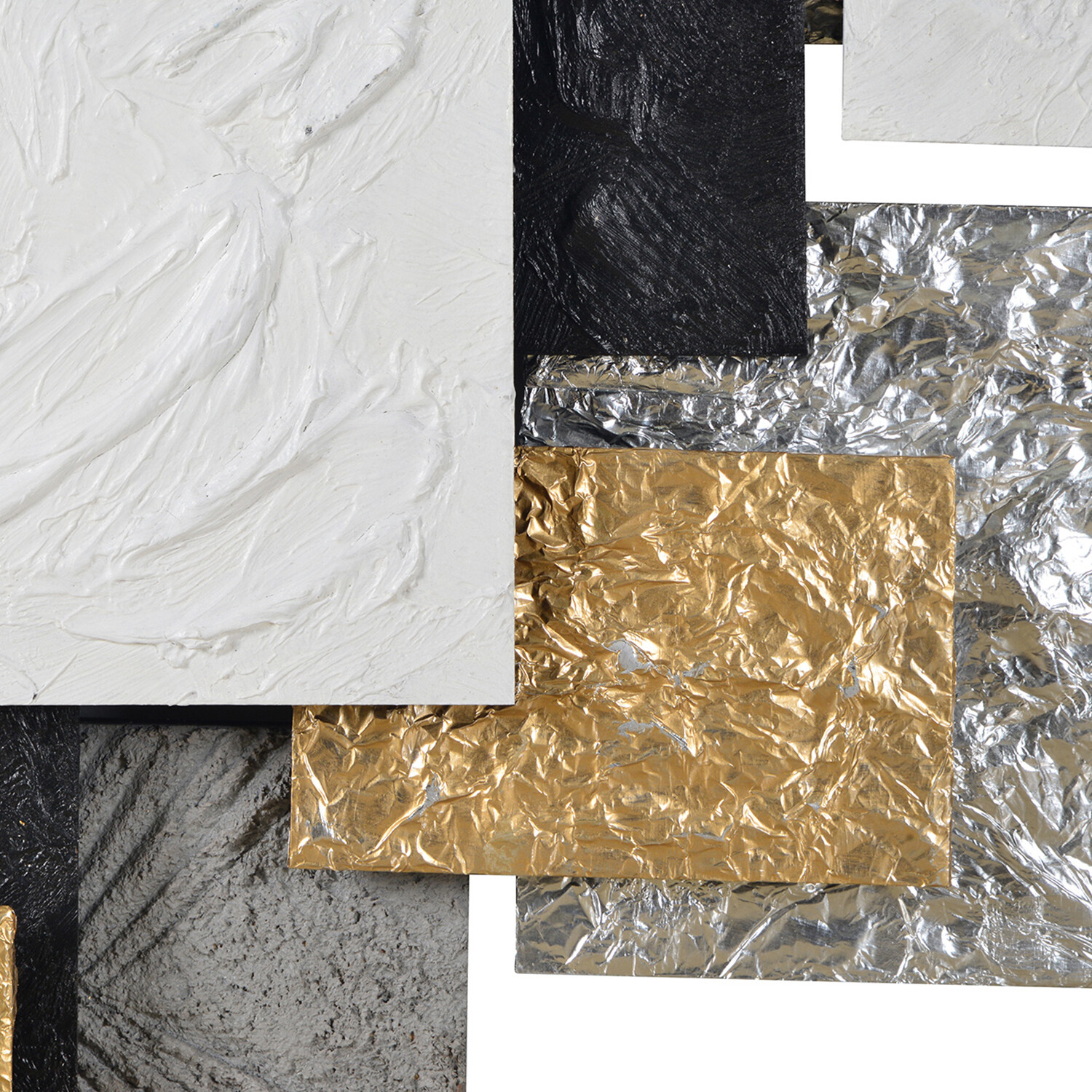 Overlapping squares form the graphic design of this modern wall decoration with geometric gestures. With a sculptural relief that resembles molten metal, the industrial-style art piece features silver and gold leaf details and gel accents that give each square a crinkled surface texture. The decorative art accent offers instant visual impact installed as the focal point on a feature wall.