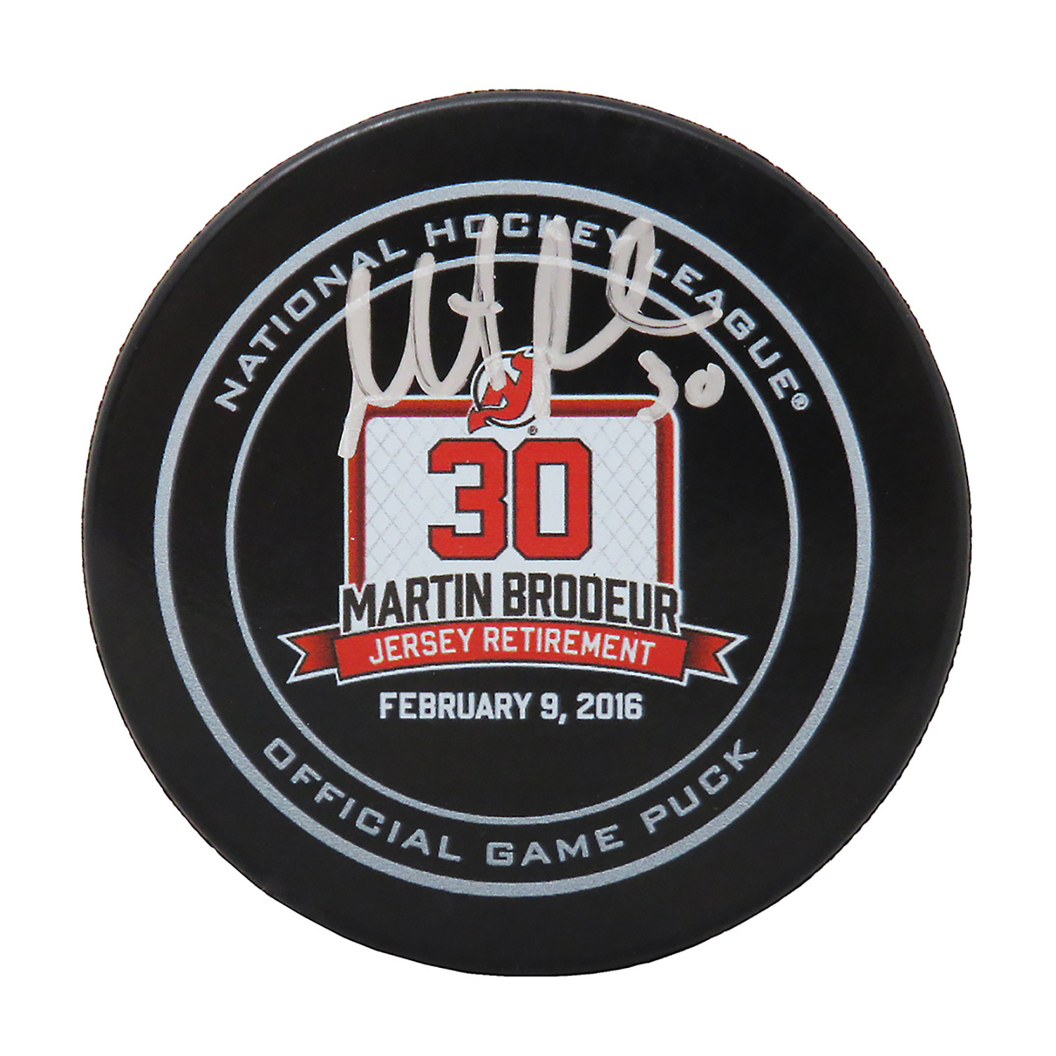 Martin Brodeur // New Jersey Devils // Signed Official Hockey Puck From February 9, 2016 Jersey Retirement Night