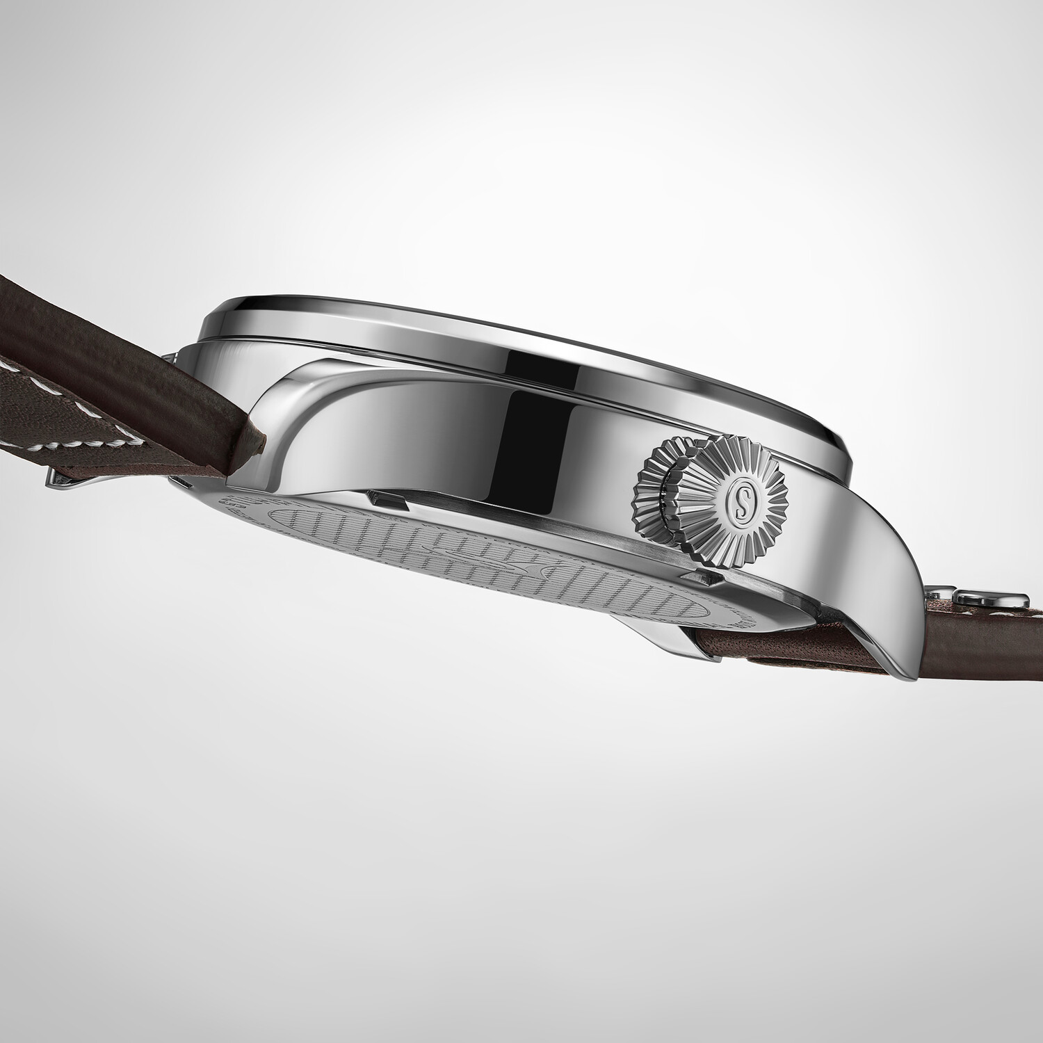 Silver-tone alloy case, Onyx black sunray dial, luminous sword hands, Arabic numerals, mineral crystal, date at 3 o'clock, brown riveted leather strap, tang buckle, quartz movement, 50M water resistance.