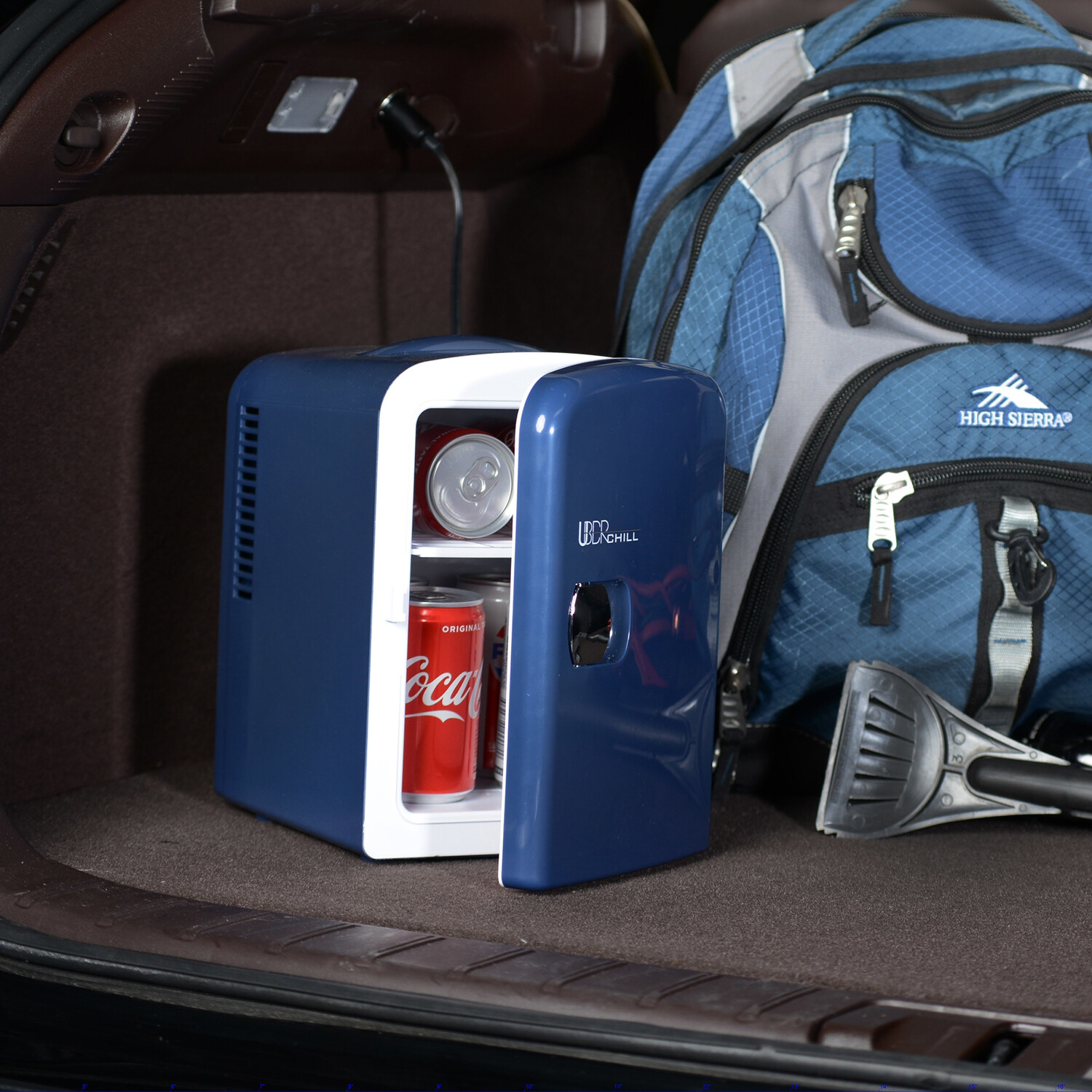 Perfectly sized for bedrooms, dorms, the office, your car, boat, RVs, and so much more, the Uber Chill is a retro-style beverage cooler that keeps drinks and snacks close at hand. Place it on your desk, store refreshments by your bed, or bring it along on the road! This compact fridge can hold up to 6 standard cans or 4 bottles, complete with a removable interior shelf for enhanced organization and a self-locking recessed door handle.