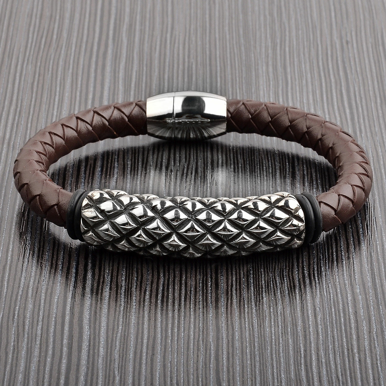 Textured Stainless Steel Accent + Brown Leather Cuff Bracelet // 8.5"